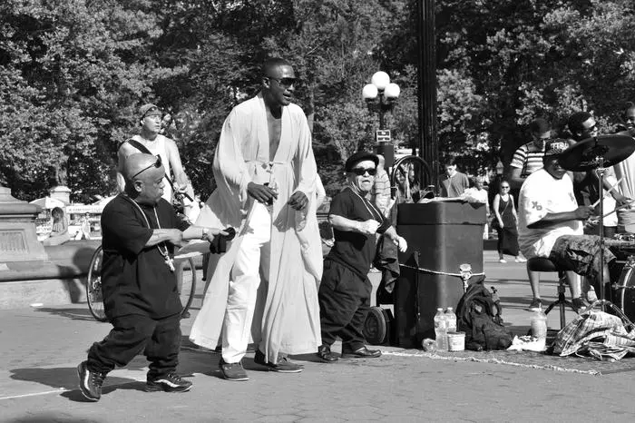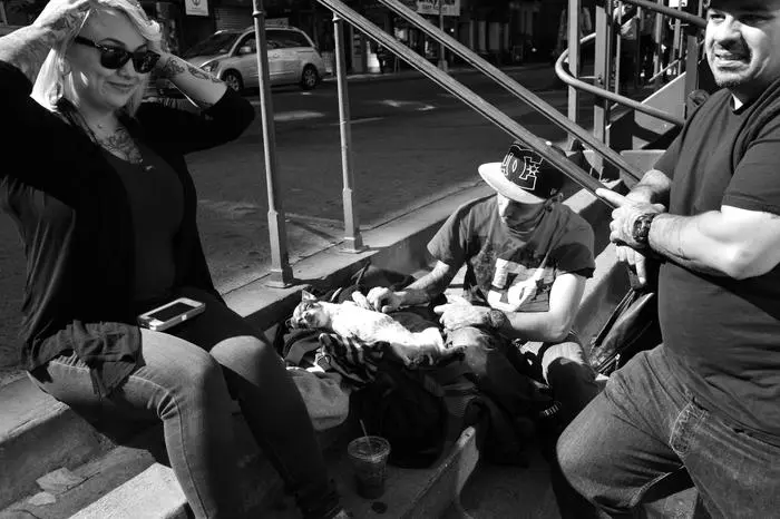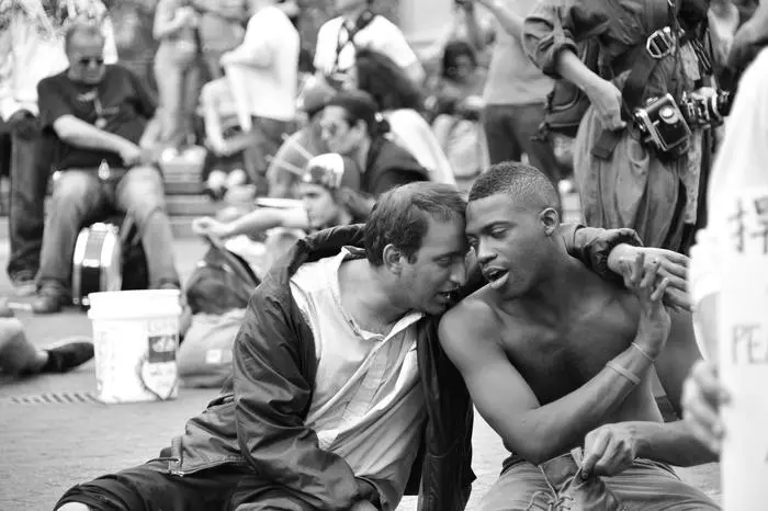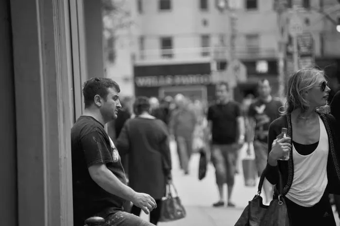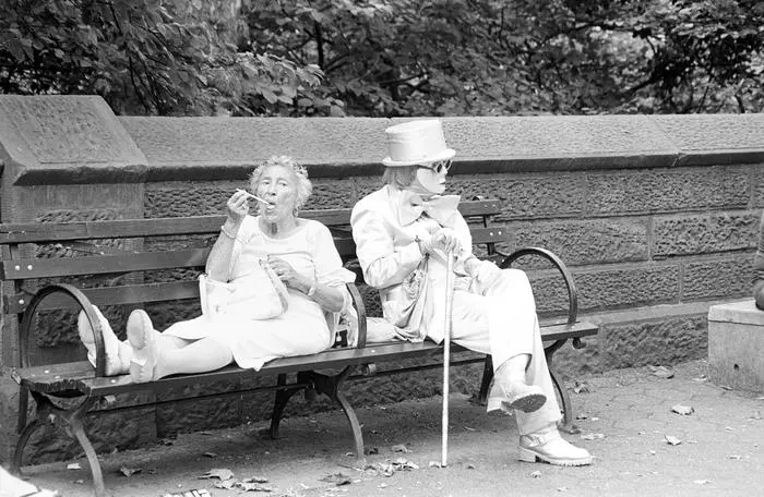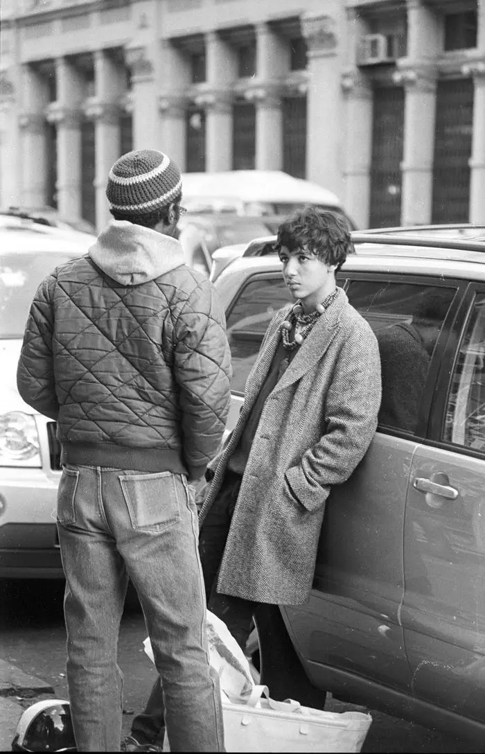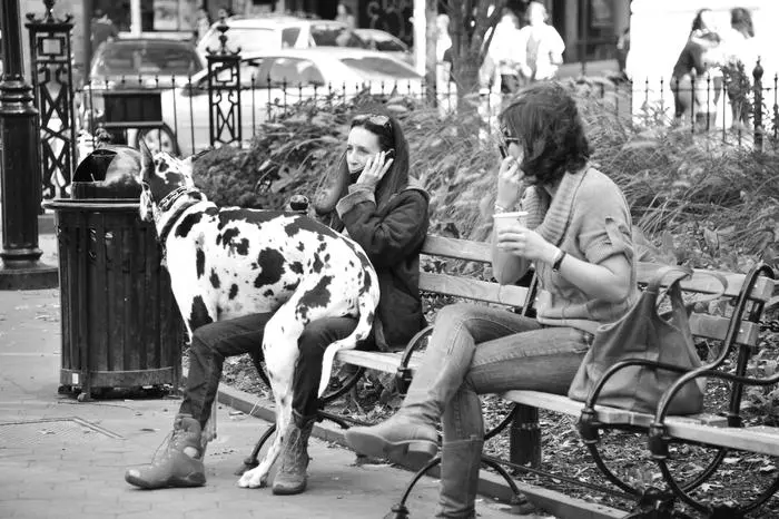 Street conversation in black and white
