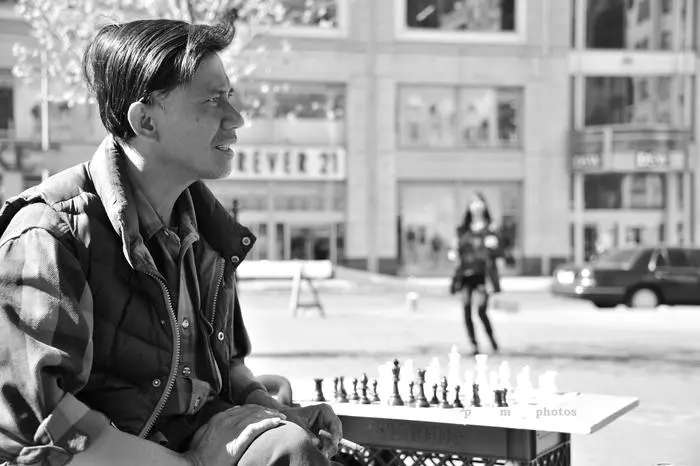 Man sitting by outdoor chessboard