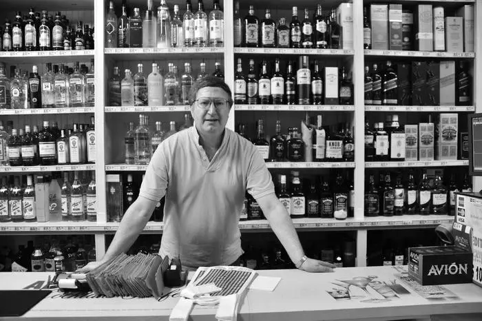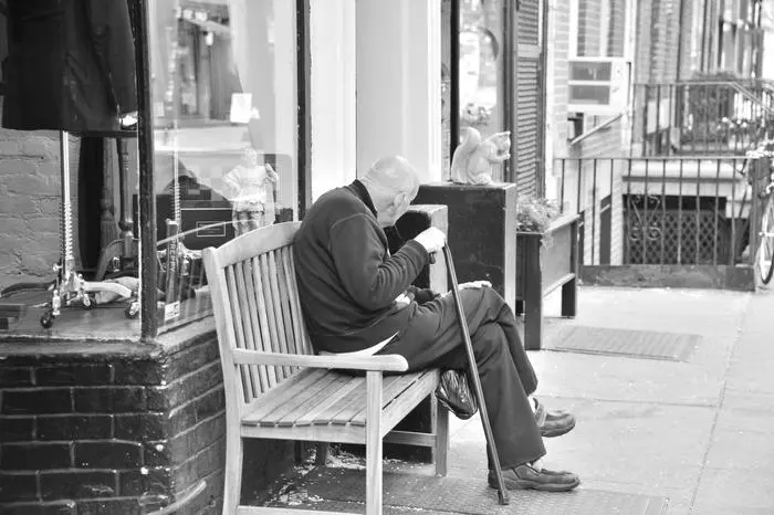 Man sitting outside shop on bench