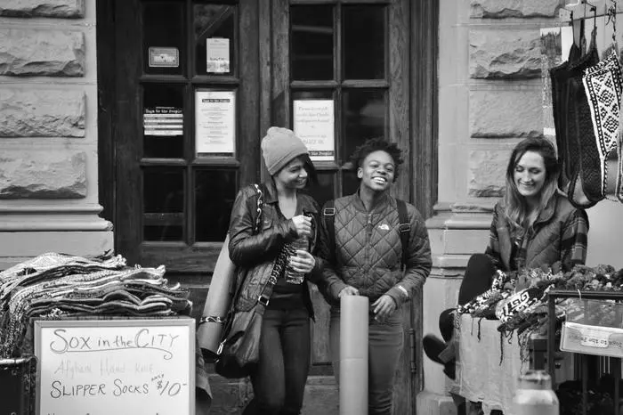 Women laughing at a street market