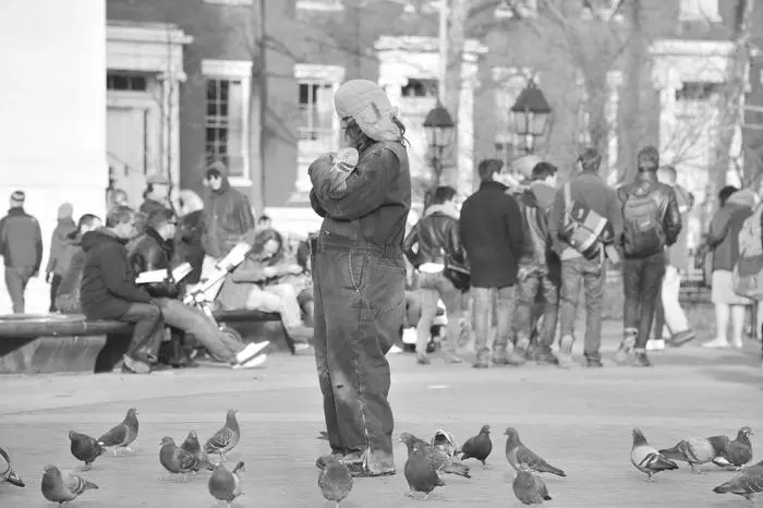 Individual surrounded by pigeons outdoors