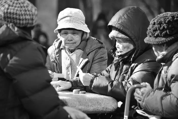 Seniors gathered around table in winter attire