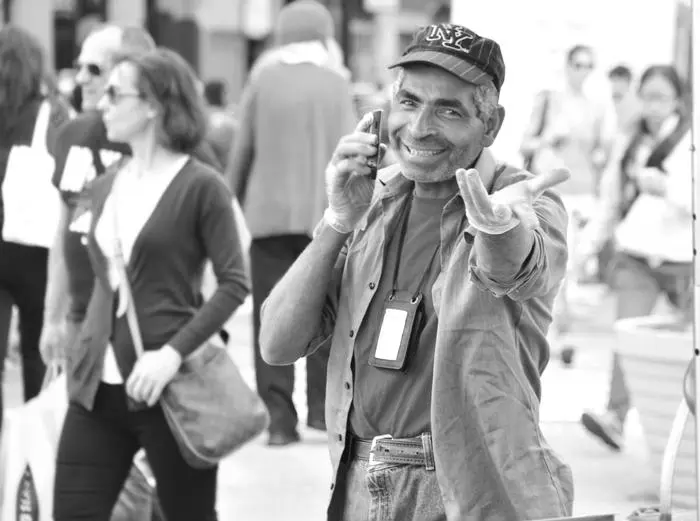 Man talking on phone, smiling in crowd