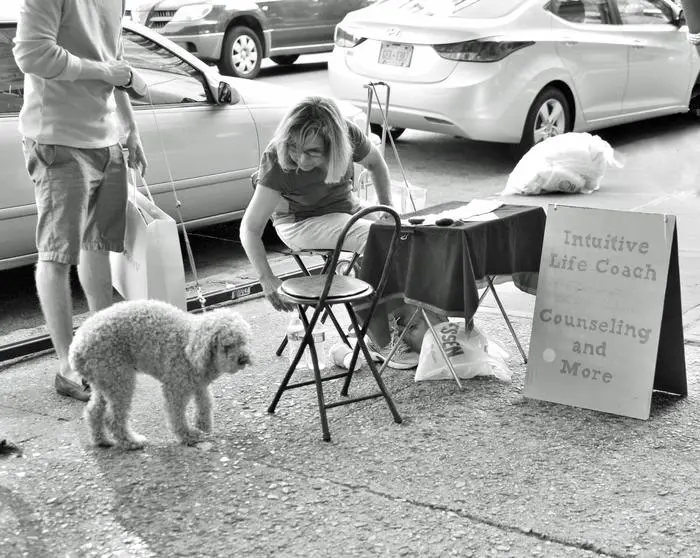 Woman petting dog at outdoor table