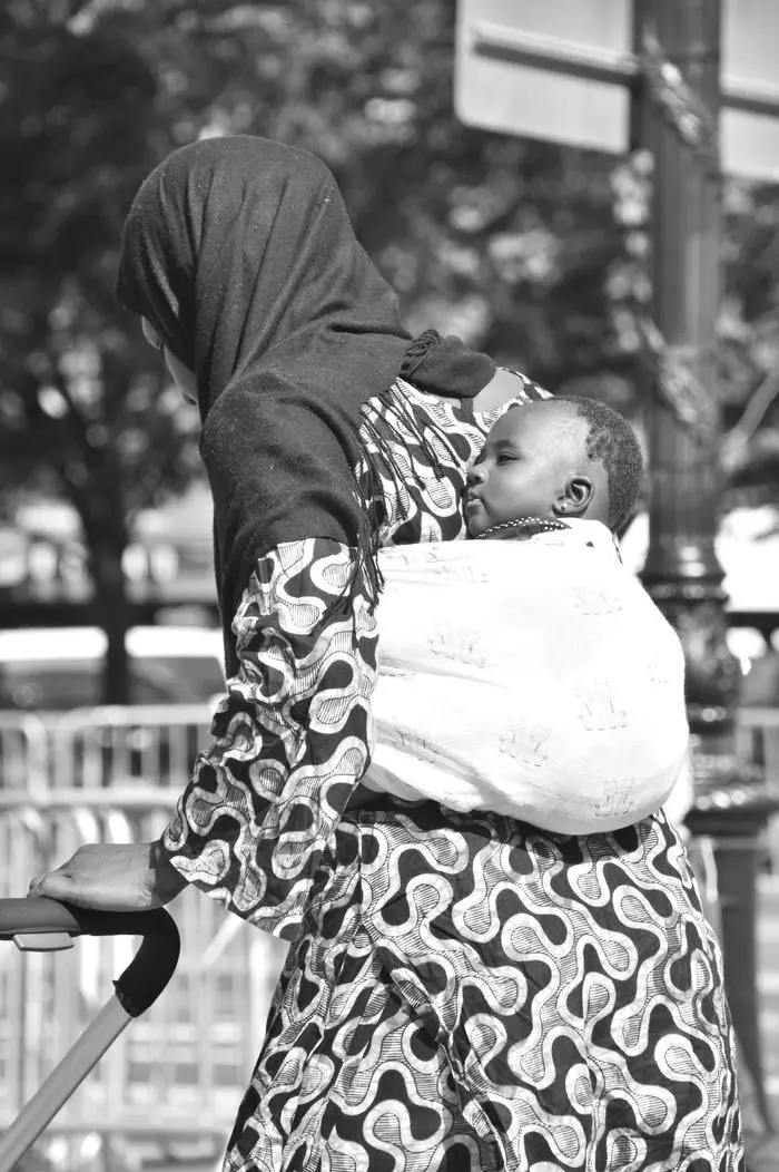 Mother and child outdoors in black and white