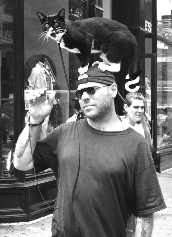 Black and white photo of man and cat