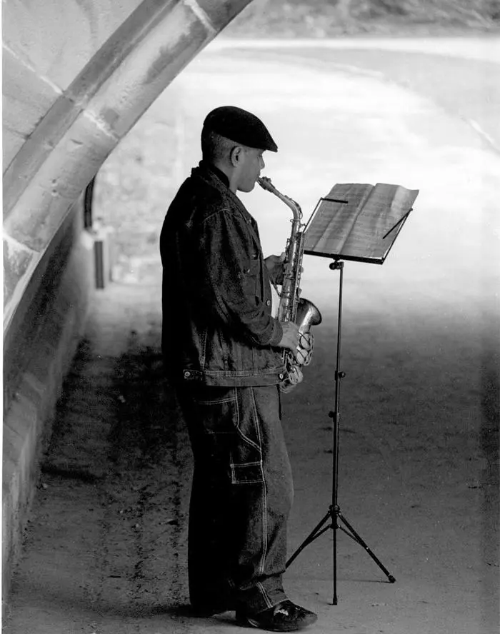 Saxophonist performing in an archway