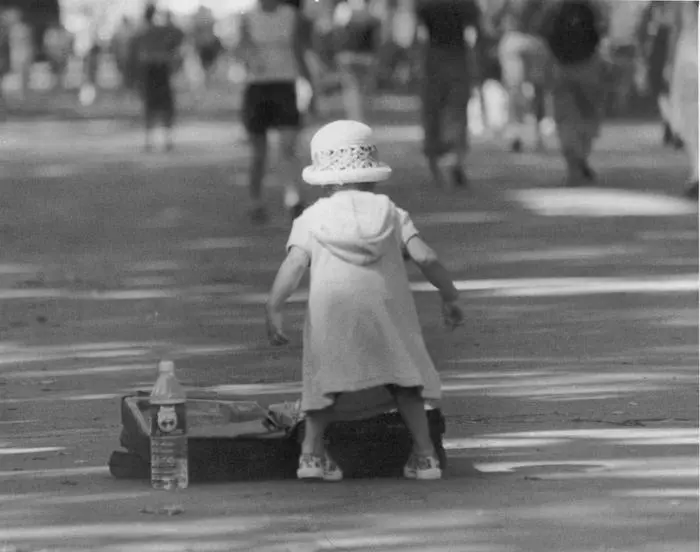Toddler standing in the street with suitcase