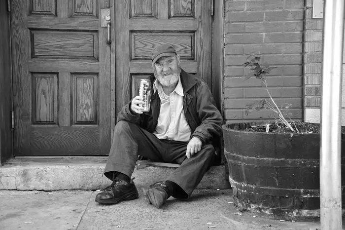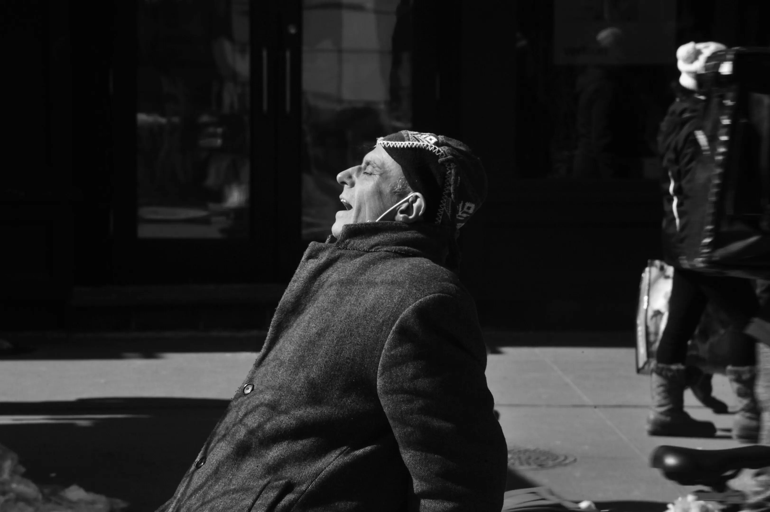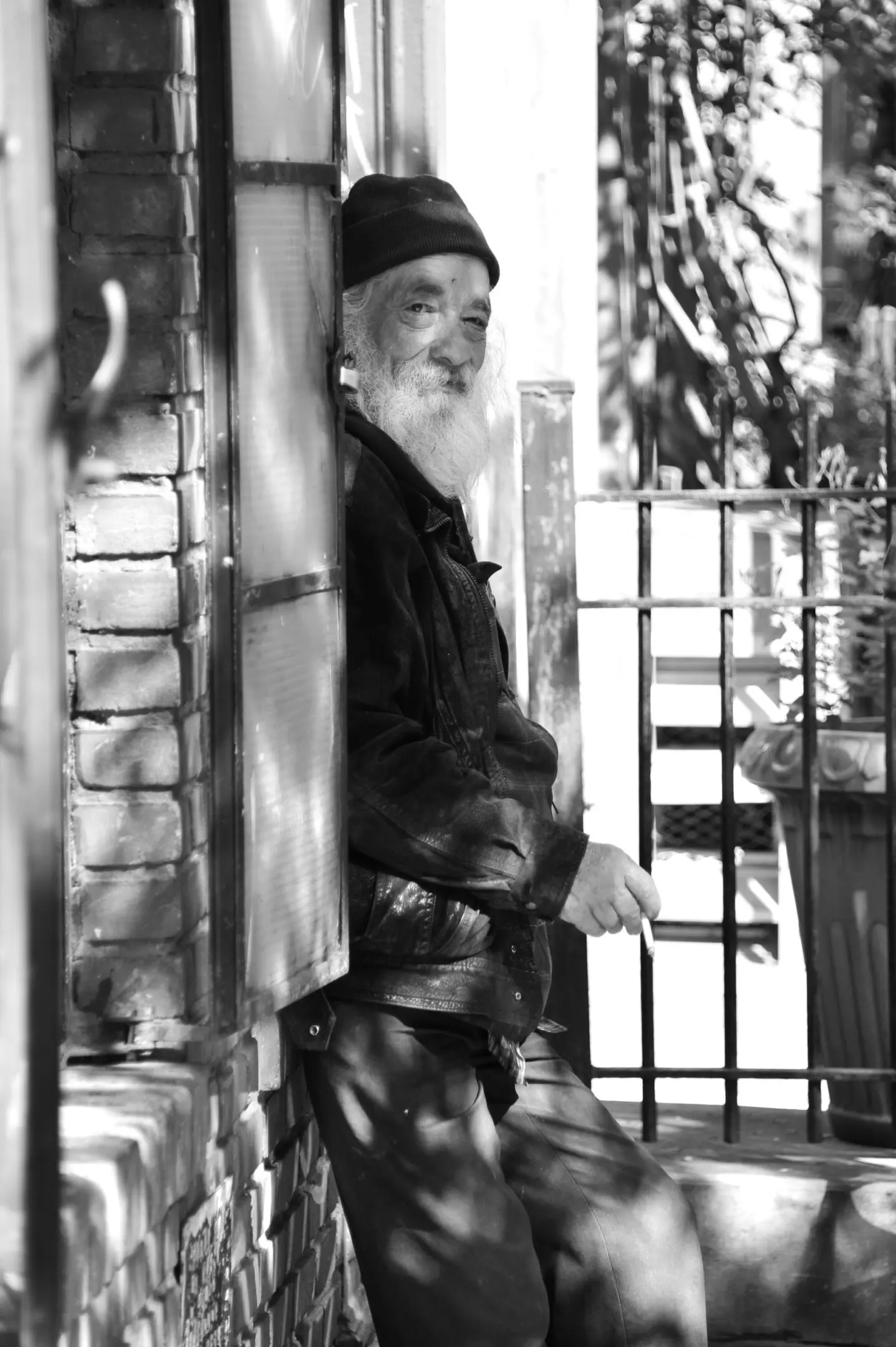 Black and white portrait of a thoughtful elderly man leaning against a wall.