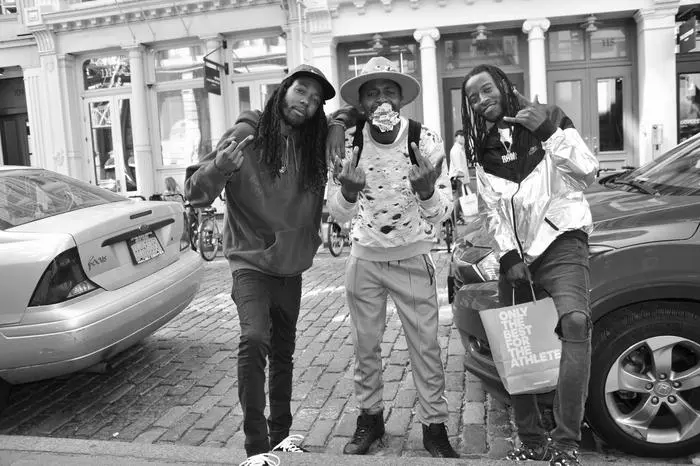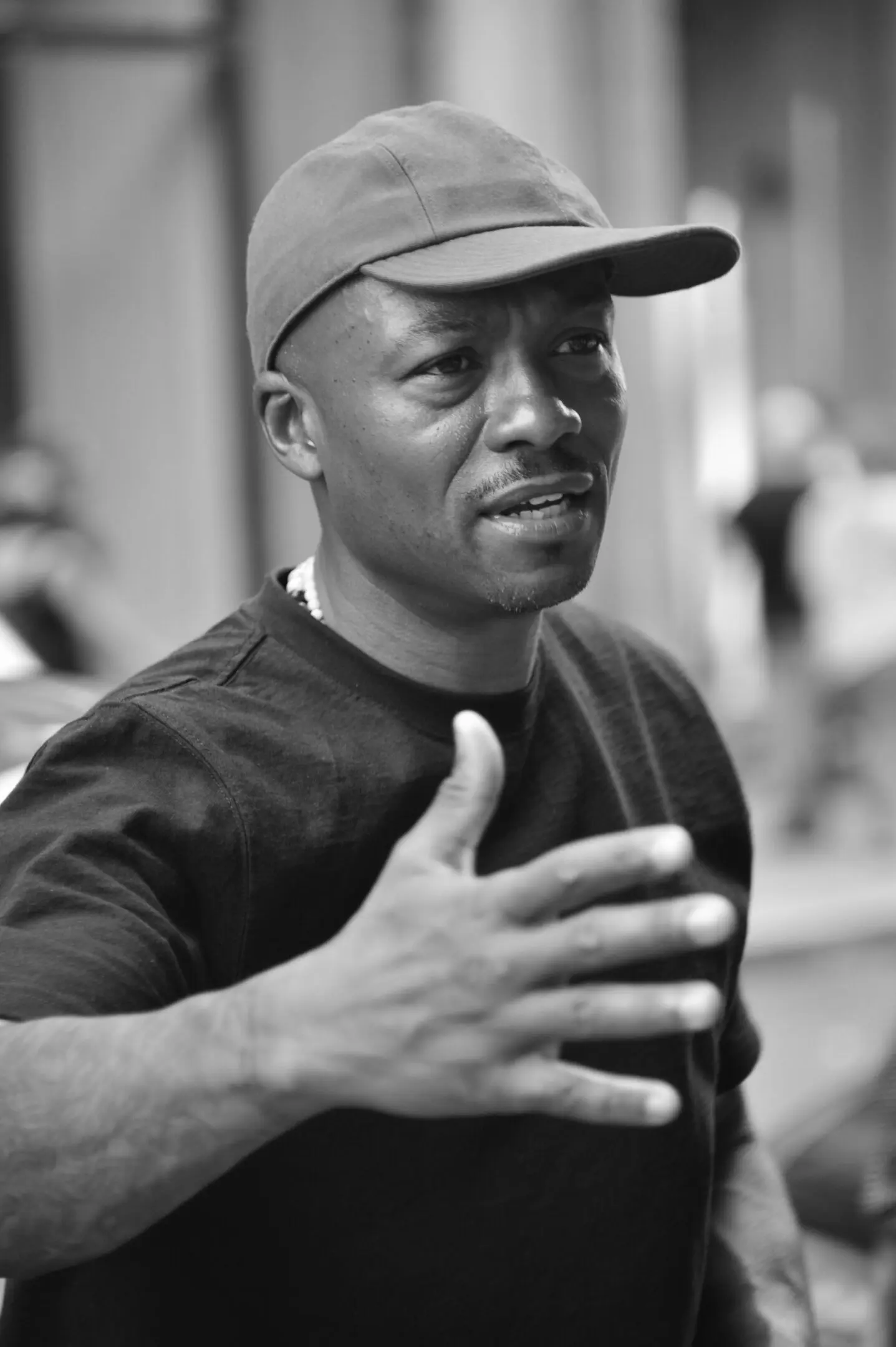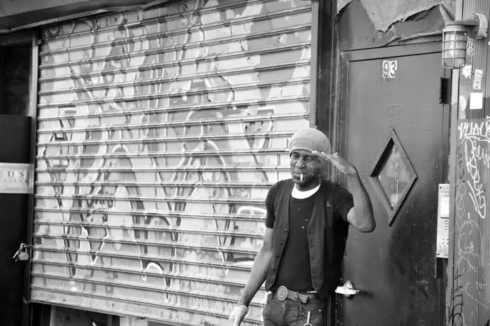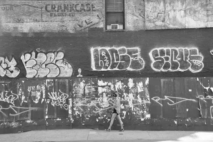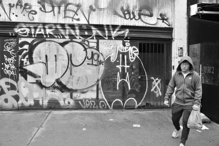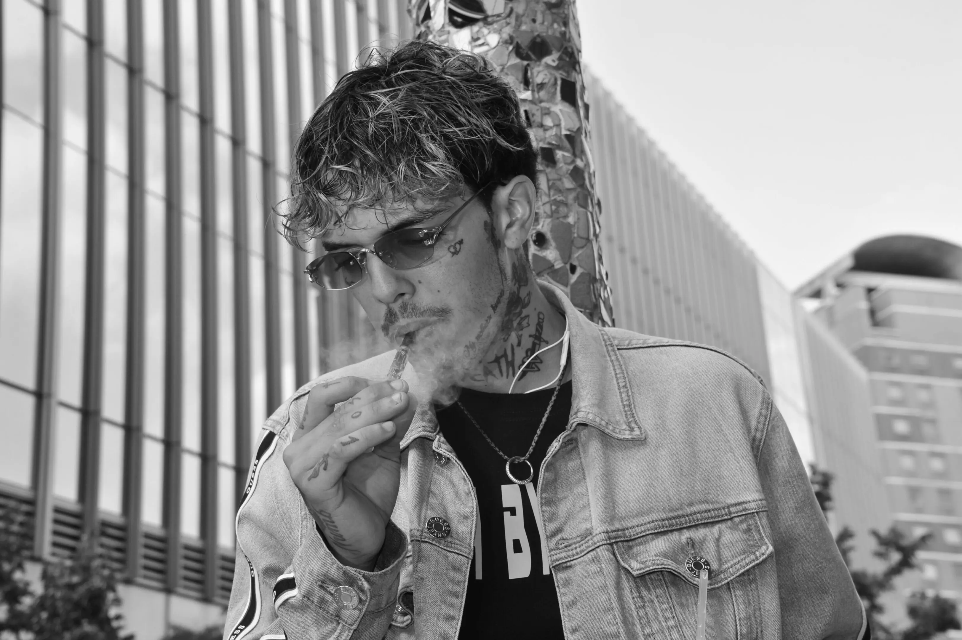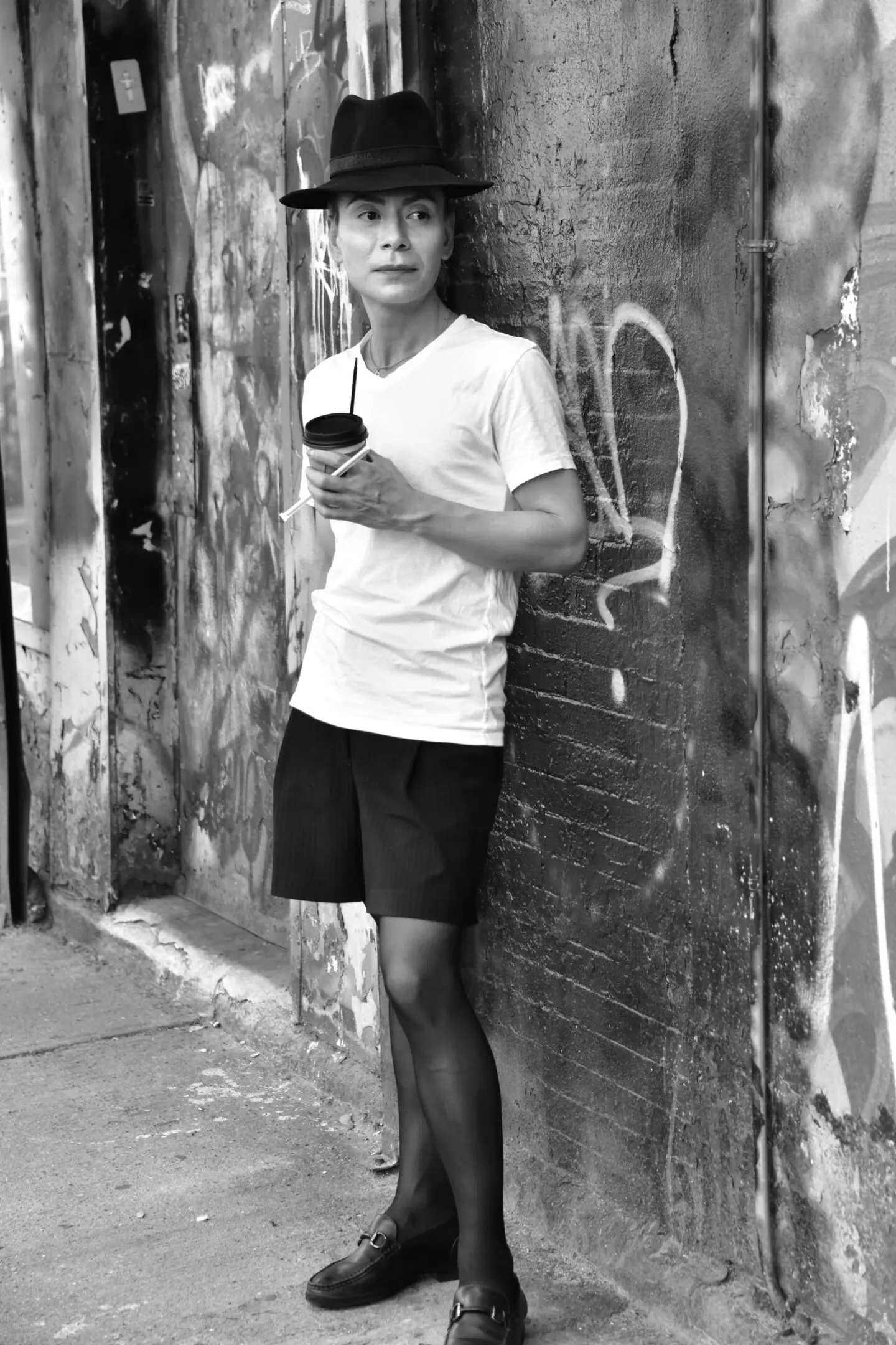 Young man leaning against a graffiti-covered wall, dressed casually.