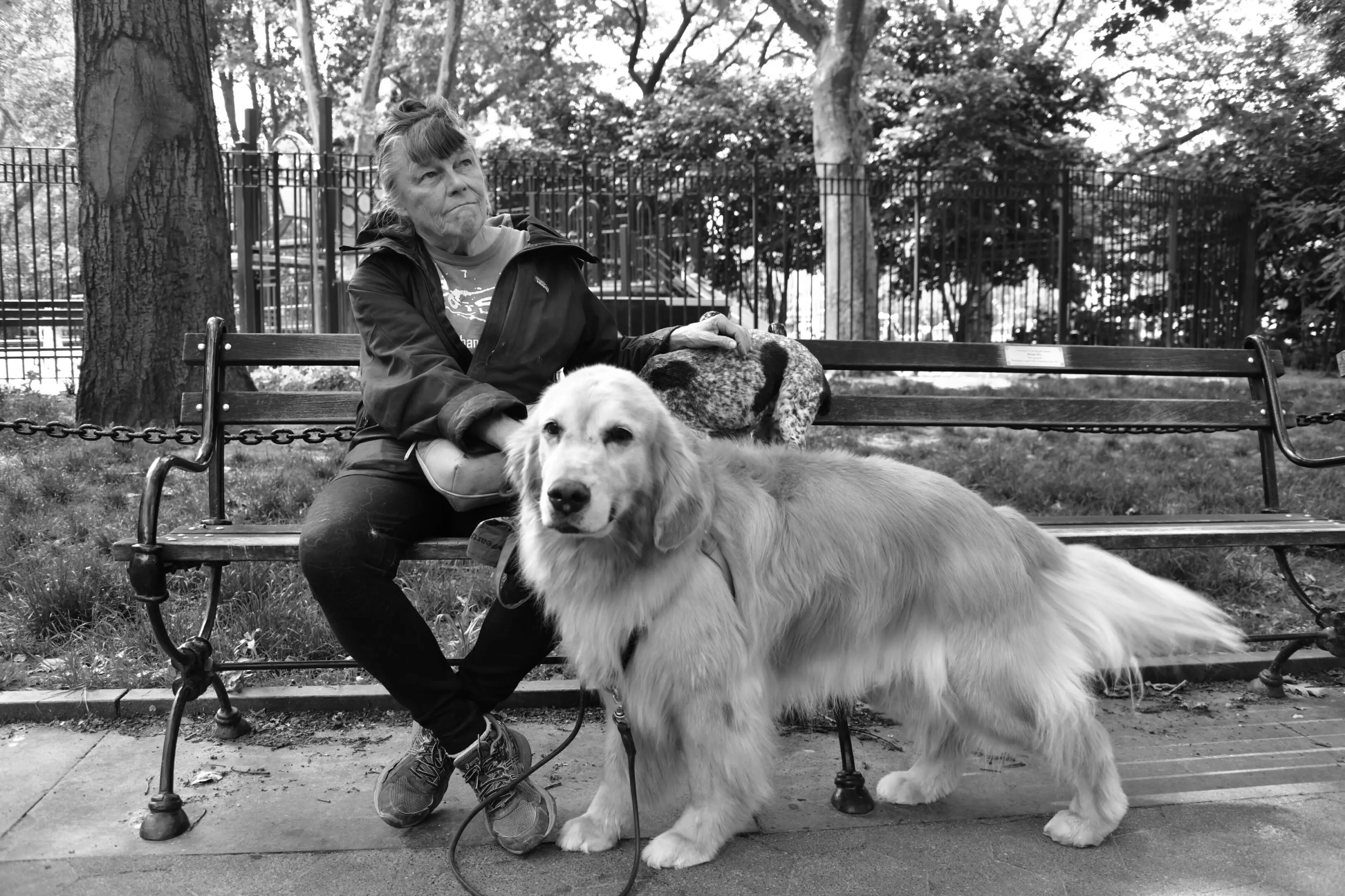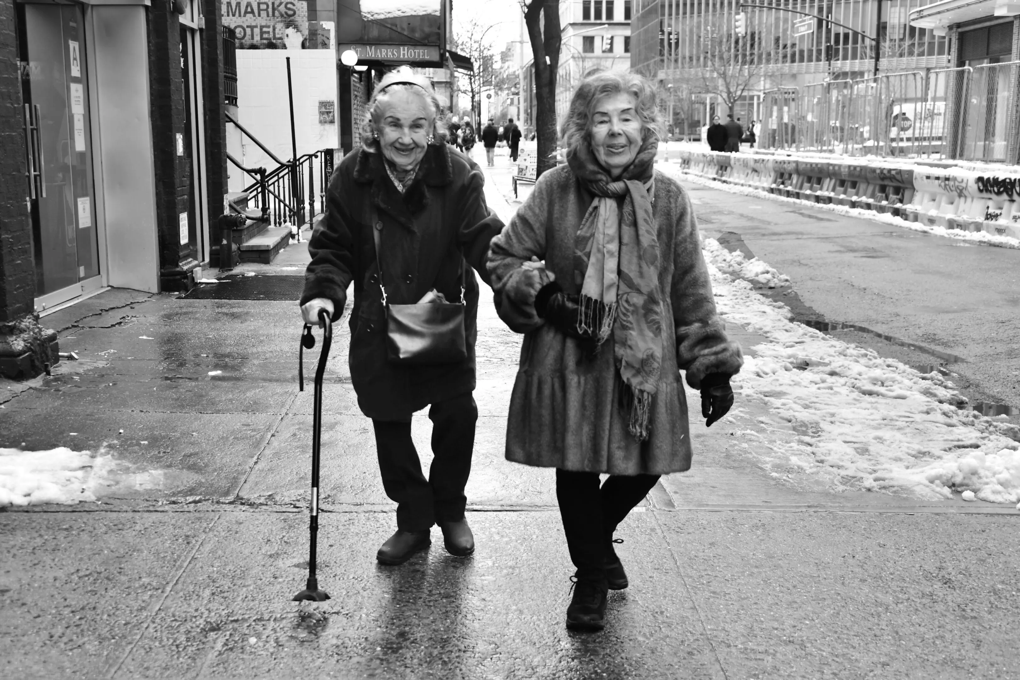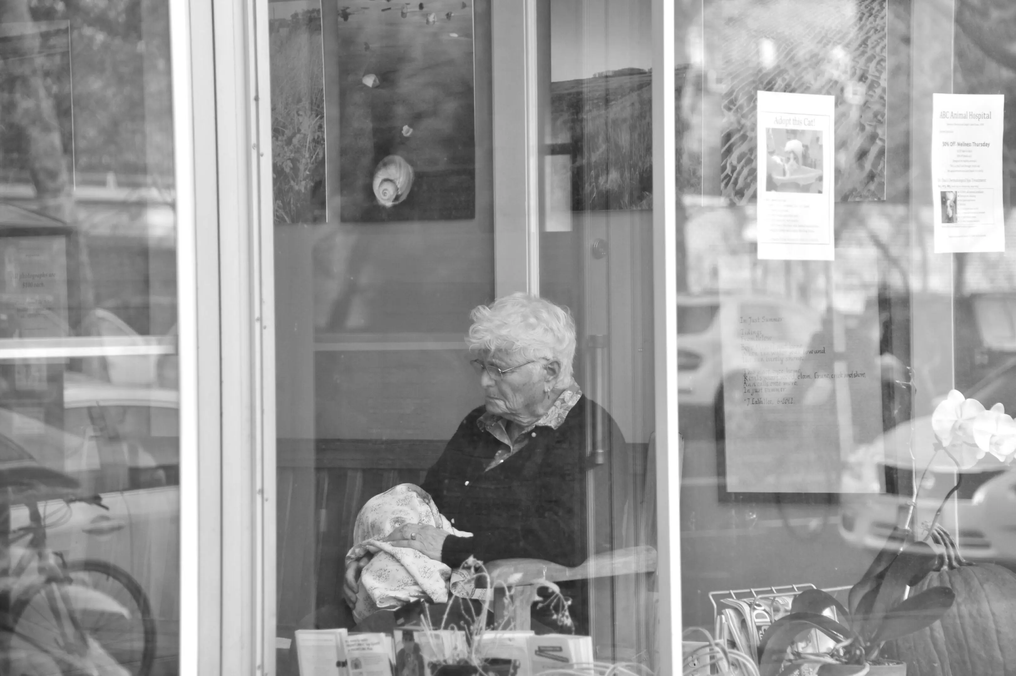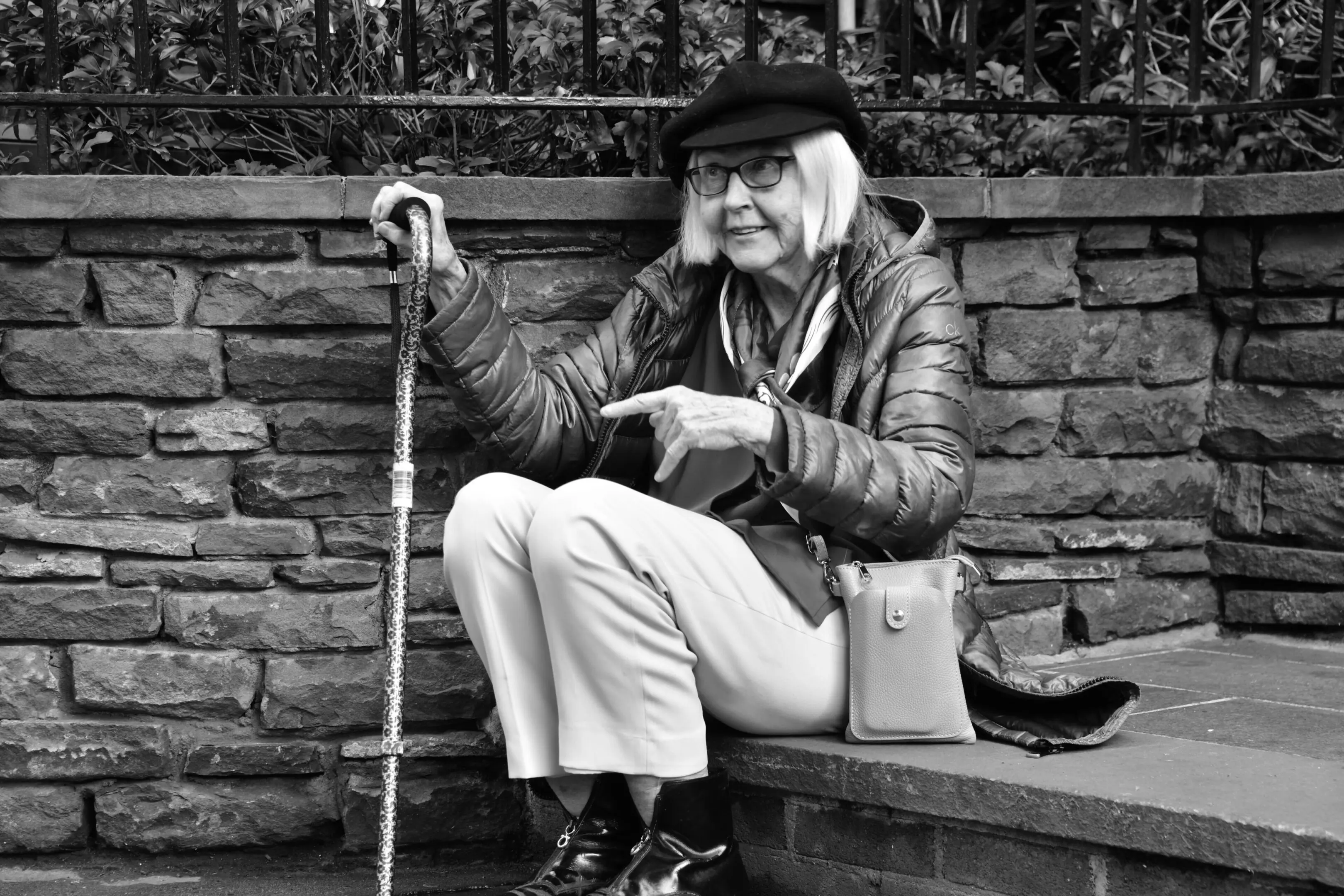 Elderly woman sitting on a bench with a cane and a warm jacket.