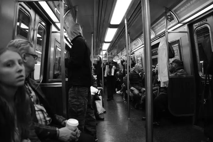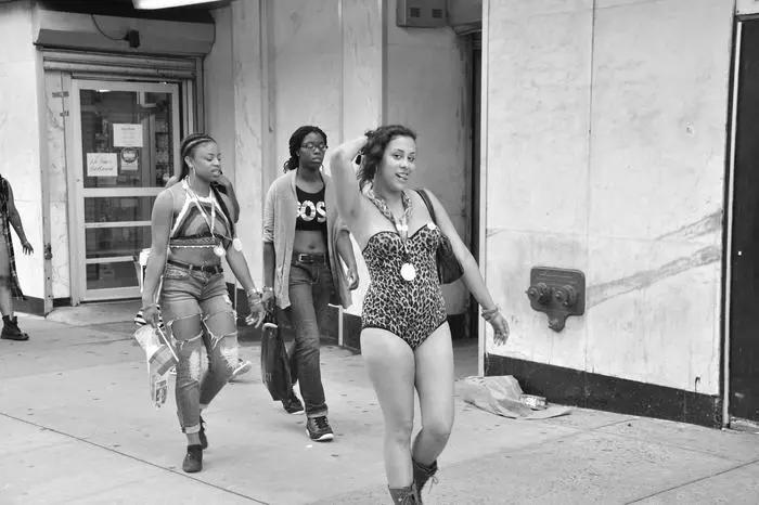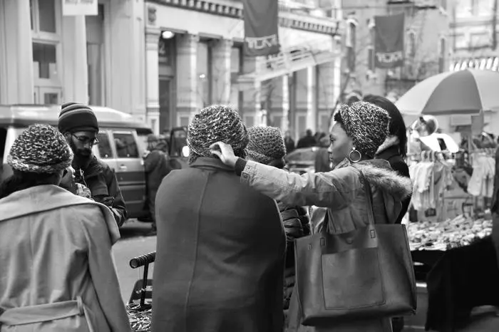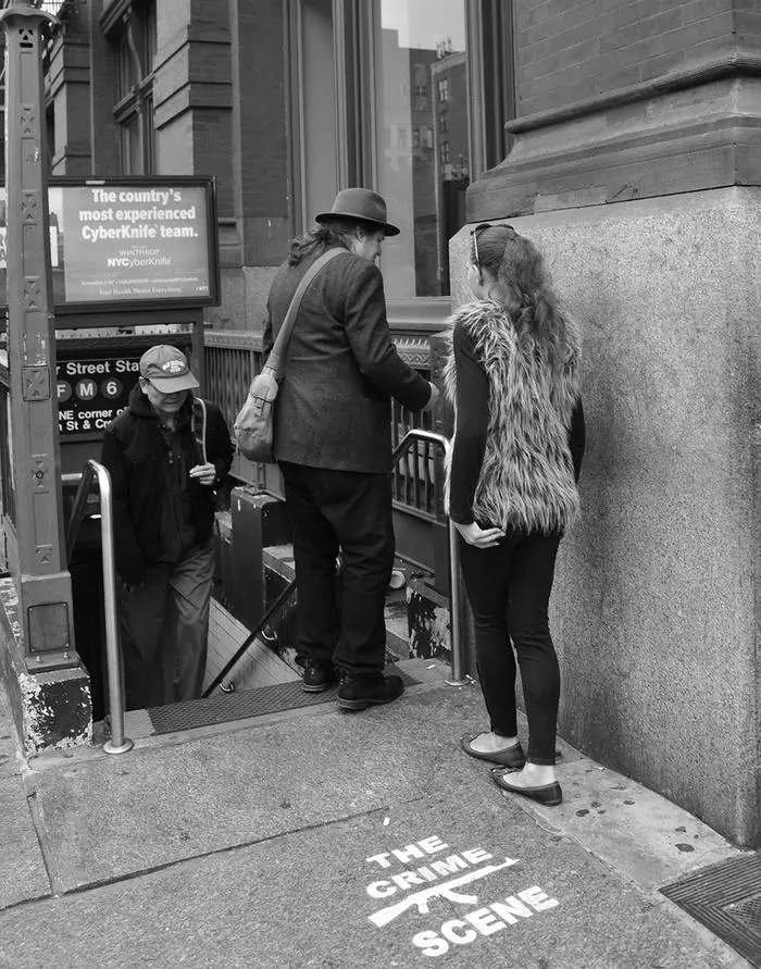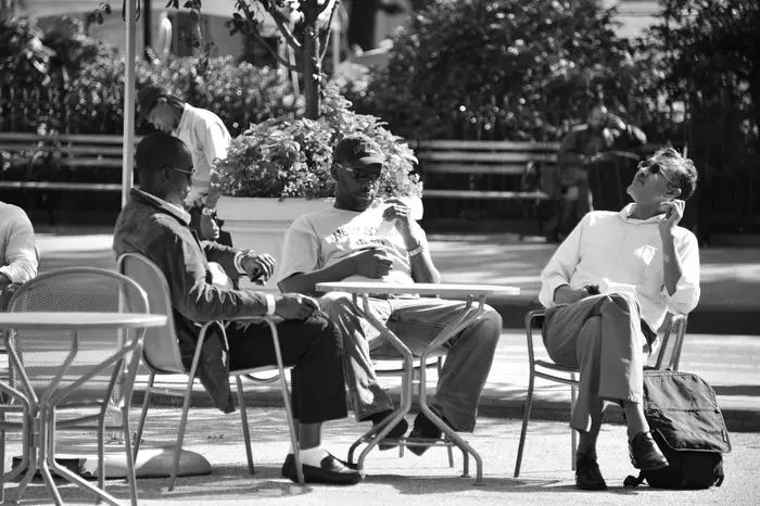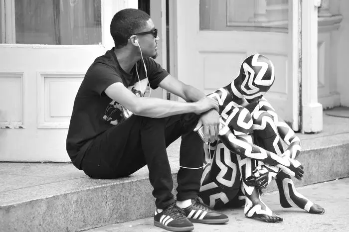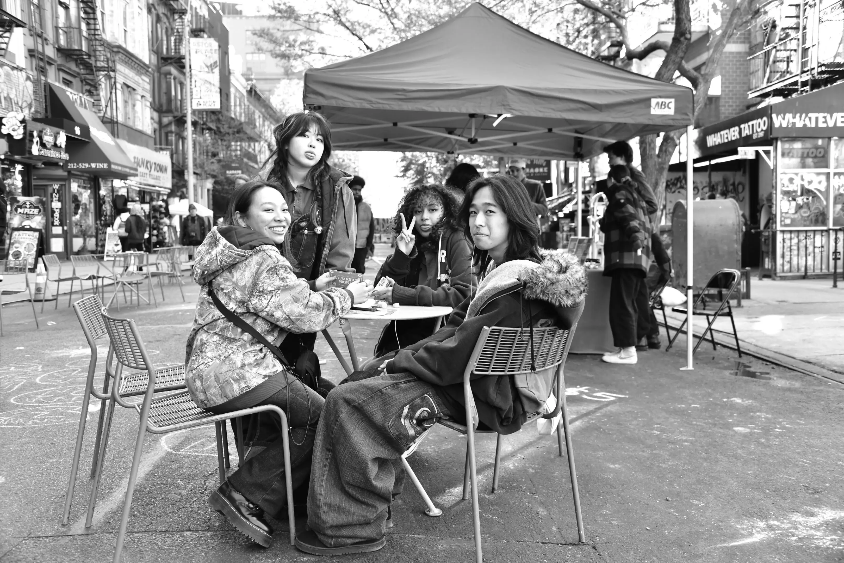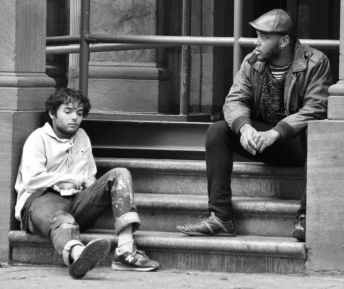 Four people sitting on a stoop in a city street, two on the steps and two on the landing.