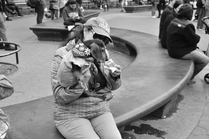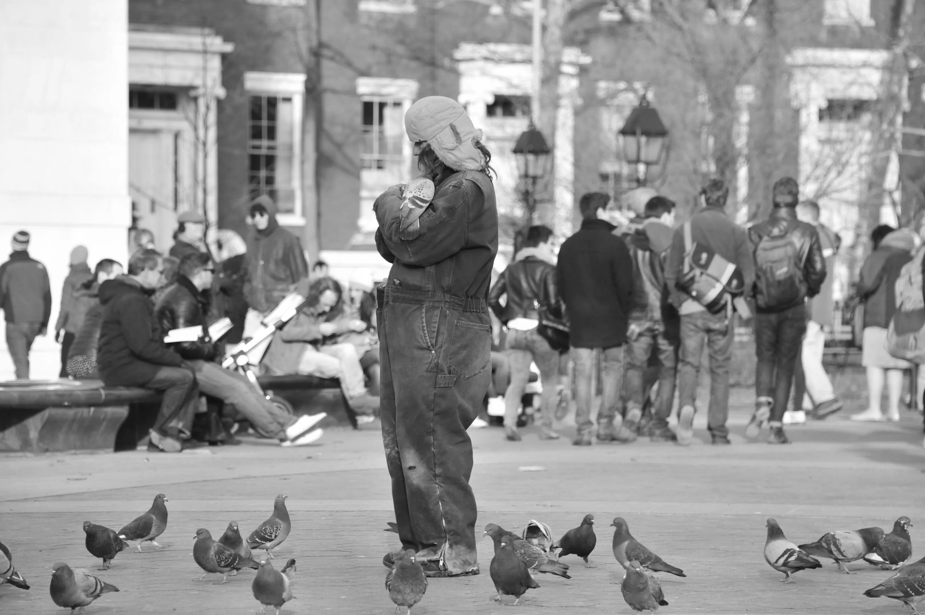 Elderly man sitting outdoors in a city square wearing a scarf and gloves.