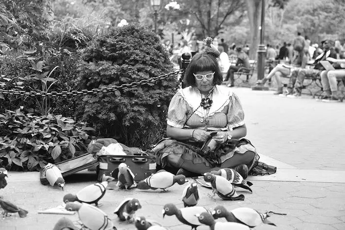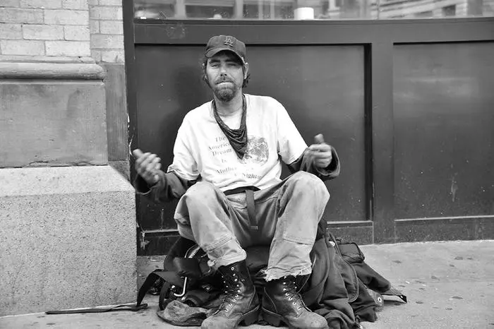 Man sitting on the ground eating, dressed in casual worn clothes.