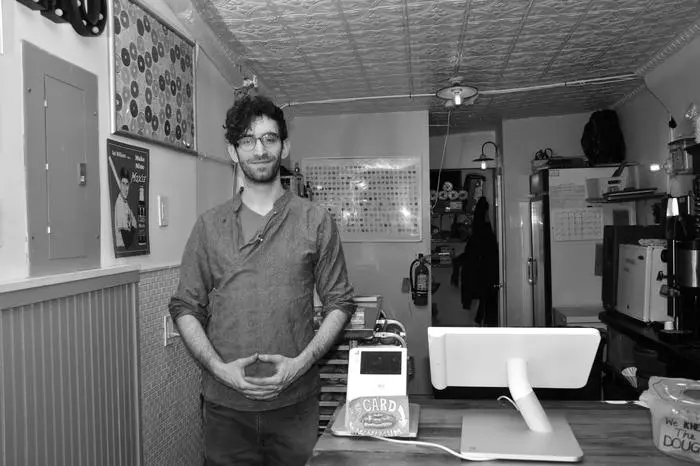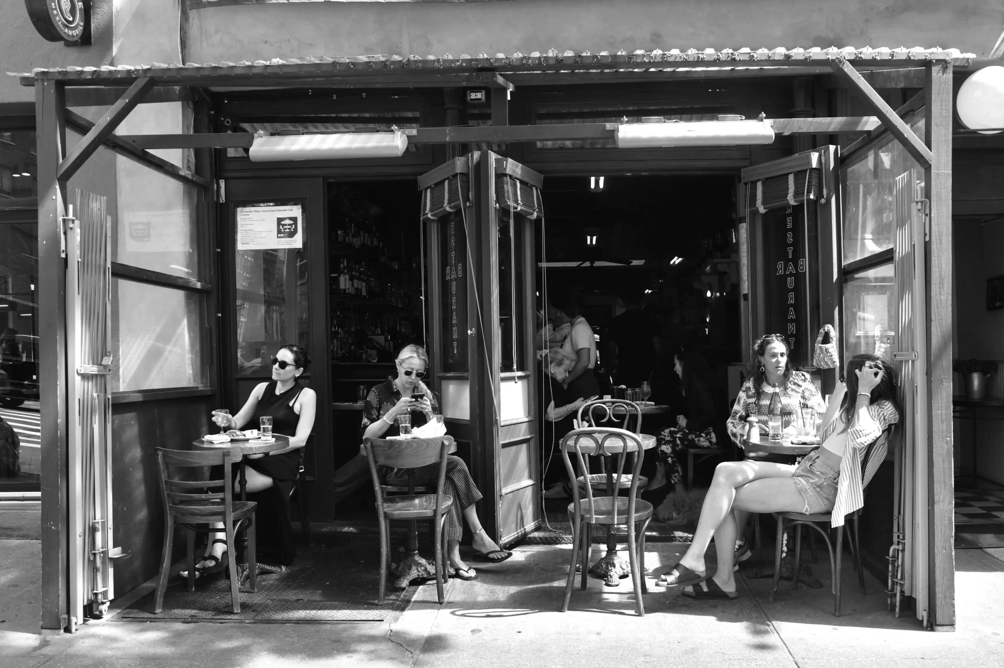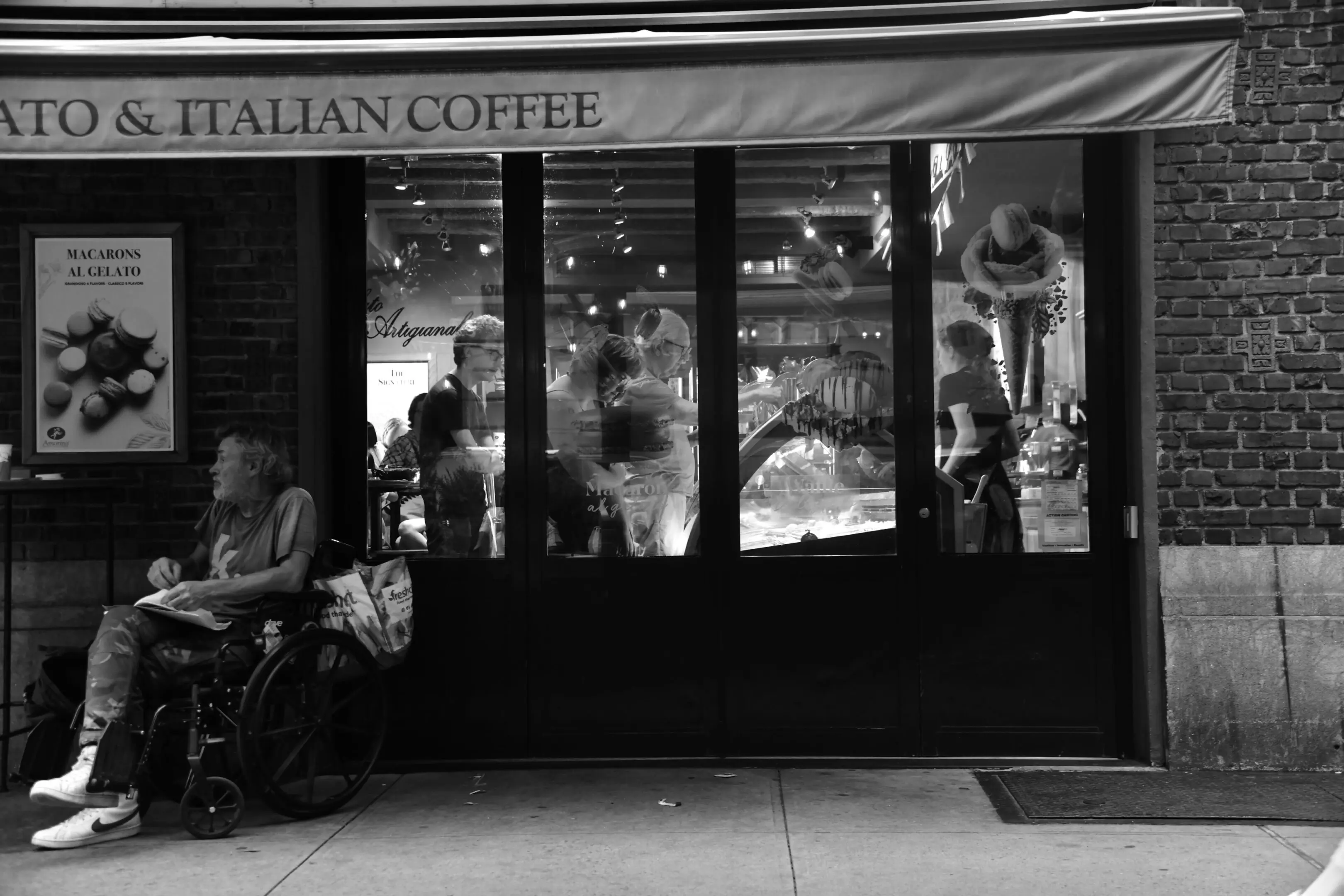 Black and white photo of a coffee shop with patrons inside and a bicycle outside.