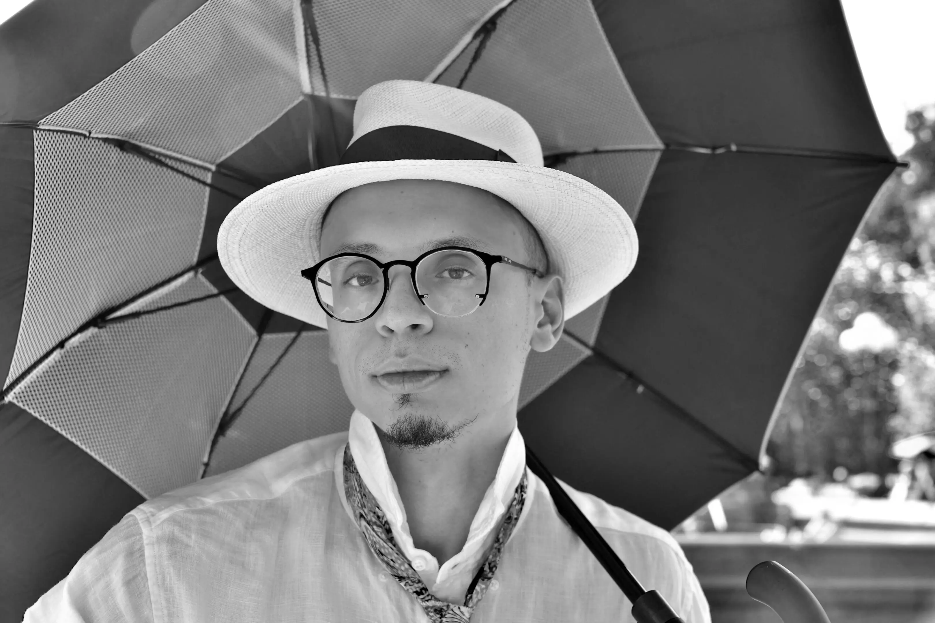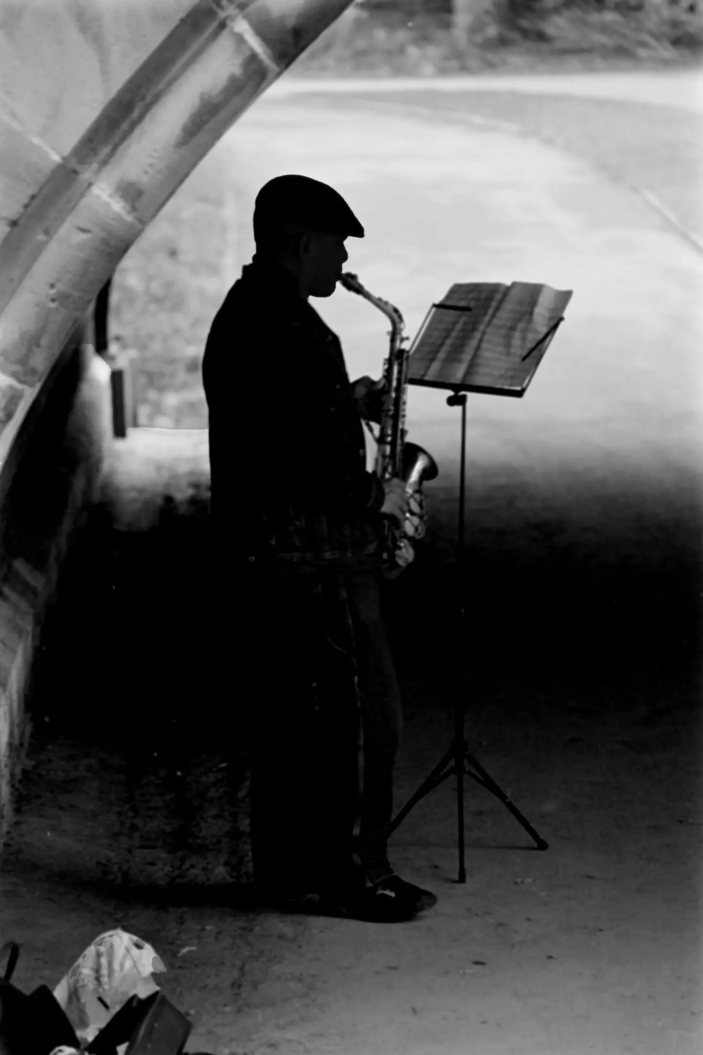 Man in a cap with a skateboard on his shoulder, black and white photo.