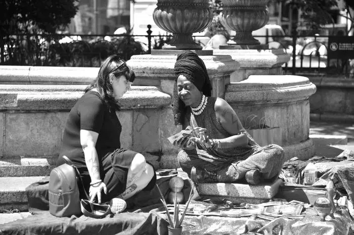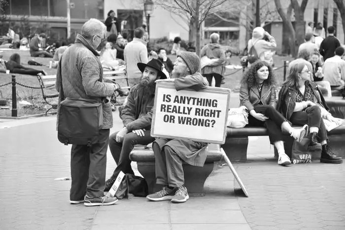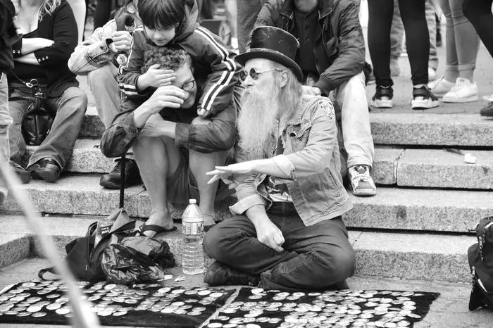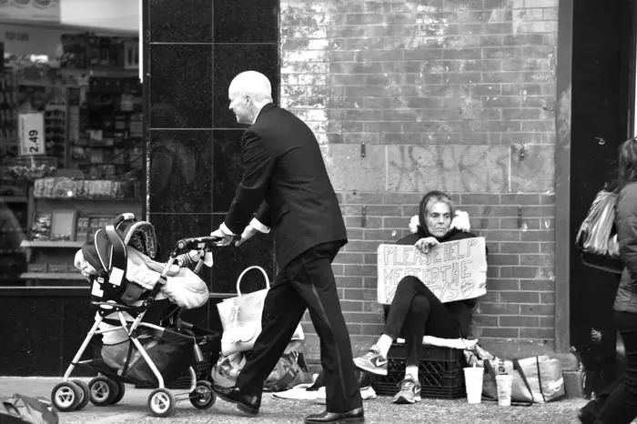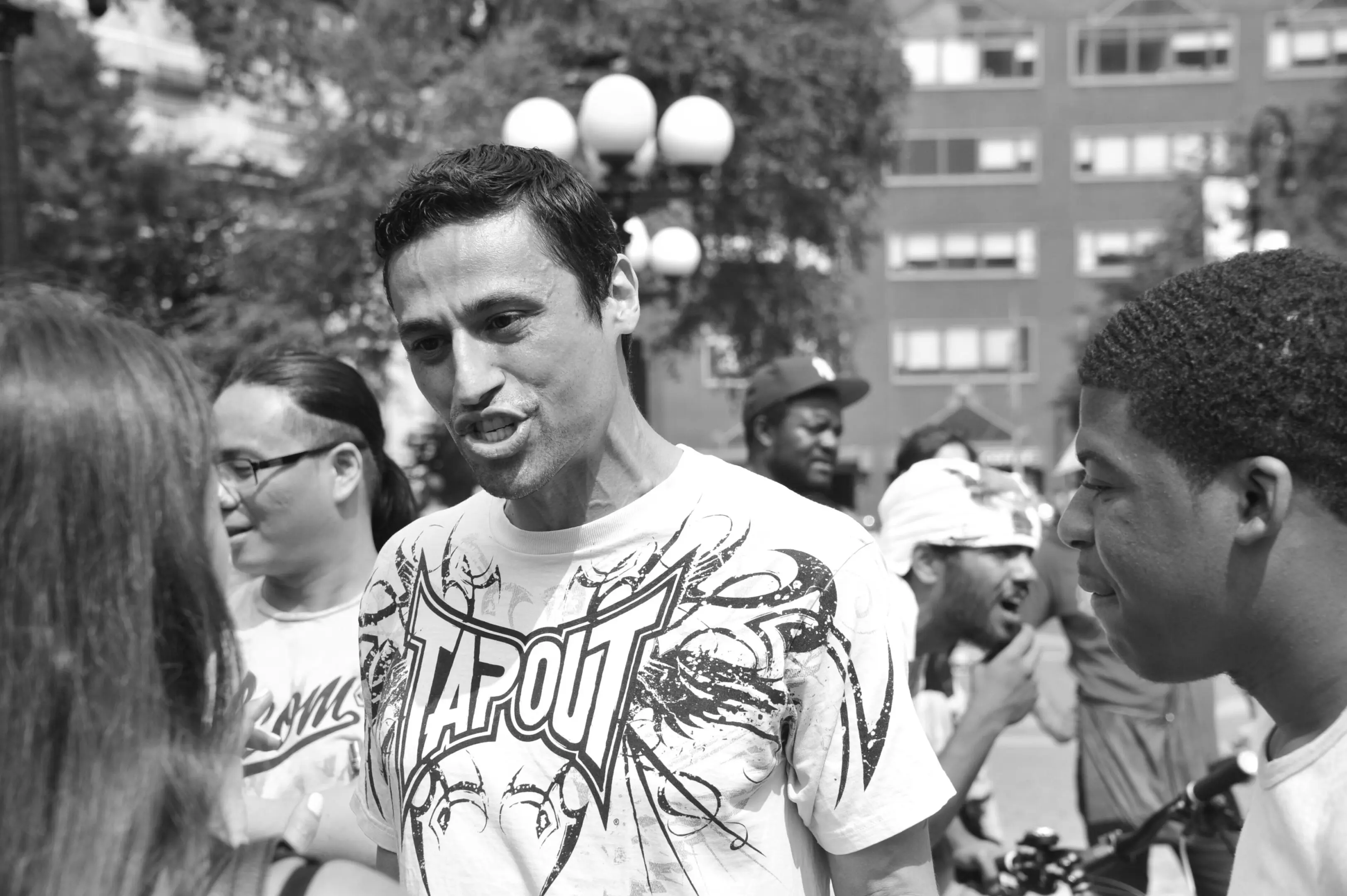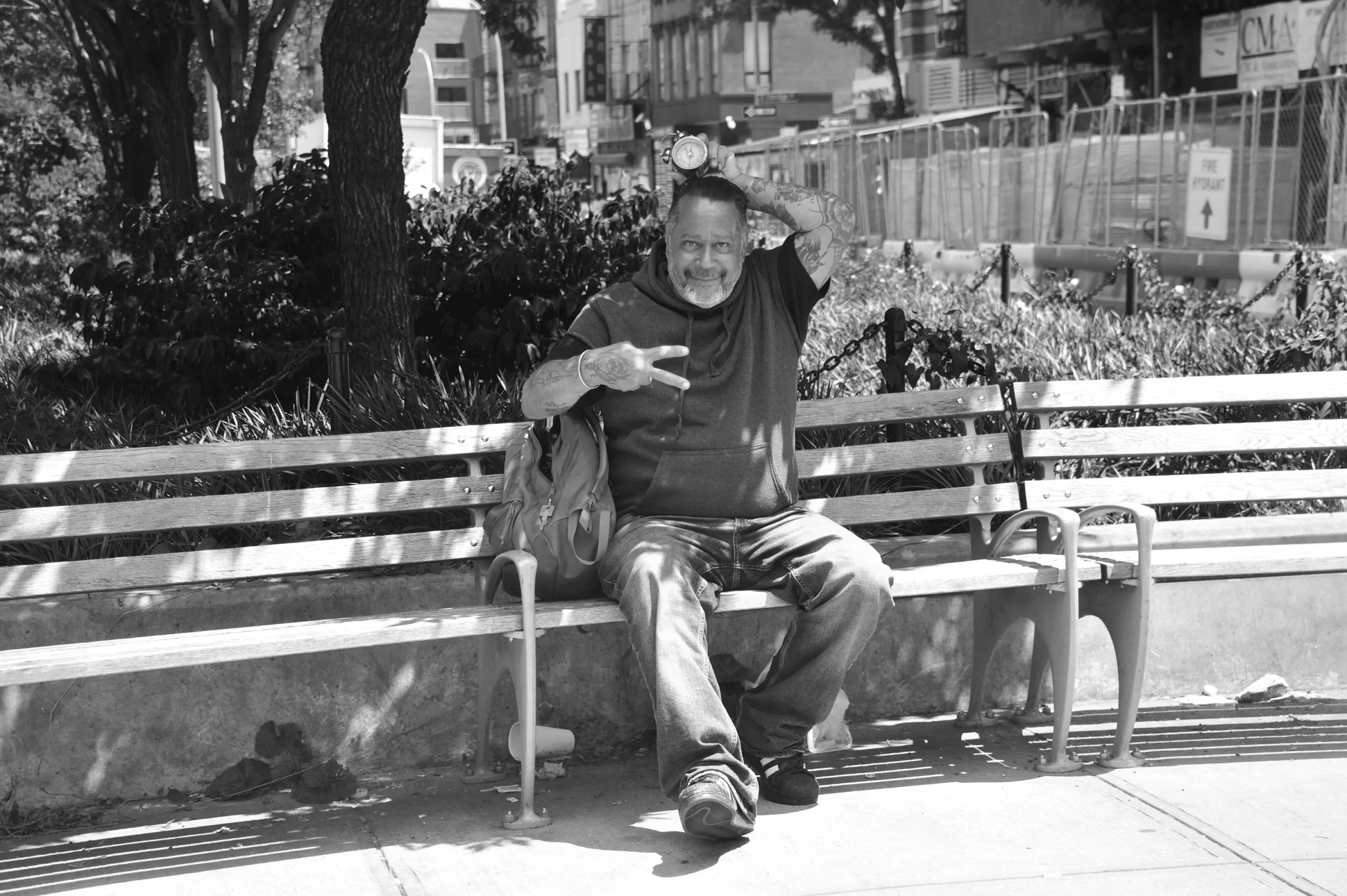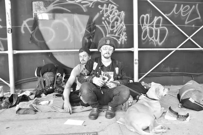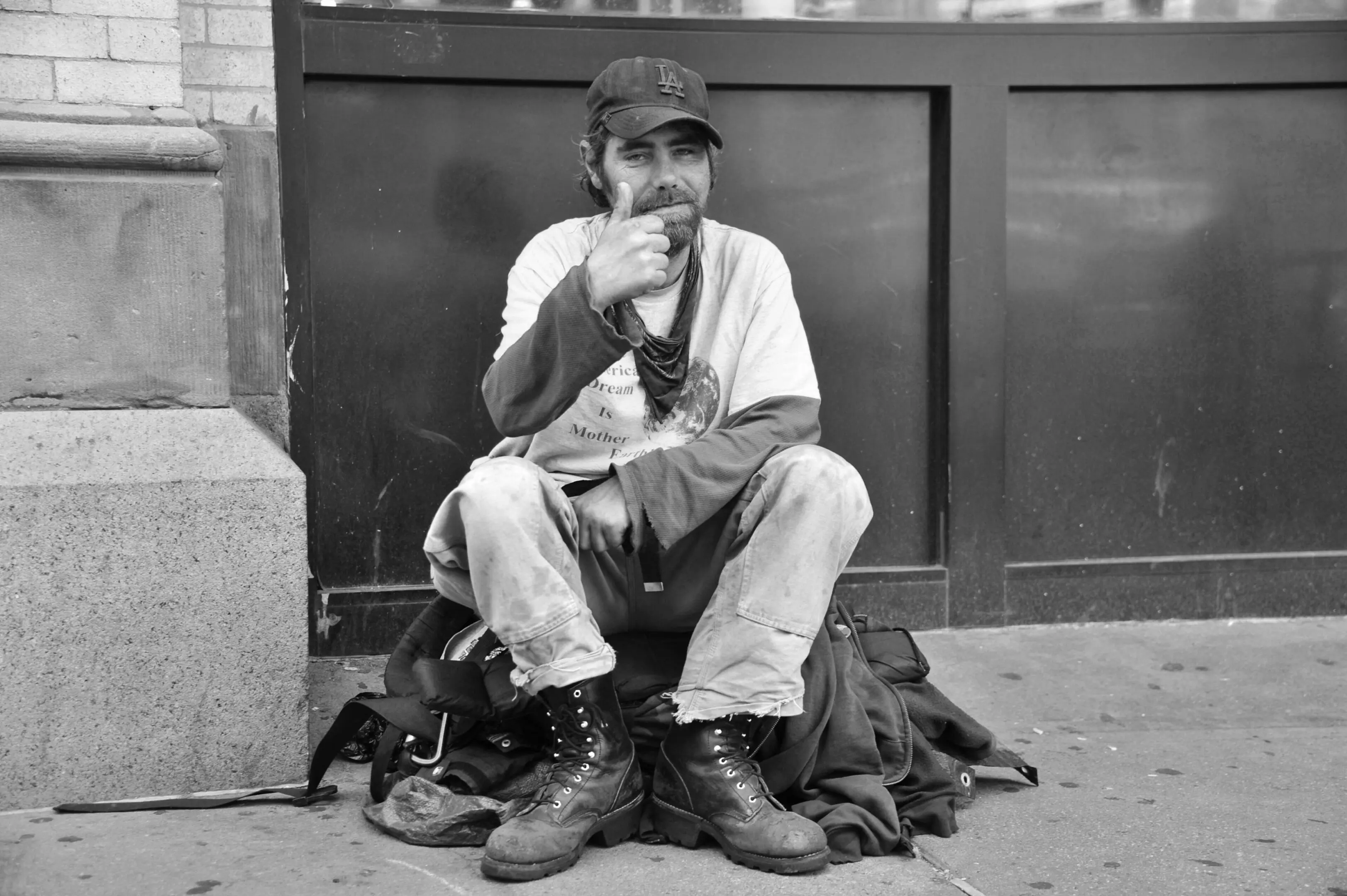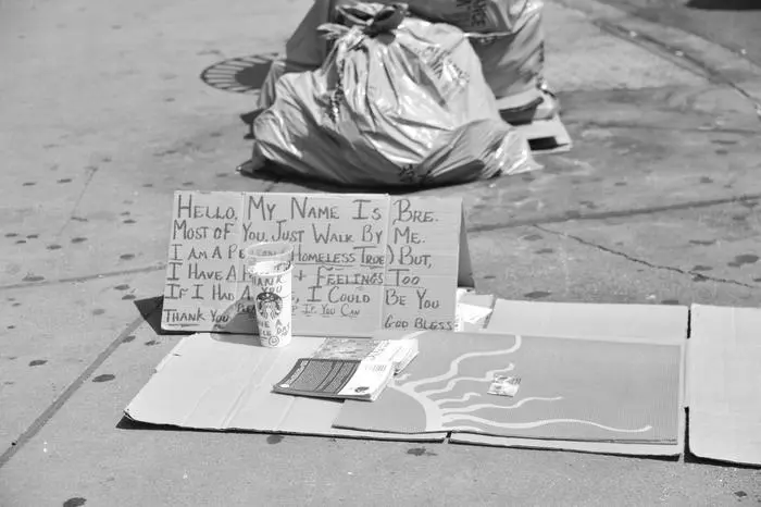 A man sitting on a sidewalk with a sign saying 'Talk to Us'.