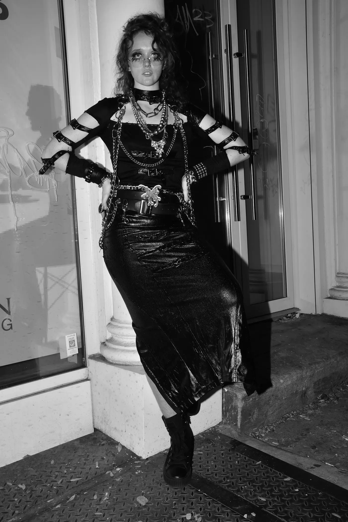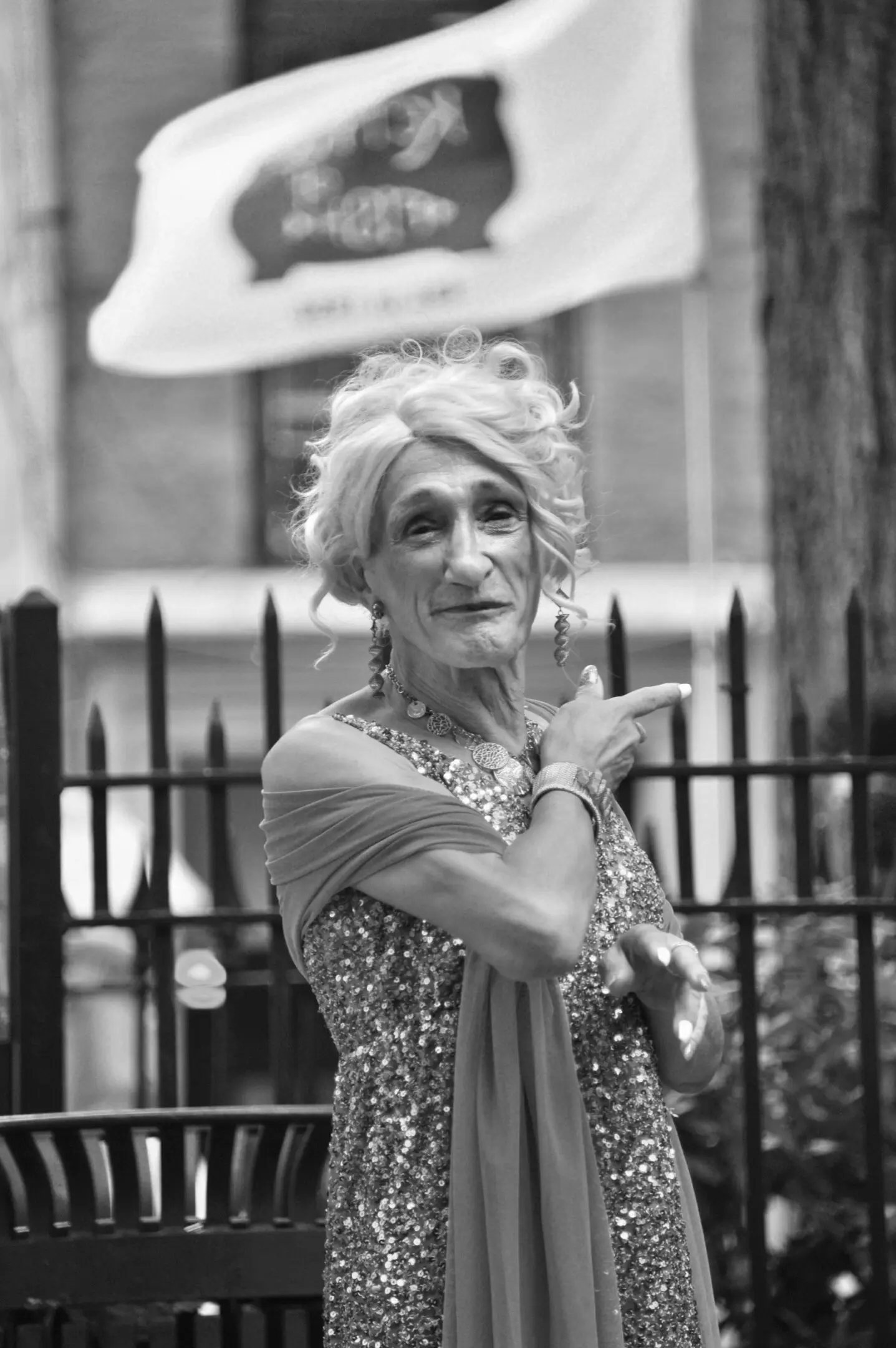 Elegant older woman in a sparkling dress poses thoughtfully outdoors.