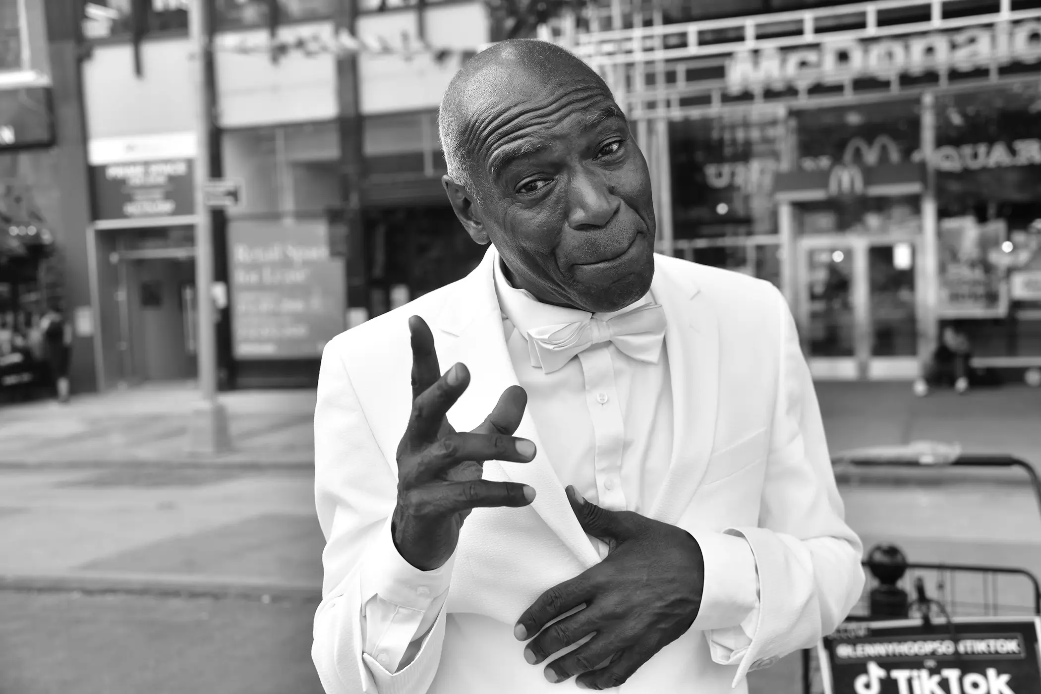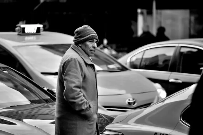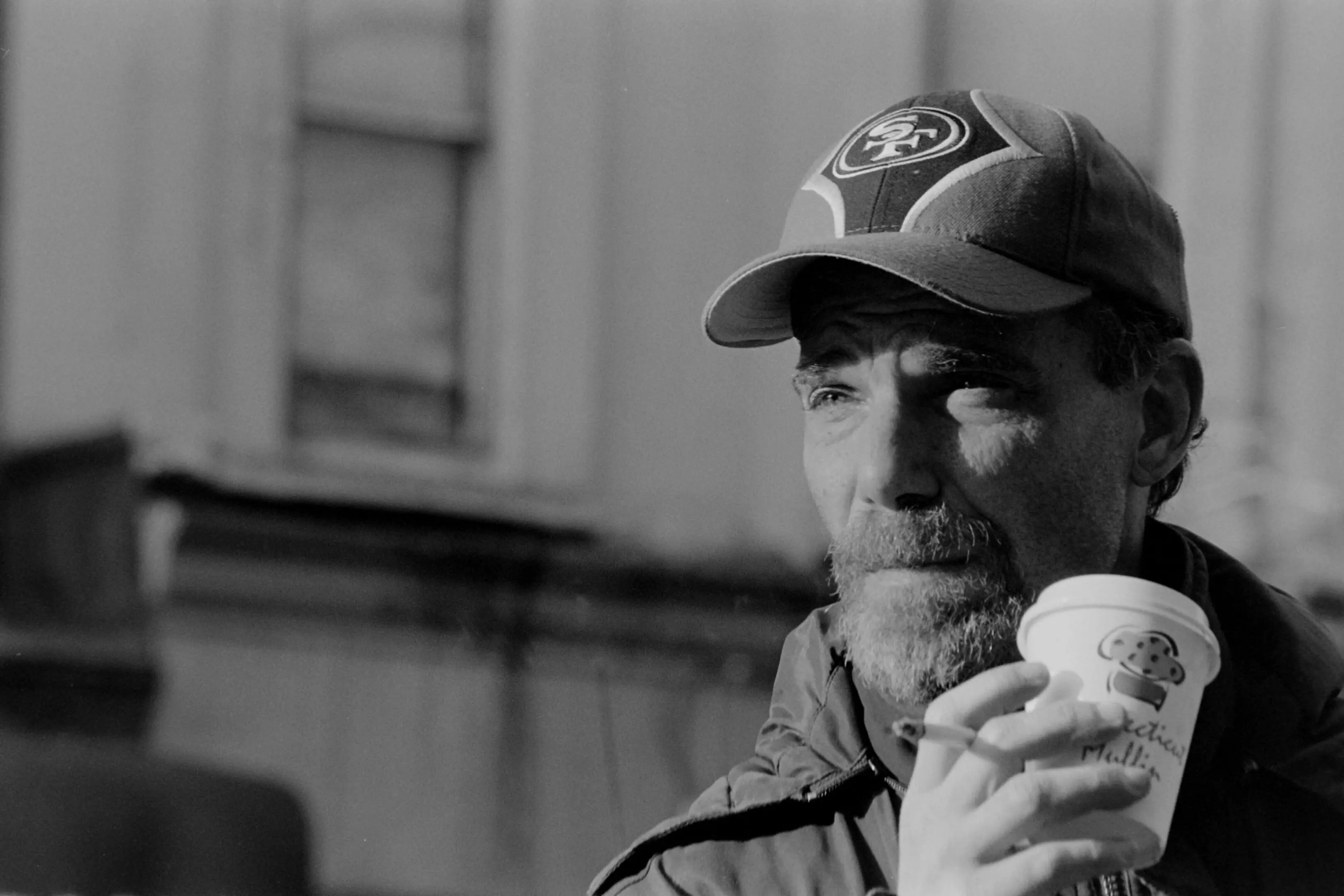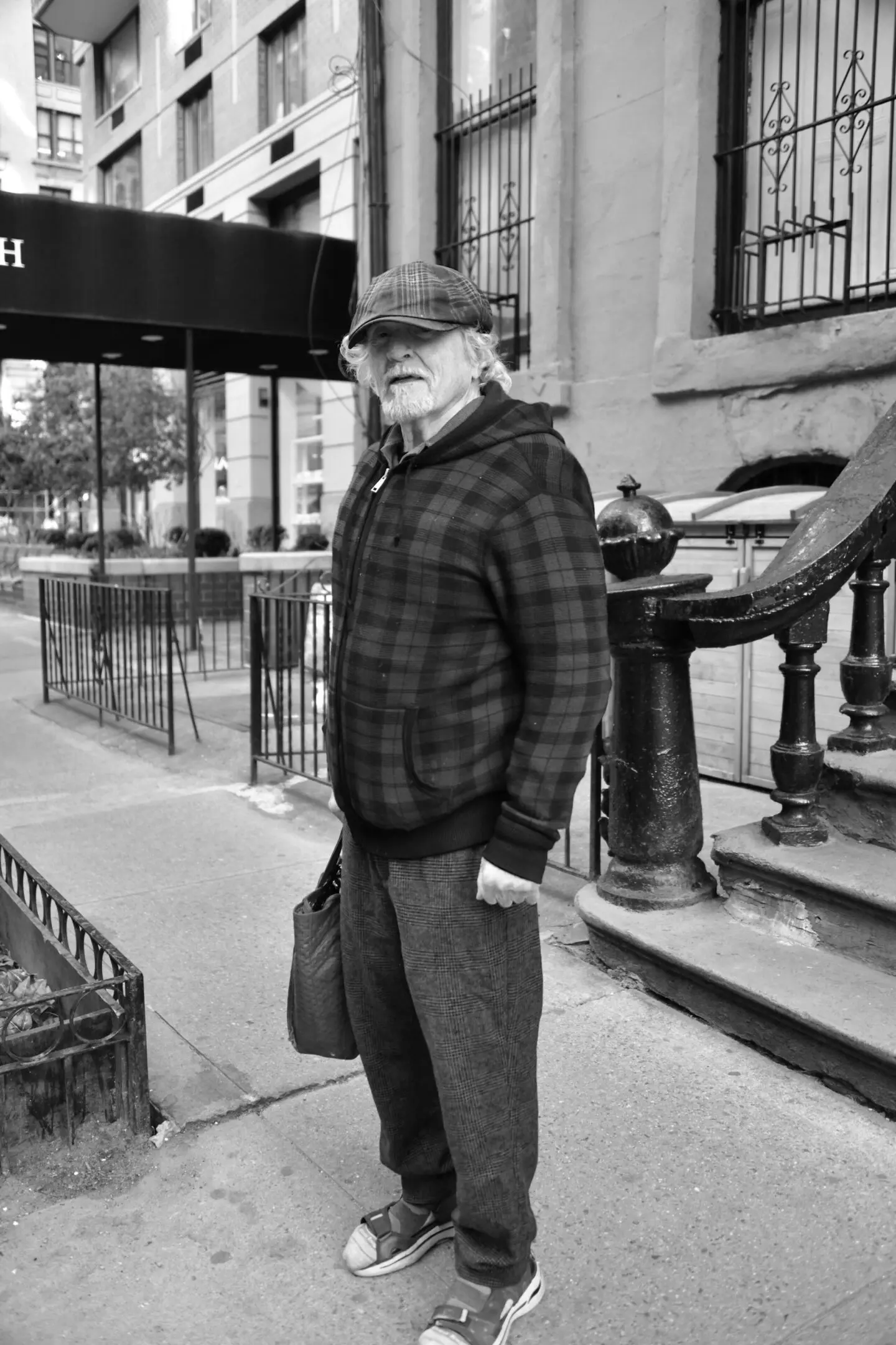 Older man in a checkered jacket and cap standing on a city sidewalk.