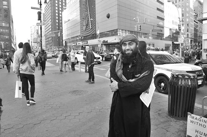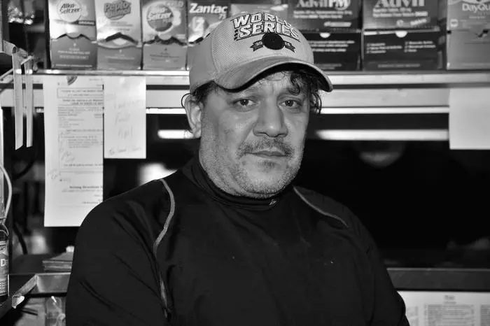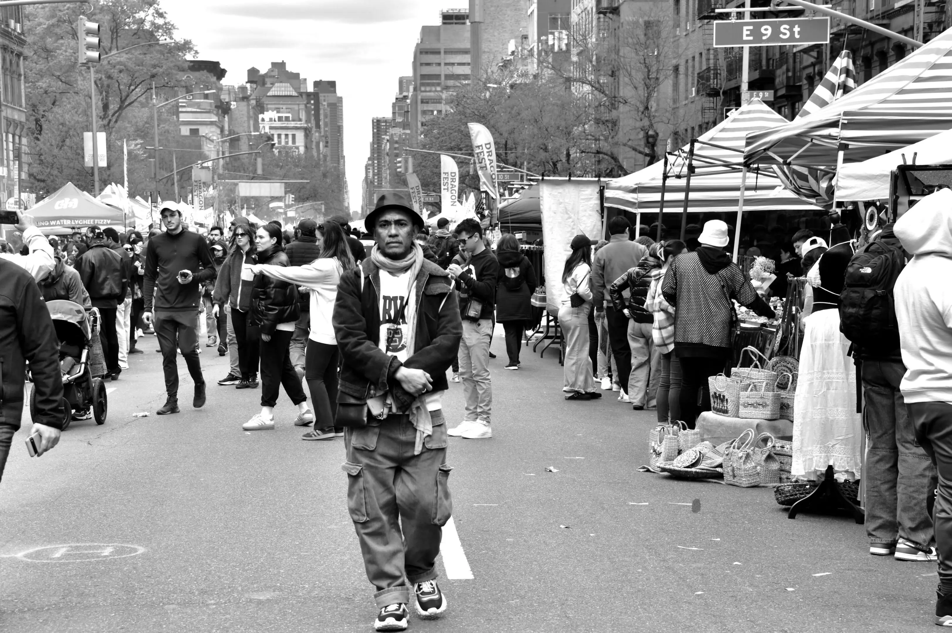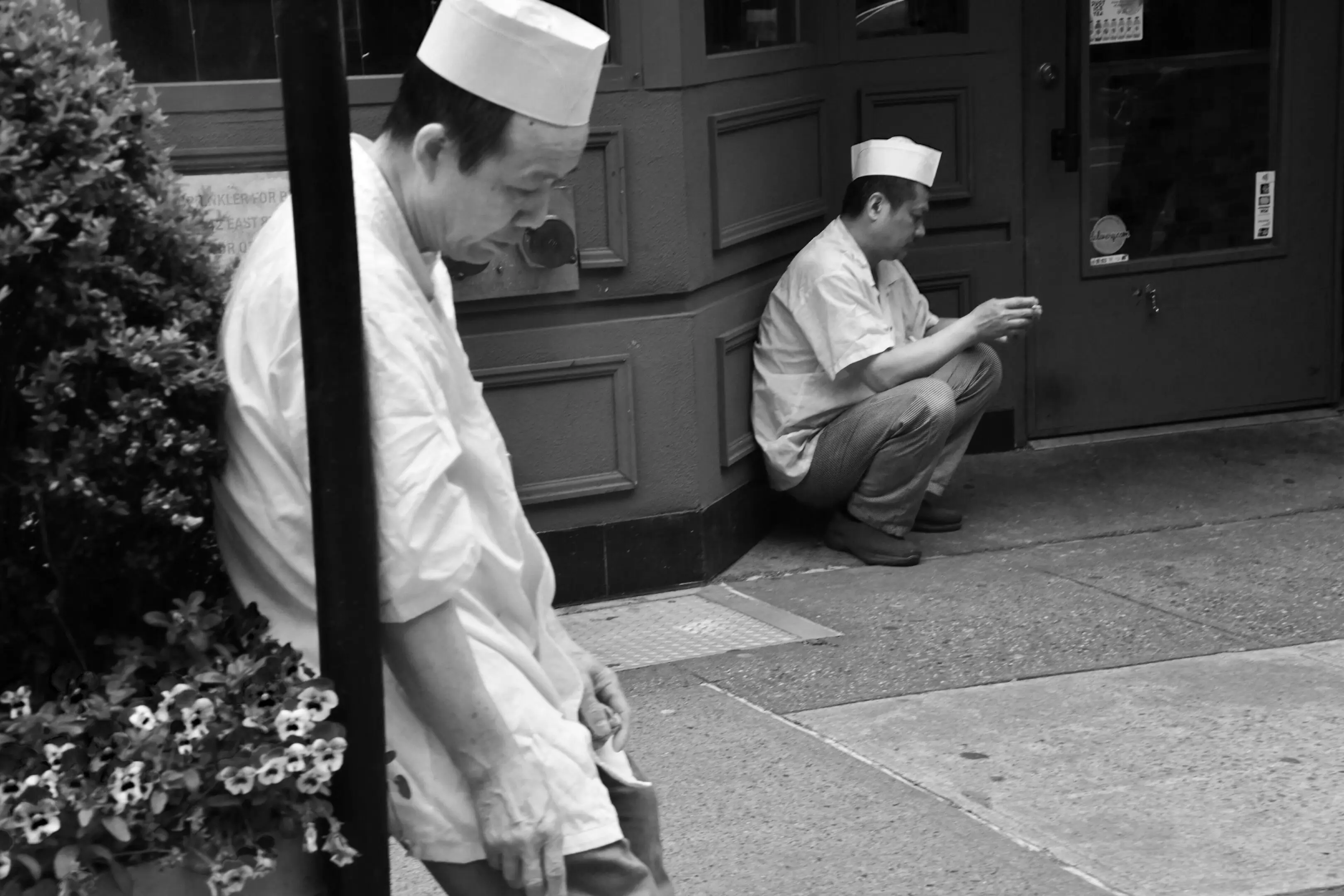Older man in a checkered jacket and cap standing on a city sidewalk.