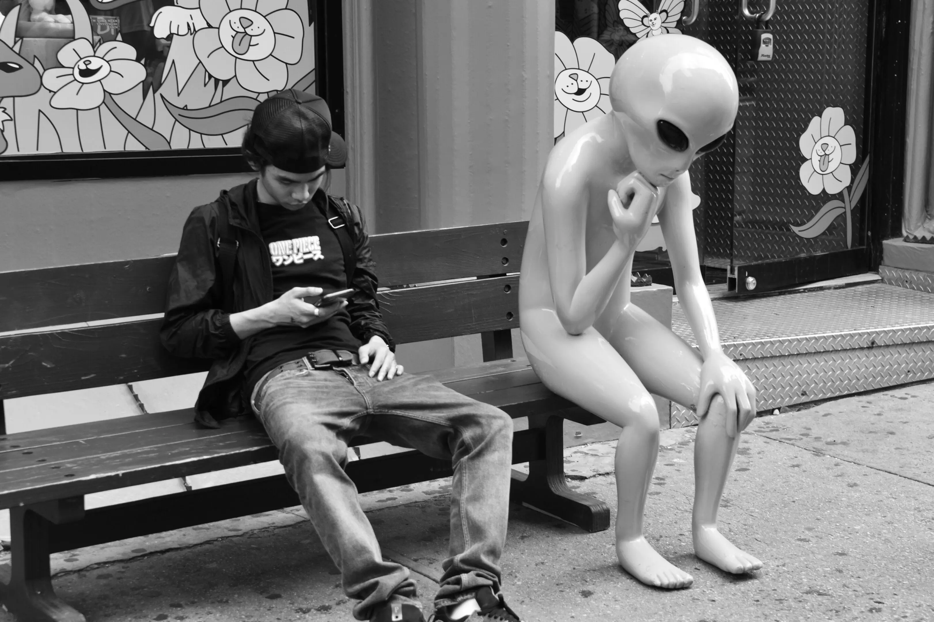 A person and an alien figure sit on a bench, both absorbed in their phones.