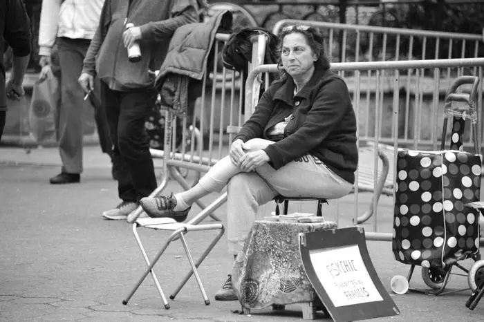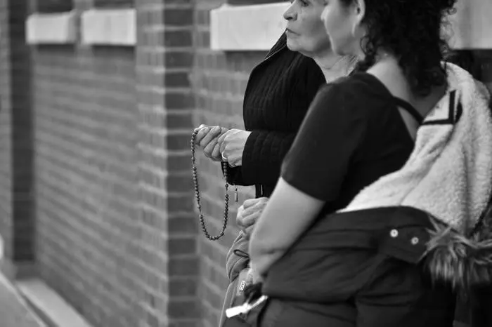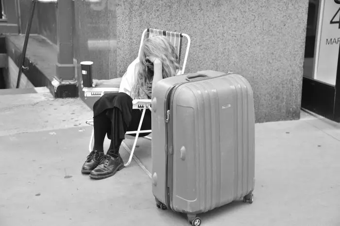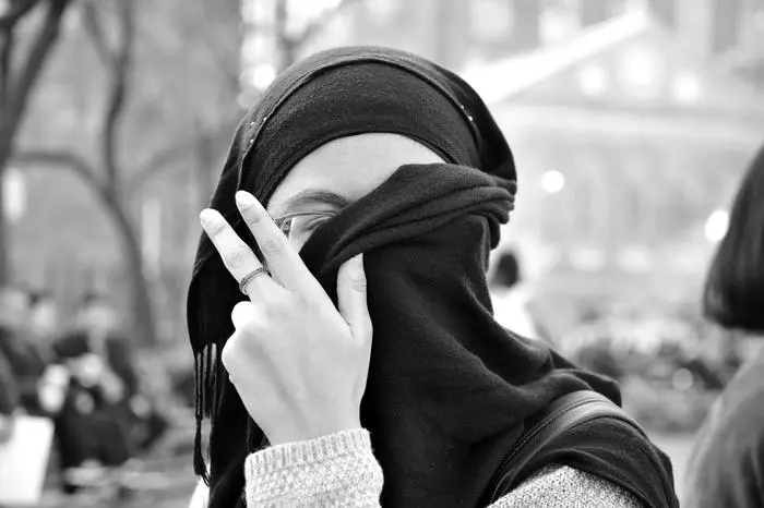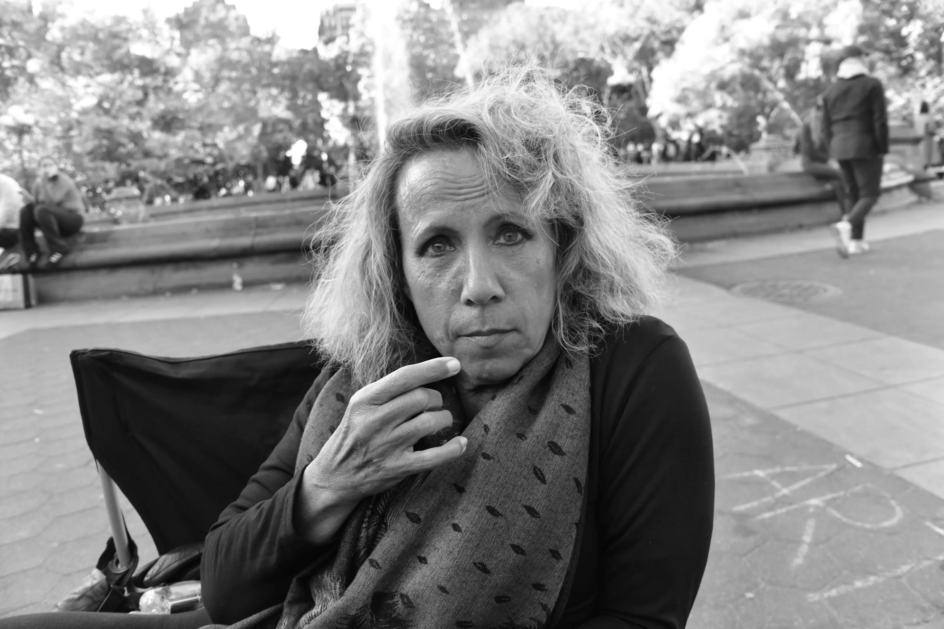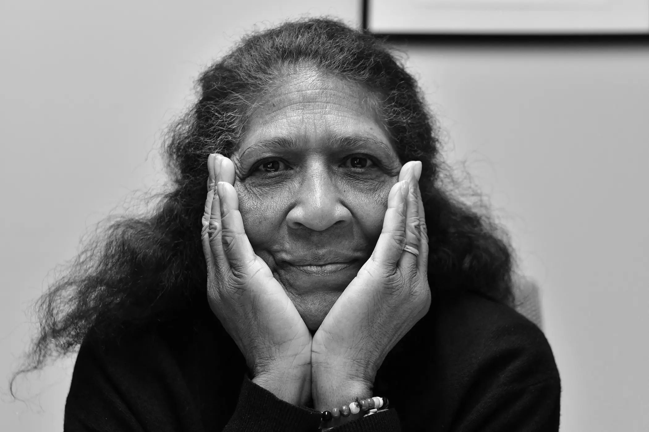 A person sitting alone by a lakeside, wrapped in a shawl.