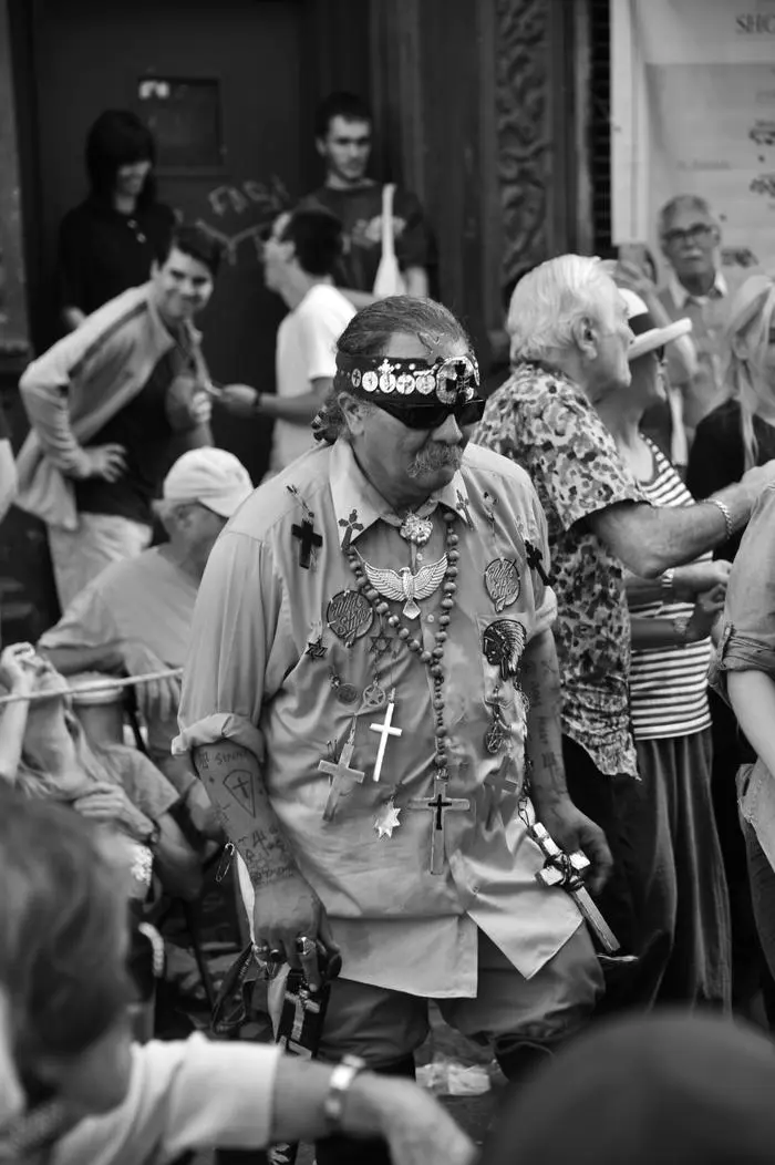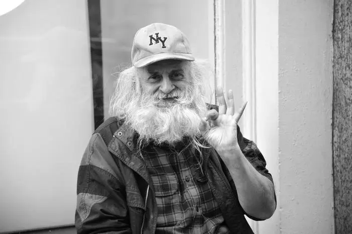 Elderly man in overalls and beret smiling outdoors in an urban setting.