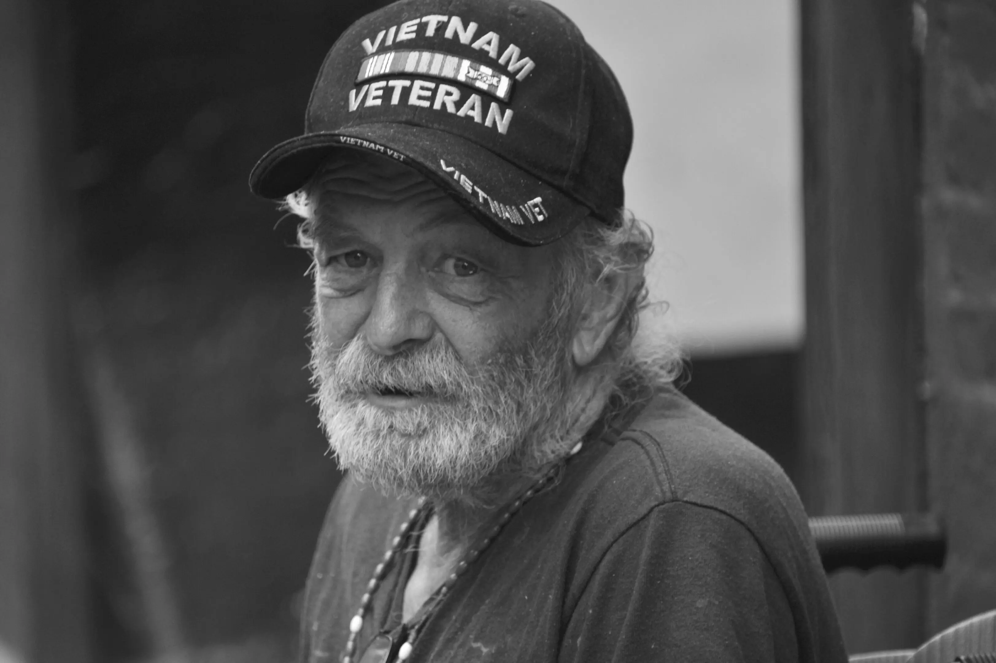 Portrait of an elderly Vietnam veteran wearing a cap.