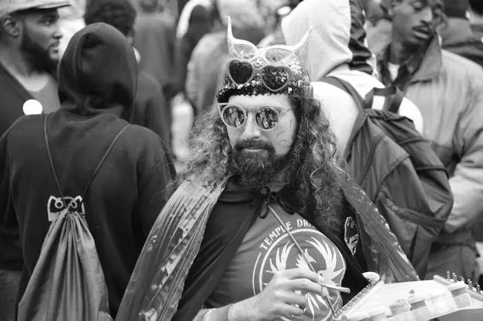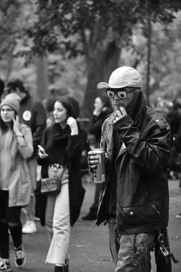 Man walking on city sidewalk wearing a raccoon hat and headphones.