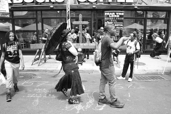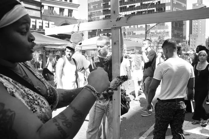 Man in apron playfully posing with boxing stance on city sidewalk.