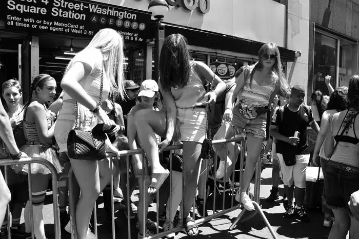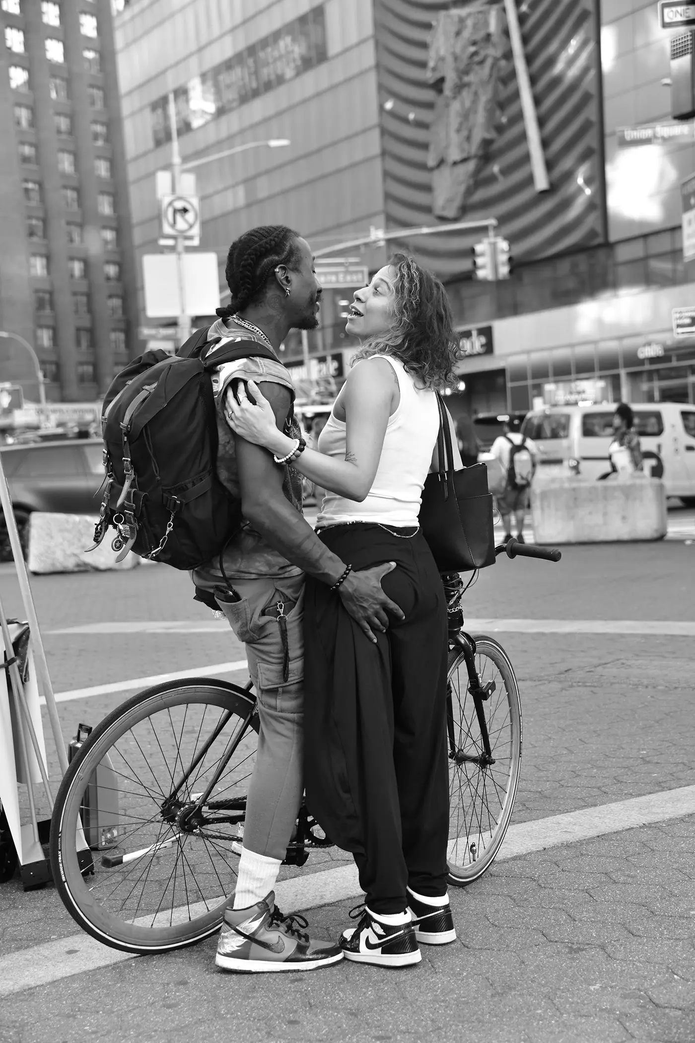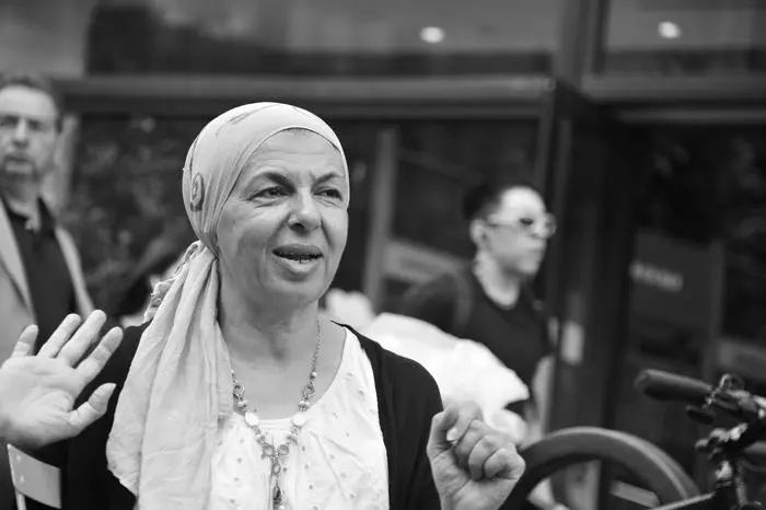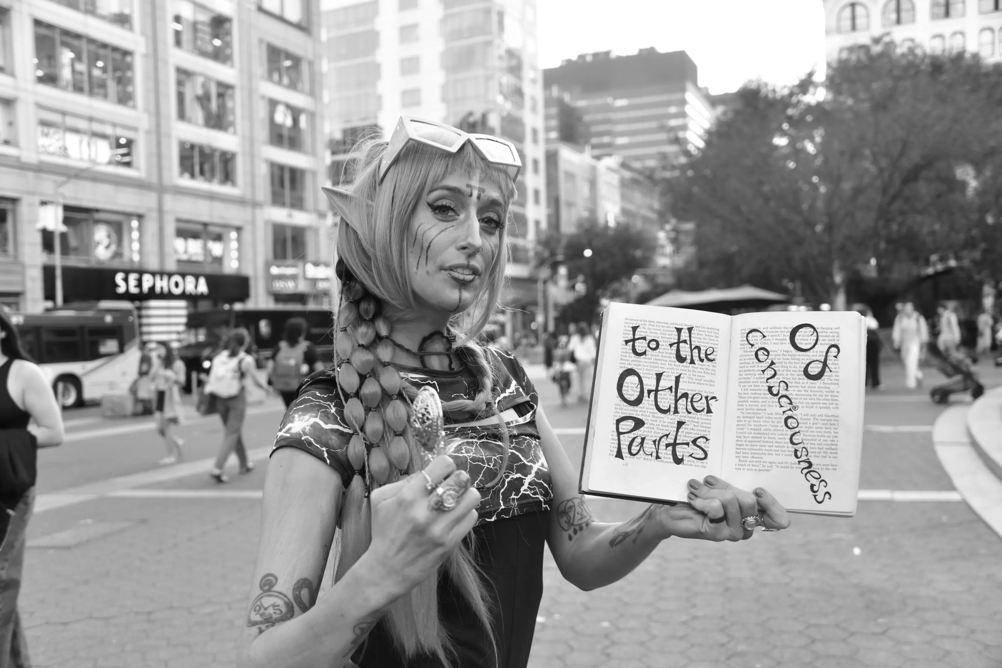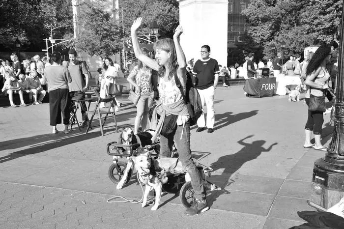 A woman joyfully posing on a city sidewalk, raising one arm.