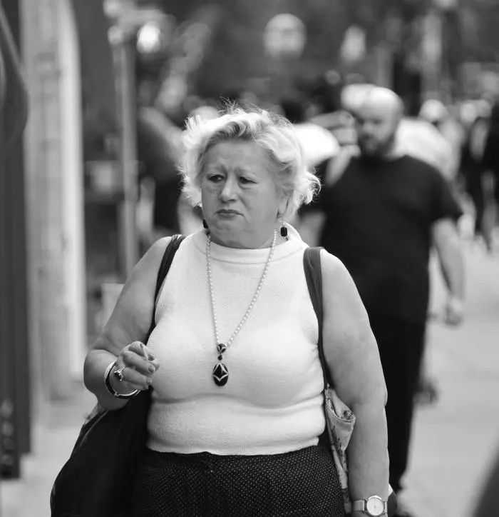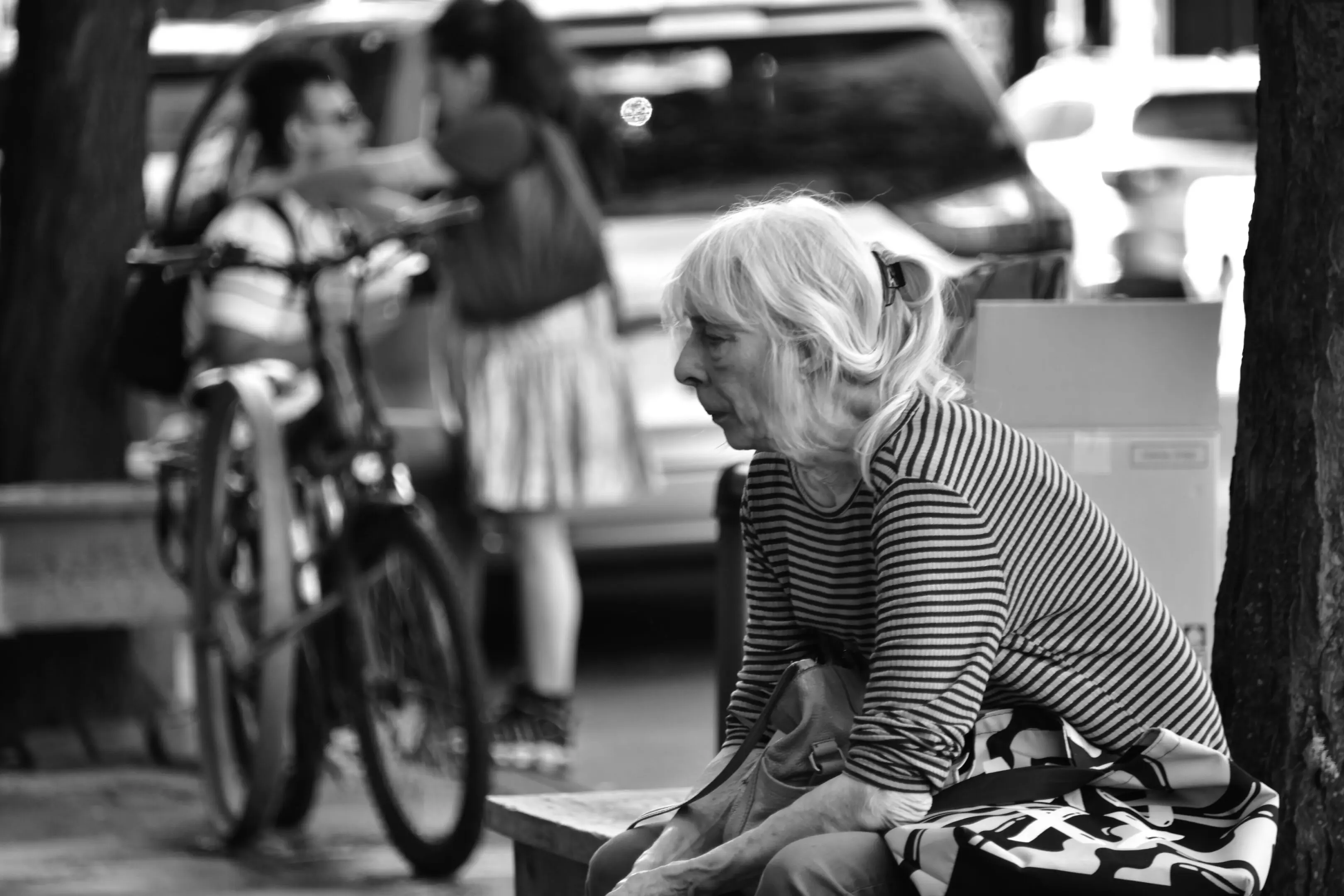 Elderly woman sitting thoughtfully on a bench outdoors.