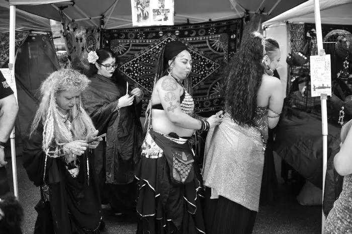 Woman in vintage leopard print dress holding a feather fan outdoors.