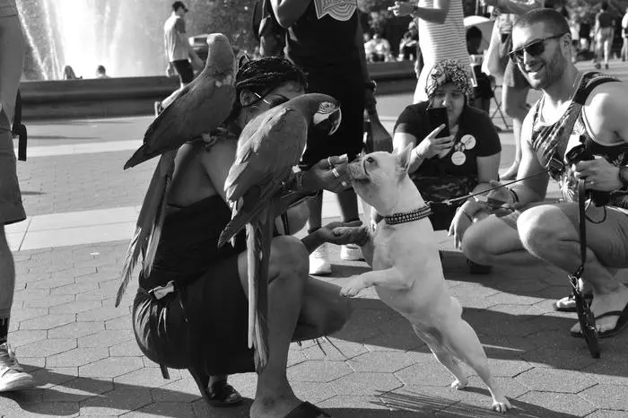 Woman wearing sunglasses and a leopard print coat holding a small dog.