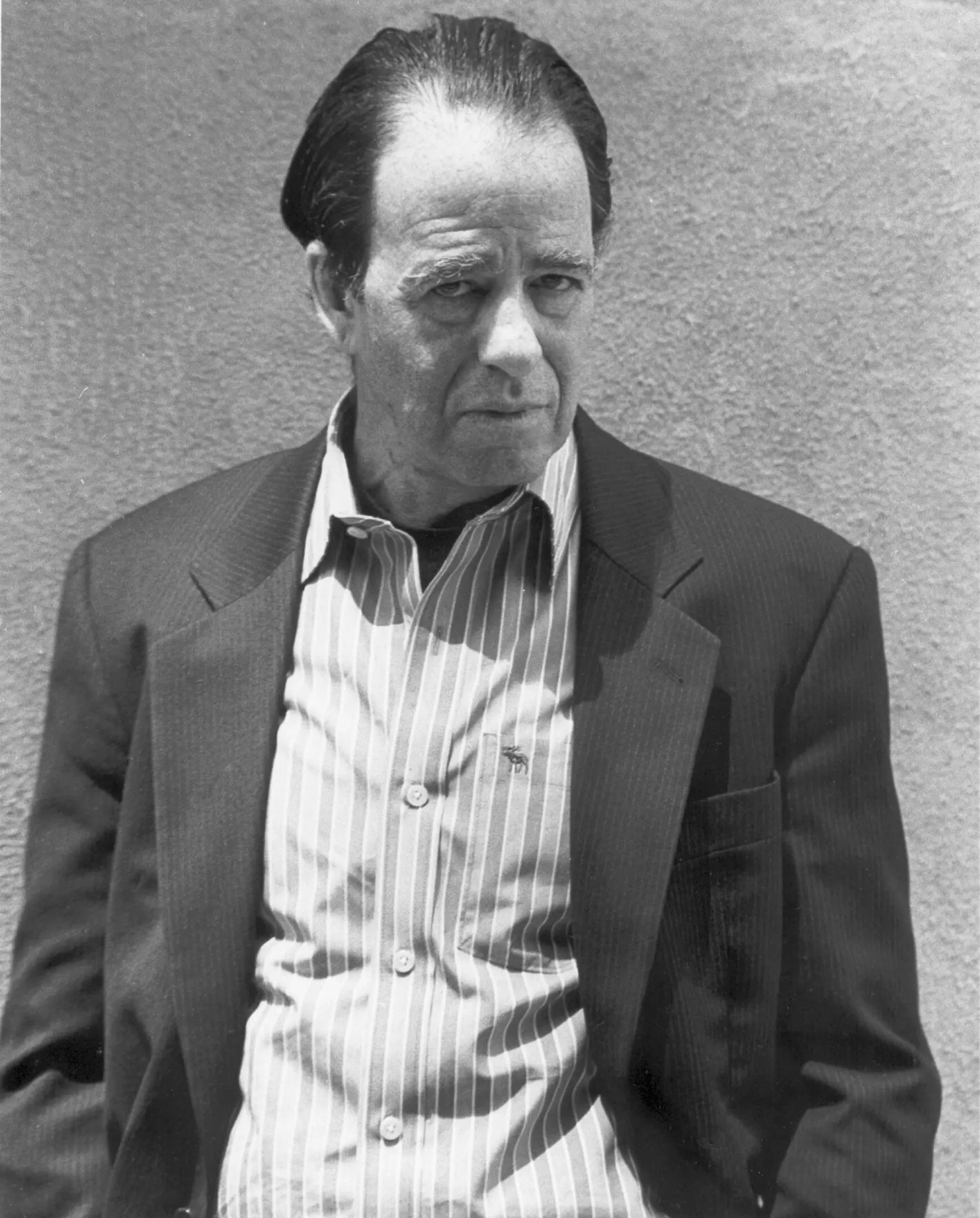 Black and white photo of an older man smoking a pipe, sitting contemplatively.