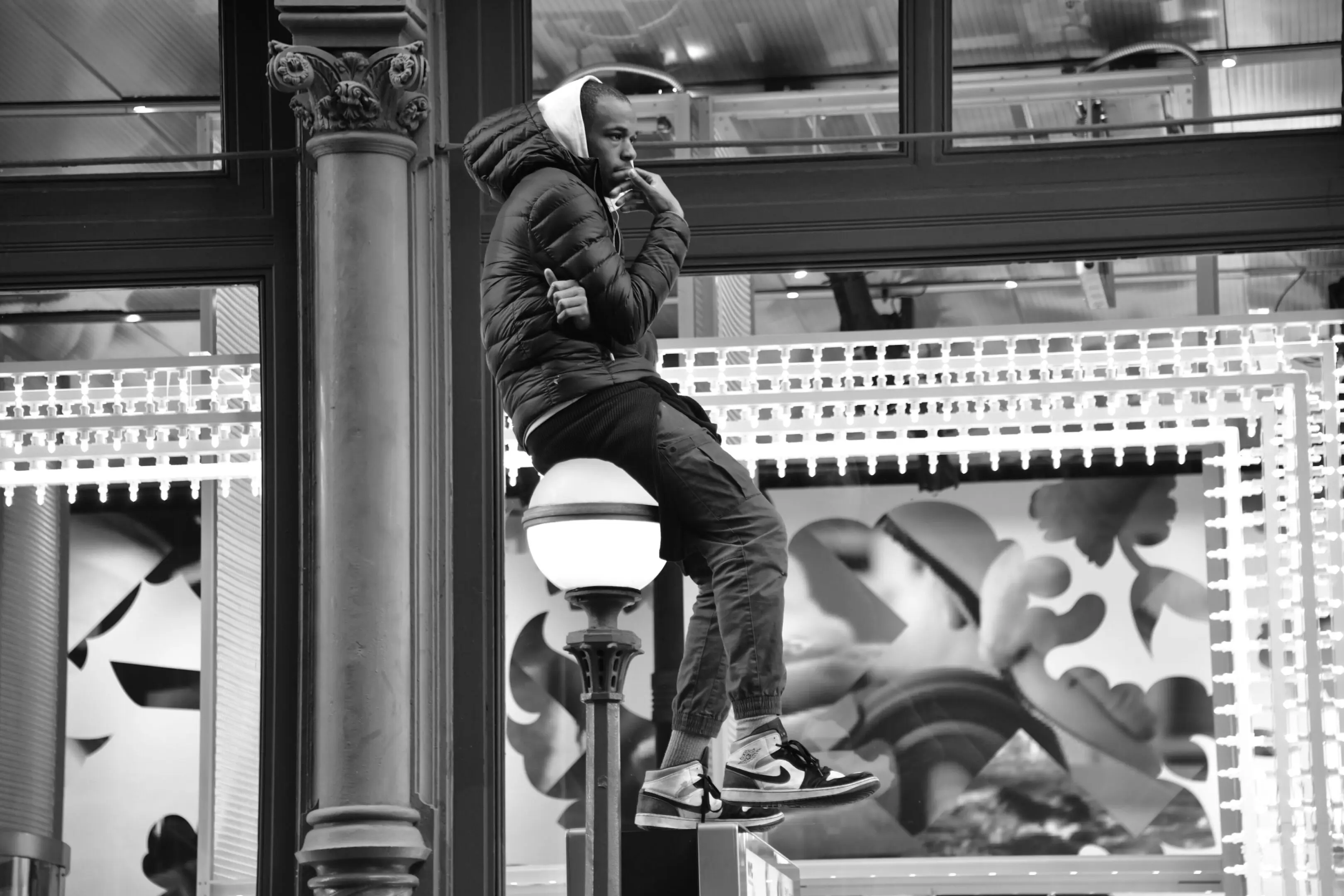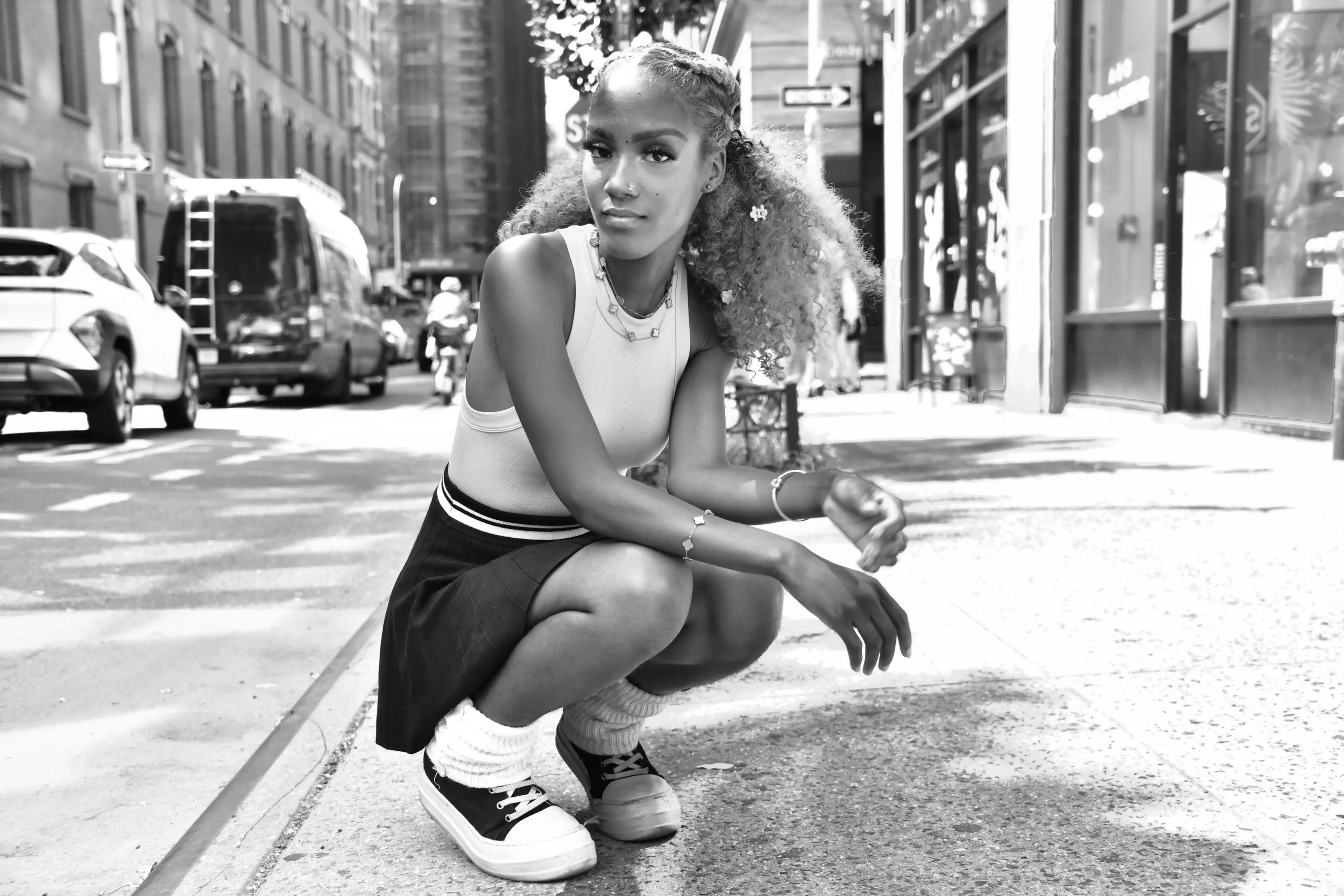 Young woman crouching on city street in sporty outfit and Nike shoes.
