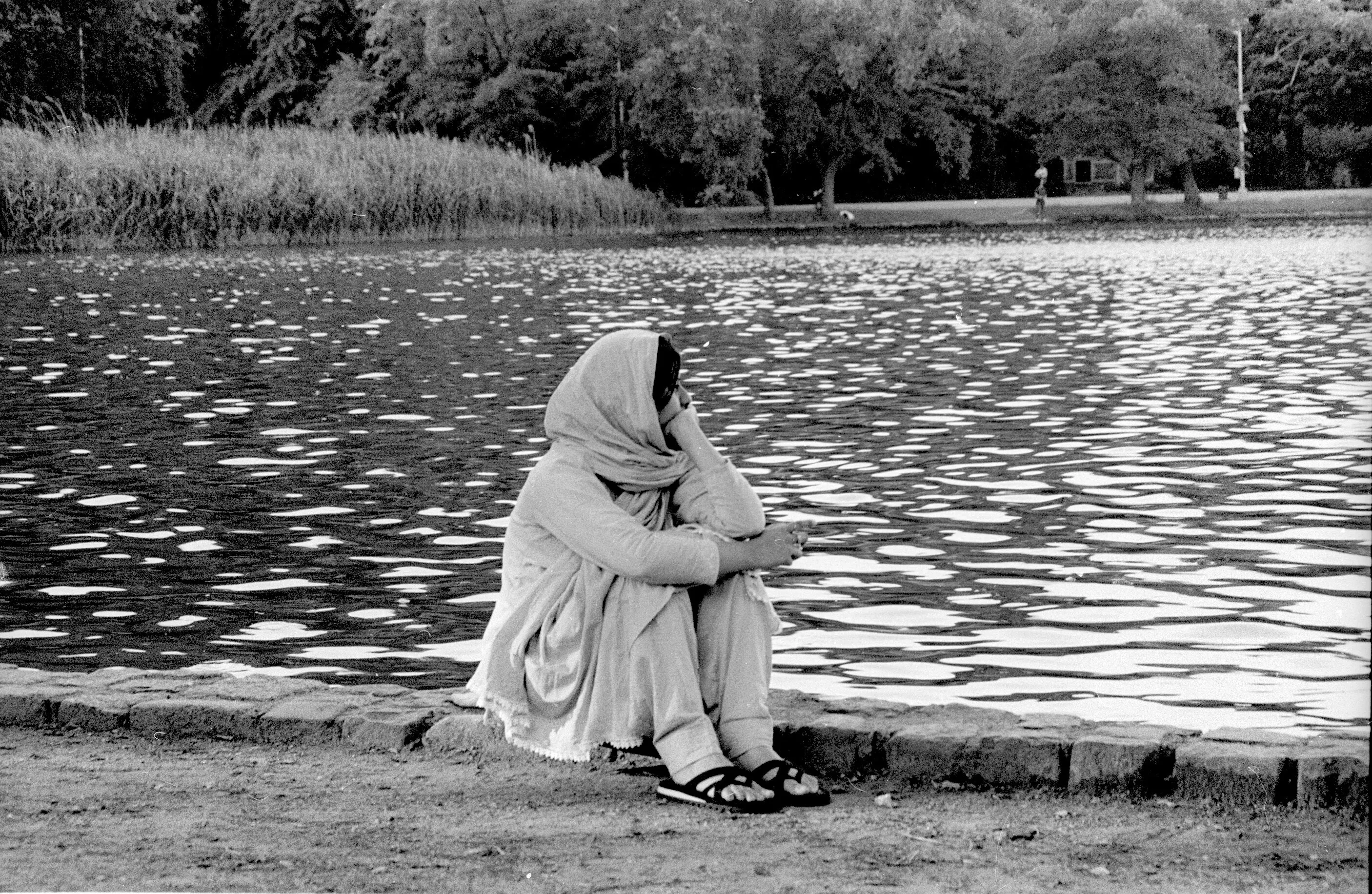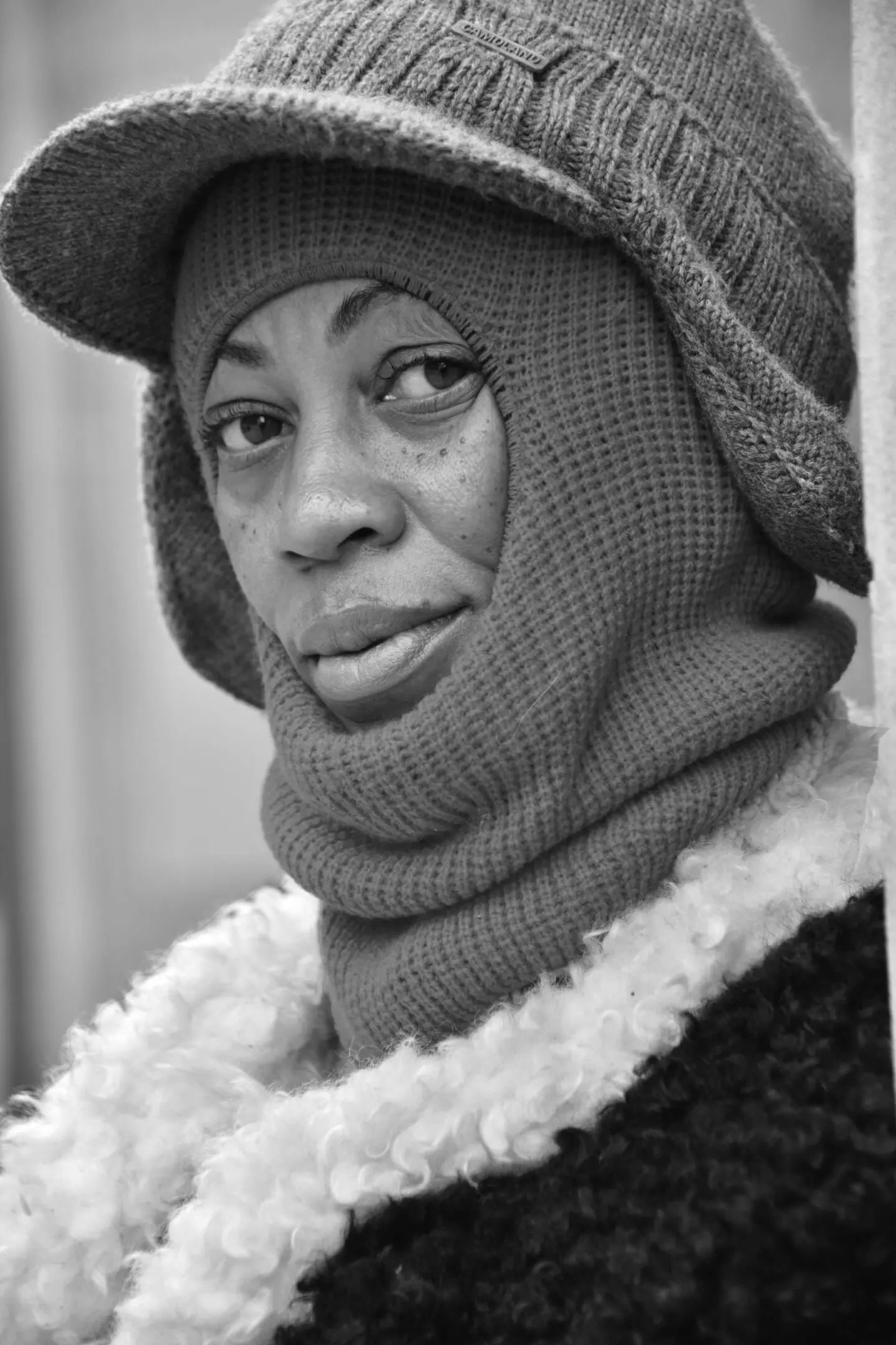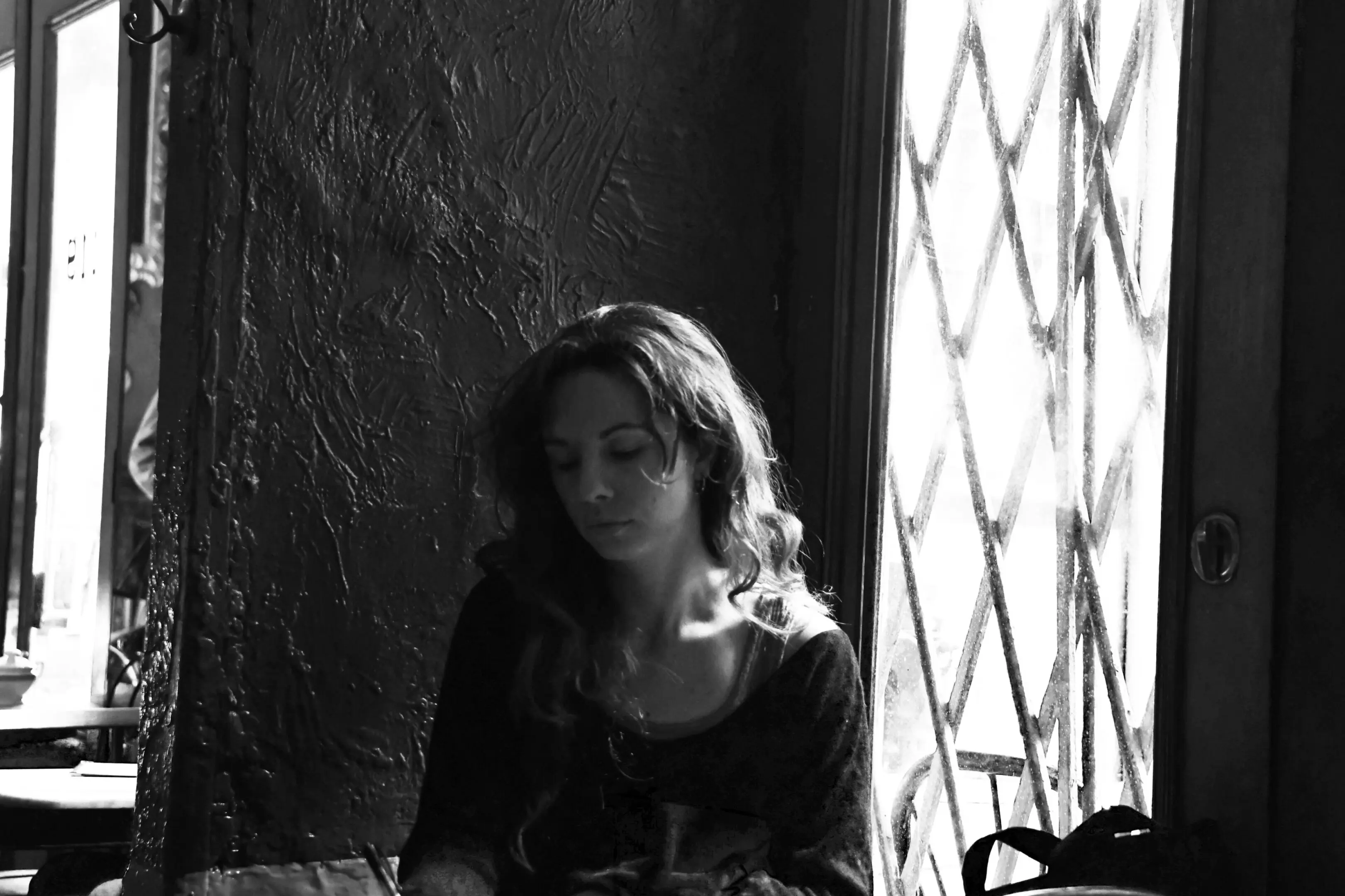 Black and white portrait of a woman with a contemplative expression outdoors.