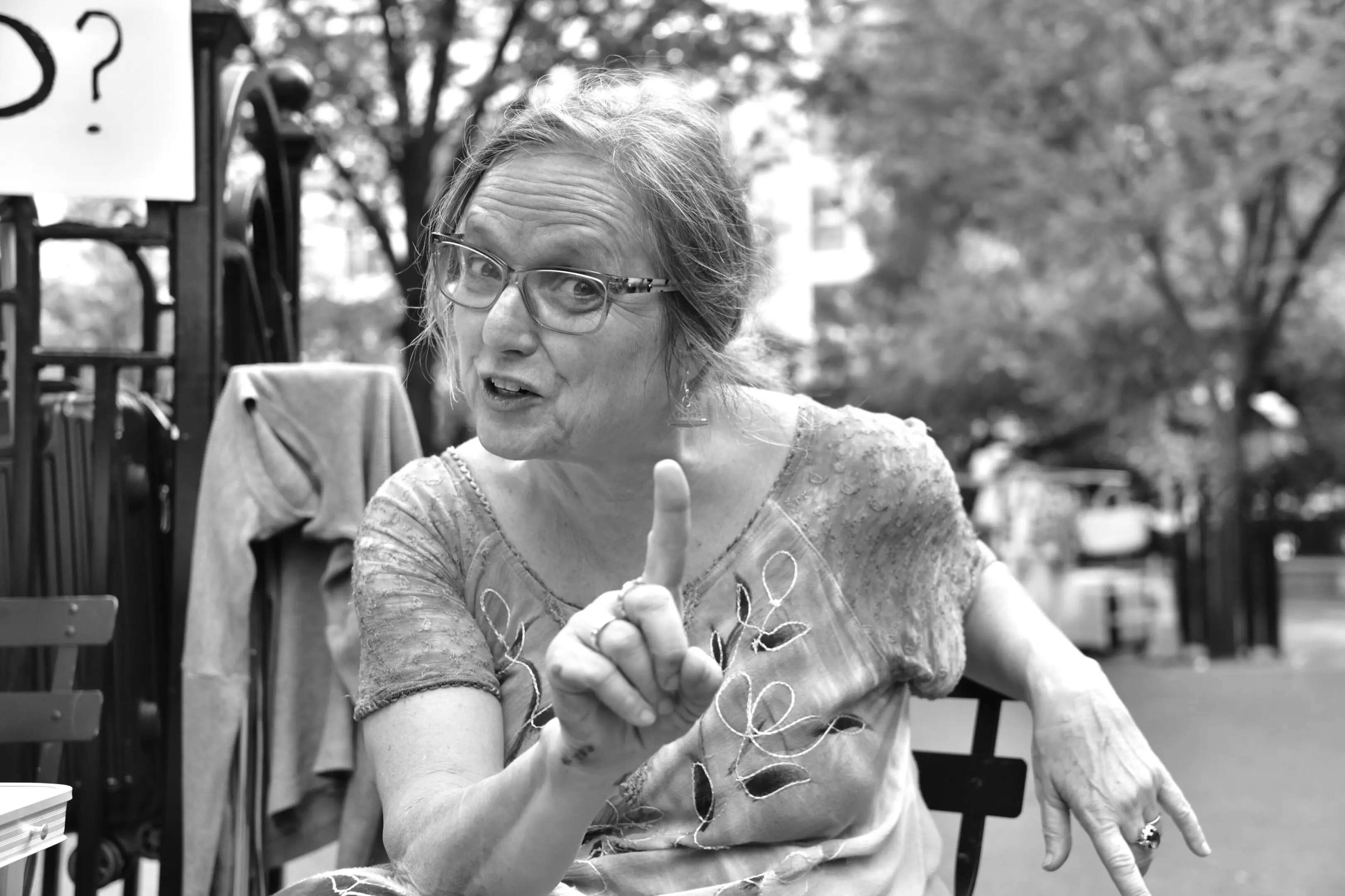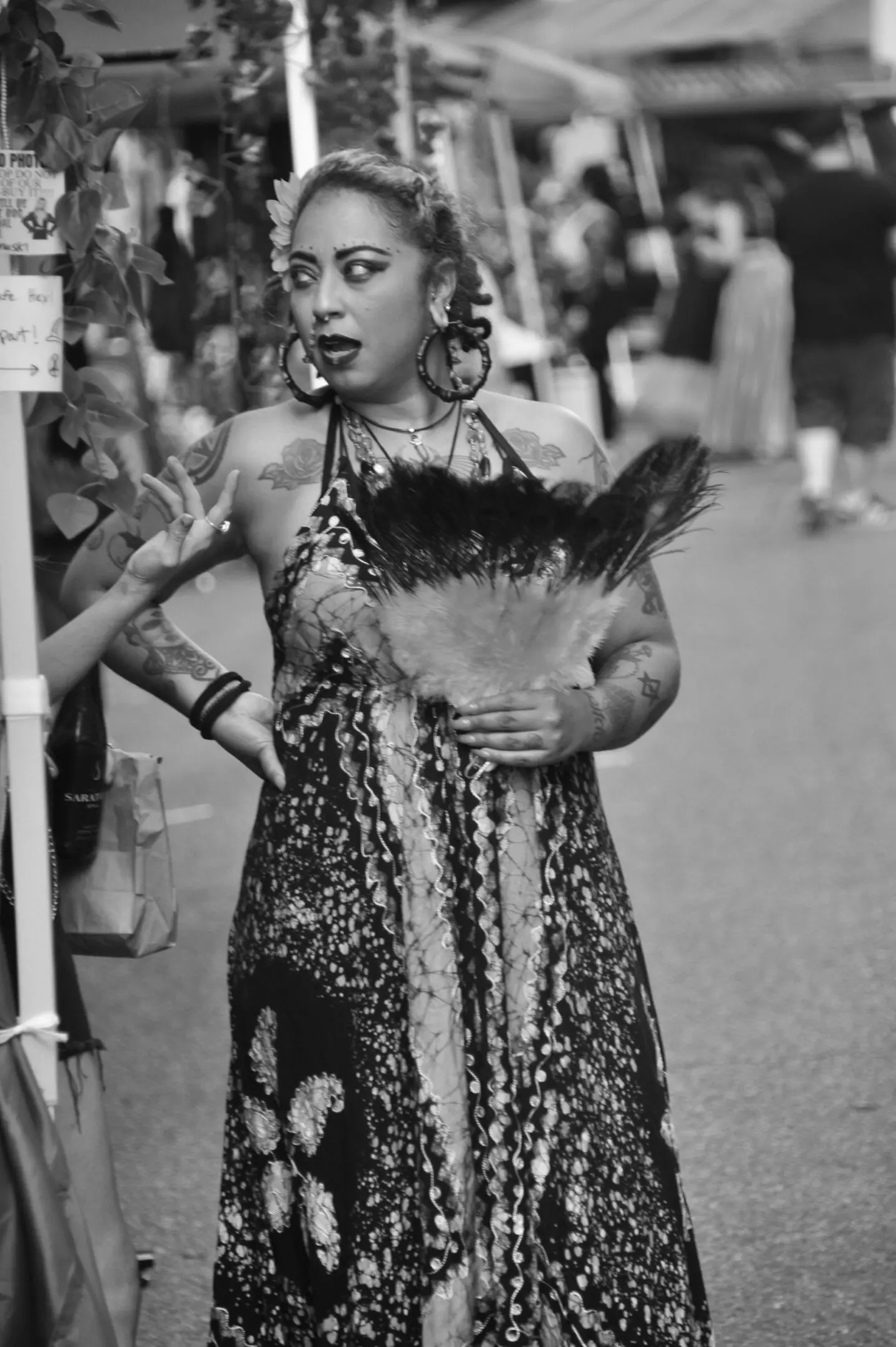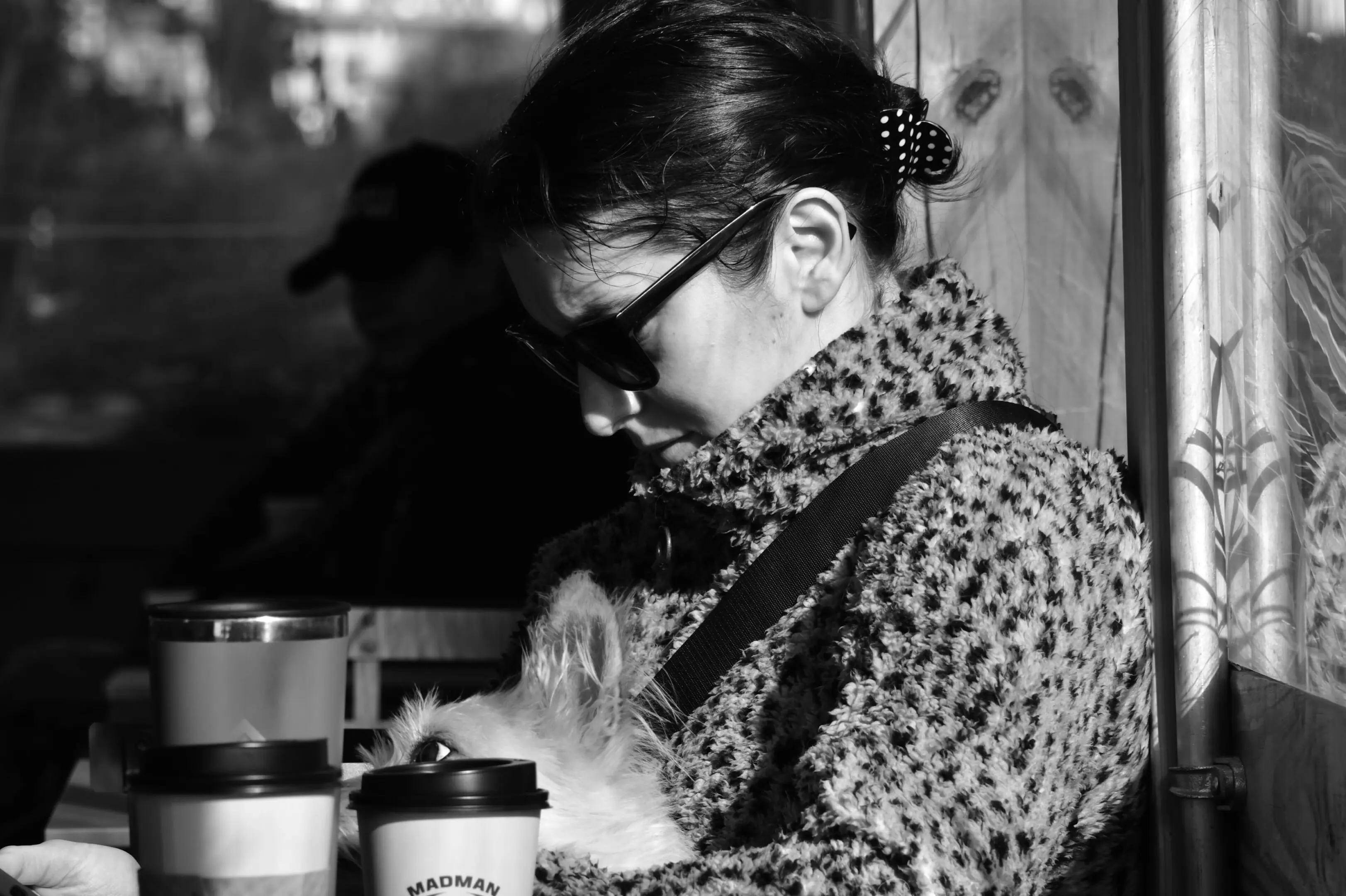 Black and white portrait of a woman with a contemplative expression outdoors.