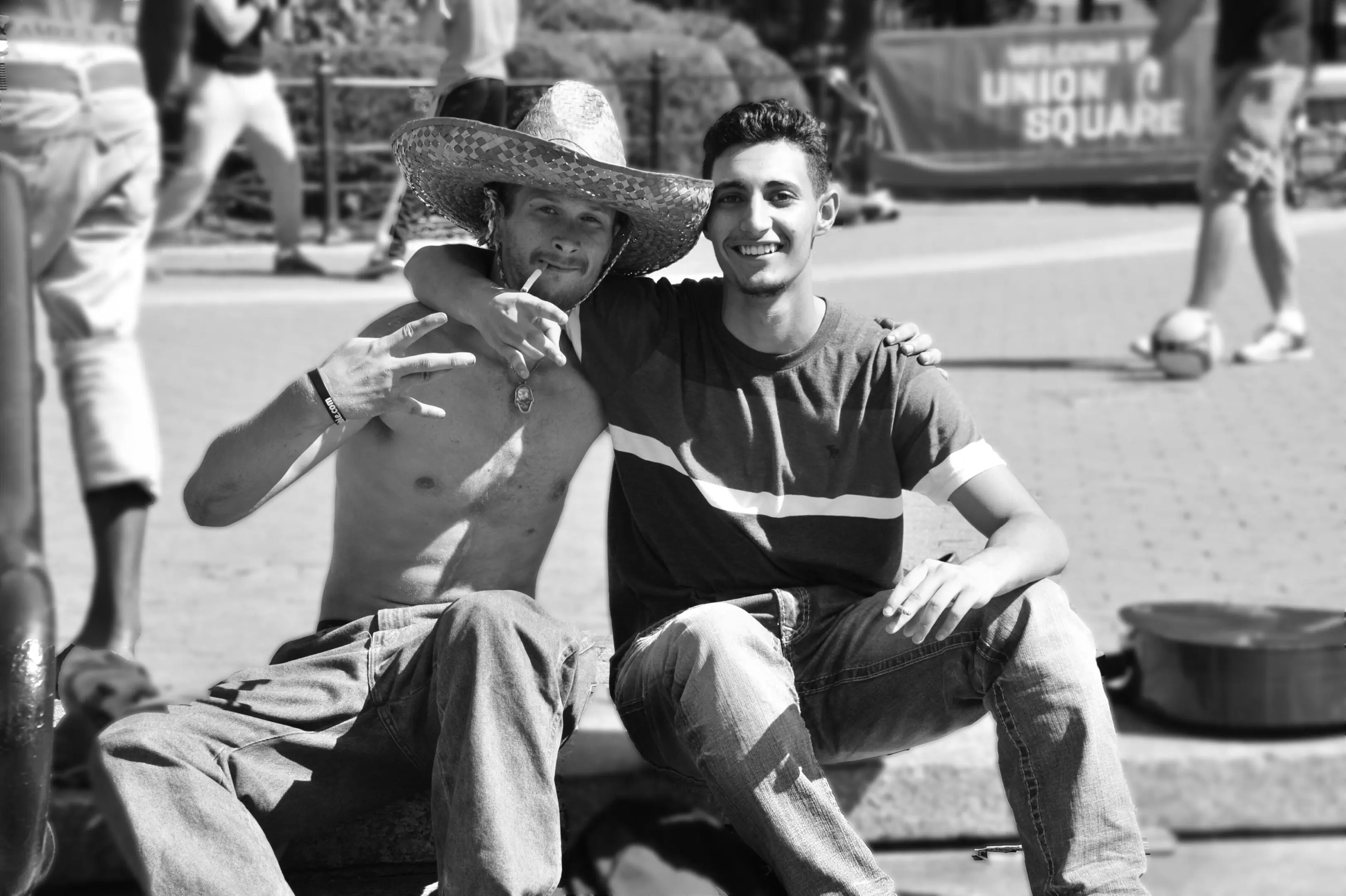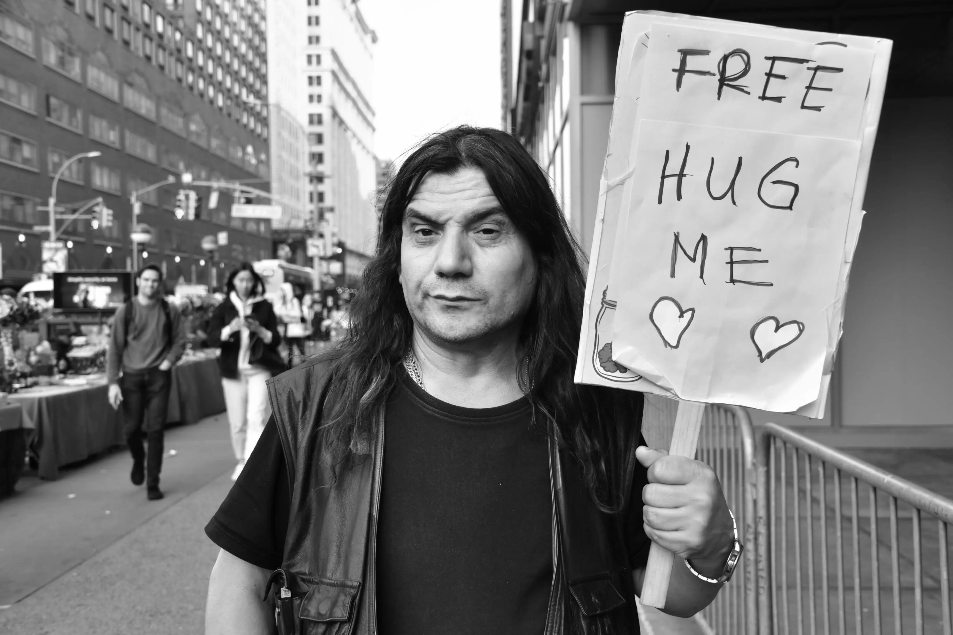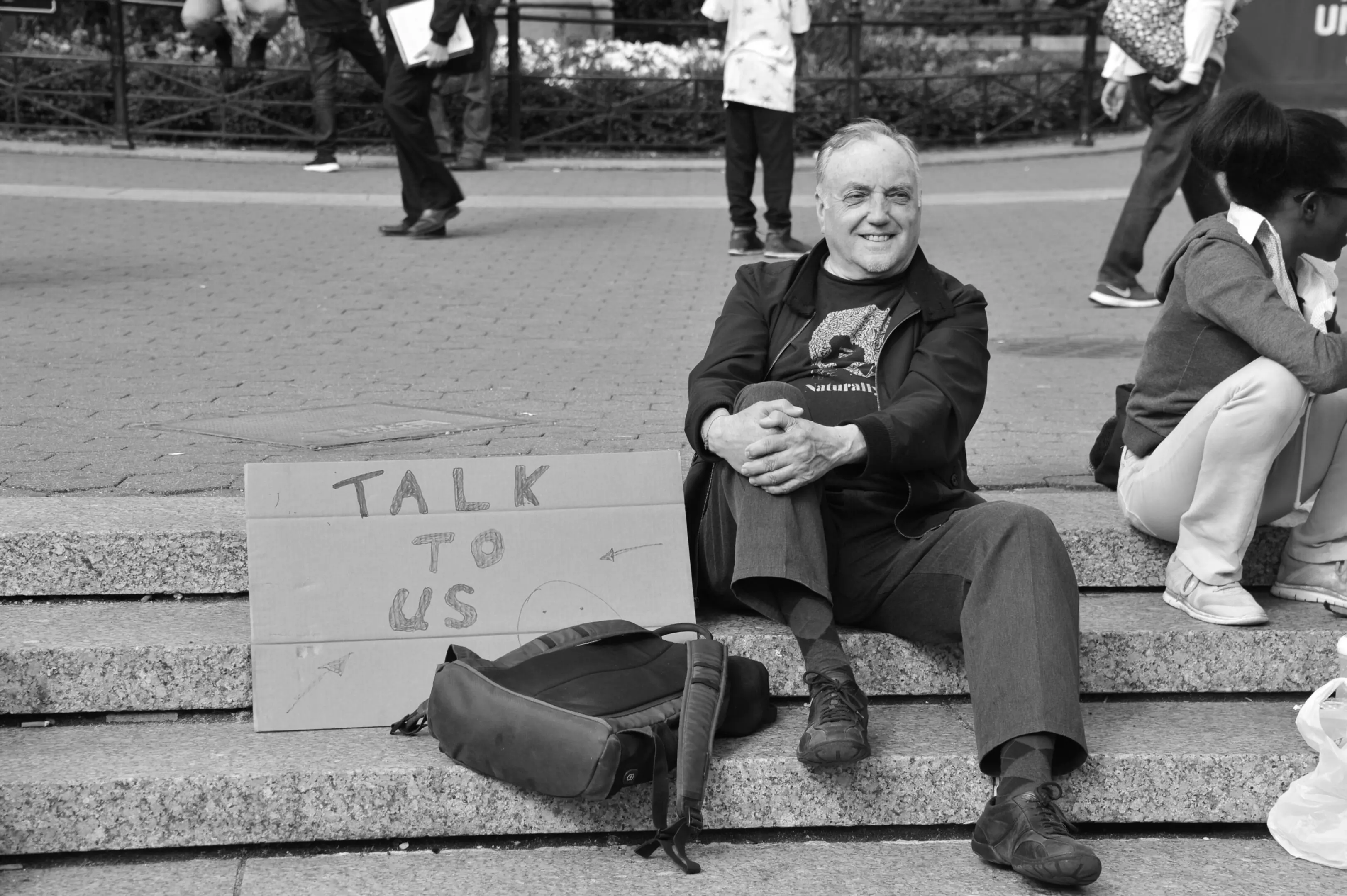 A man sitting on a curb with a sign that says 'Talk to Us'.