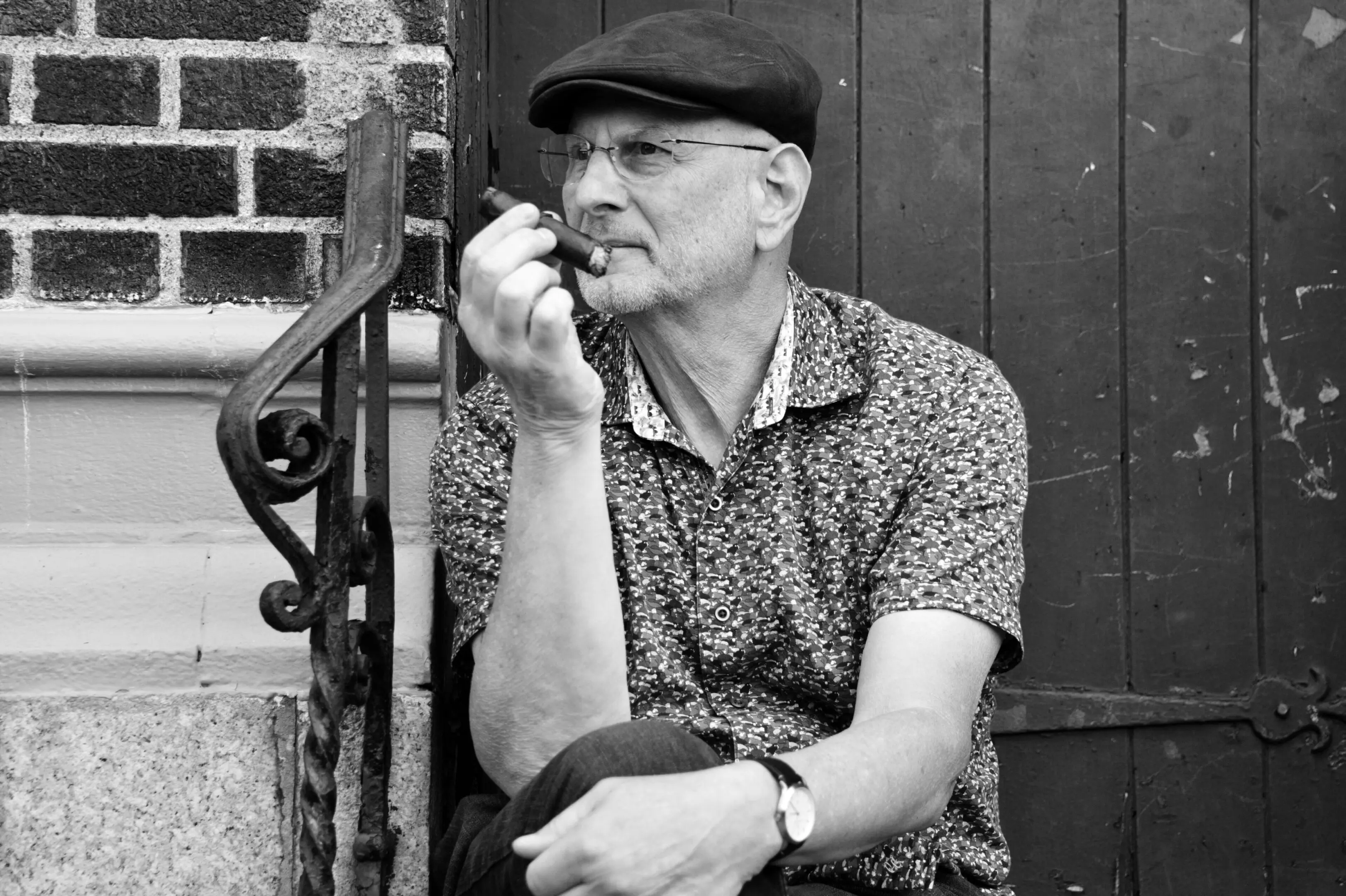 Older man with a pipe sitting outdoors, wearing a cap and patterned shirt.