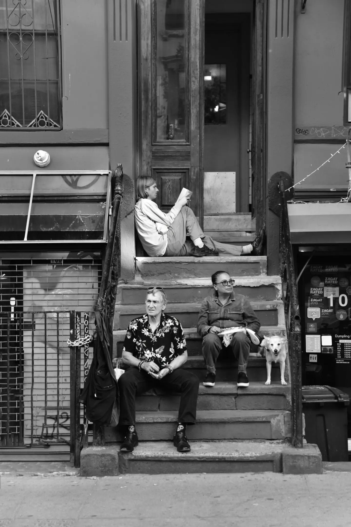 Two men in traditional attire sitting outside a building, one on the ground and one on a stoop.