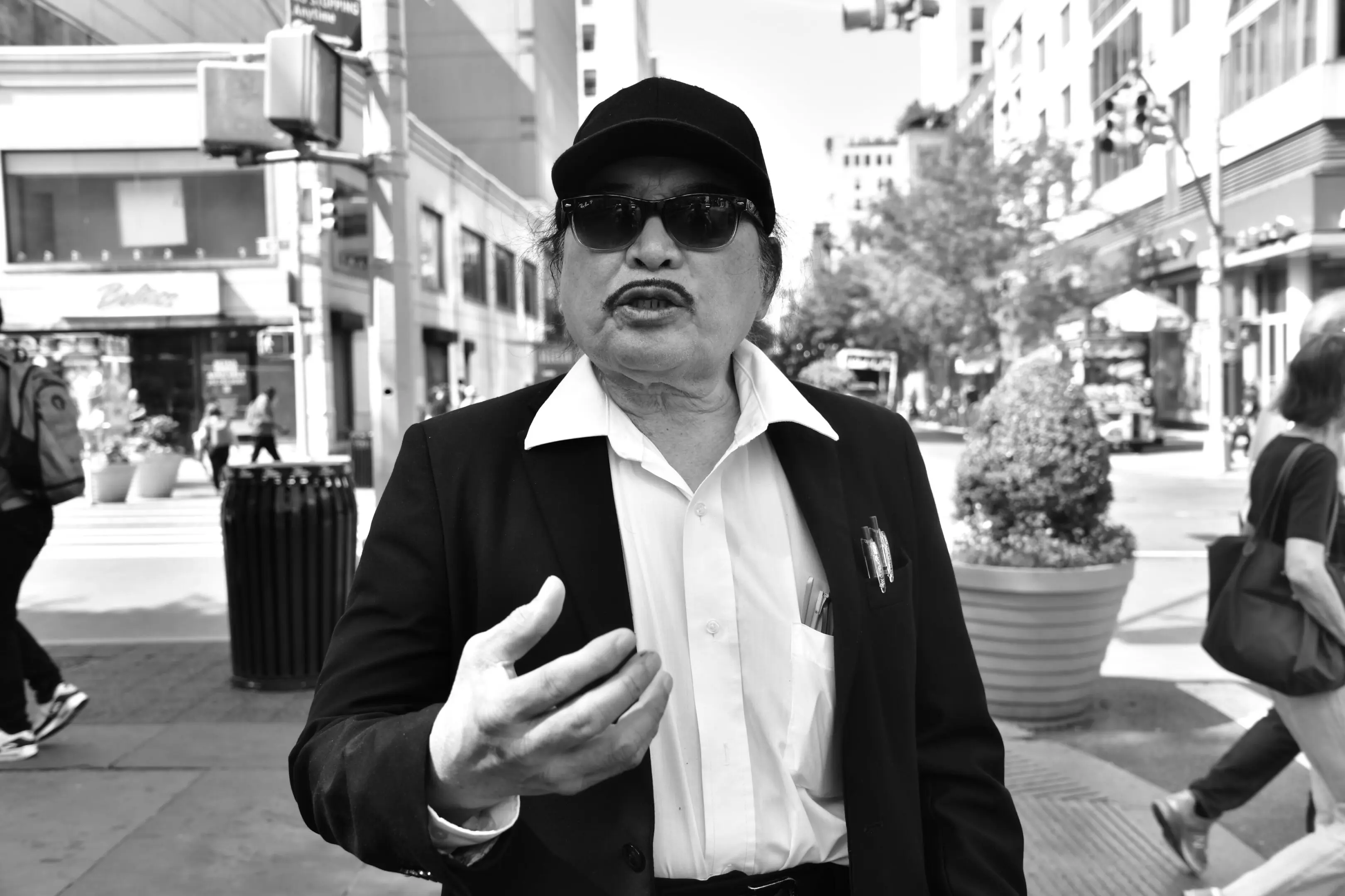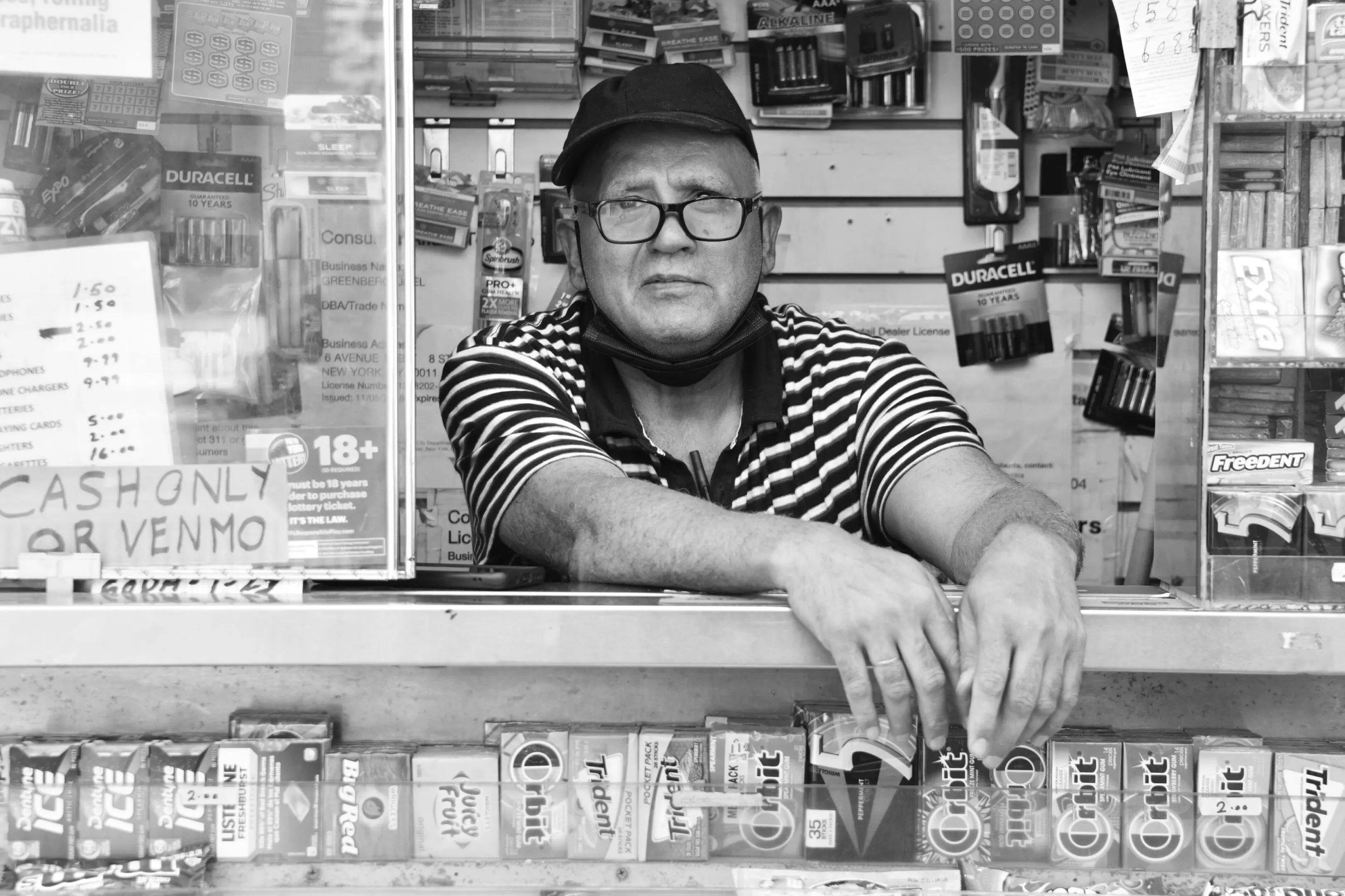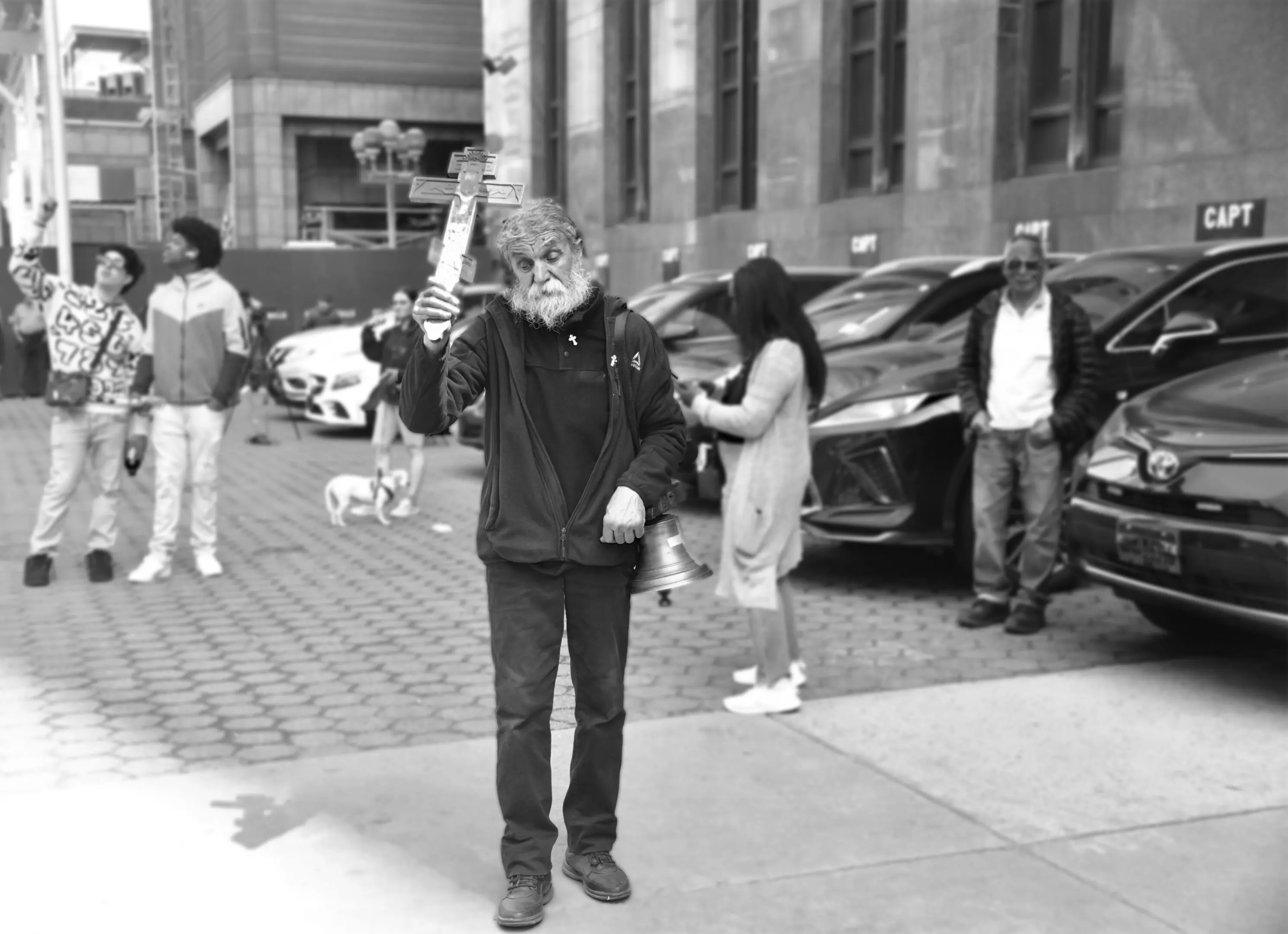 An elderly man in a plaid jacket and cap stands on a city sidewalk.