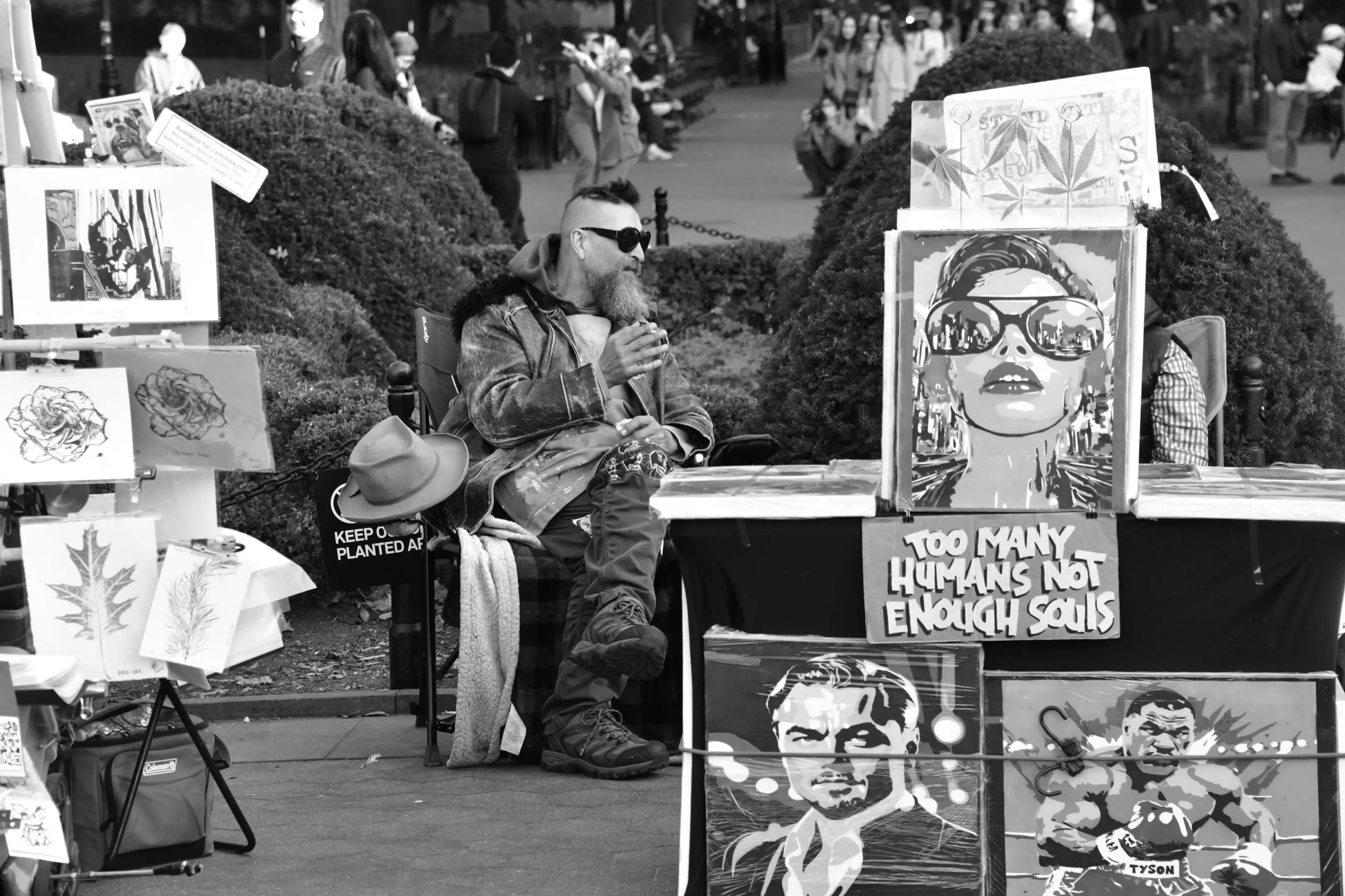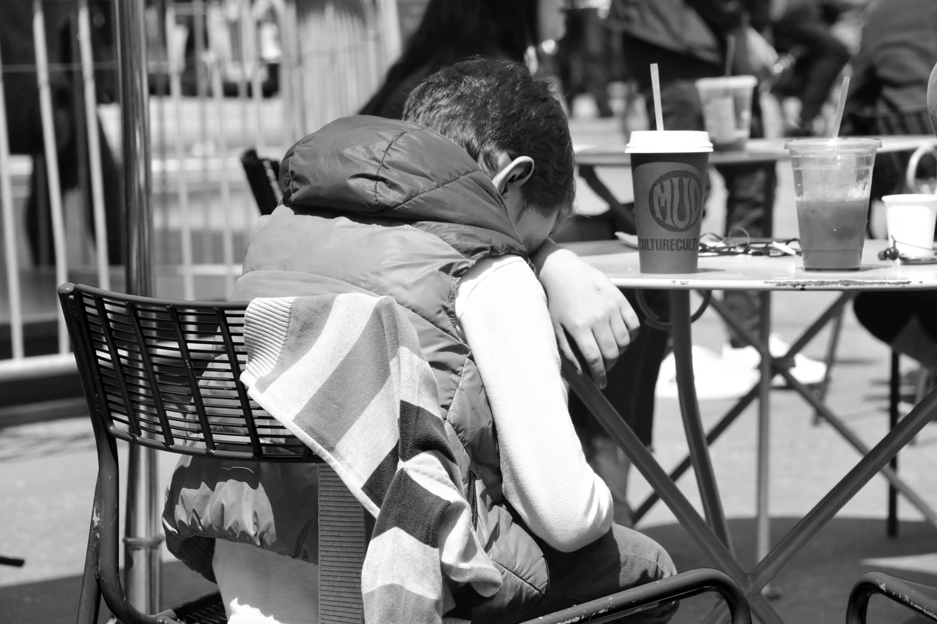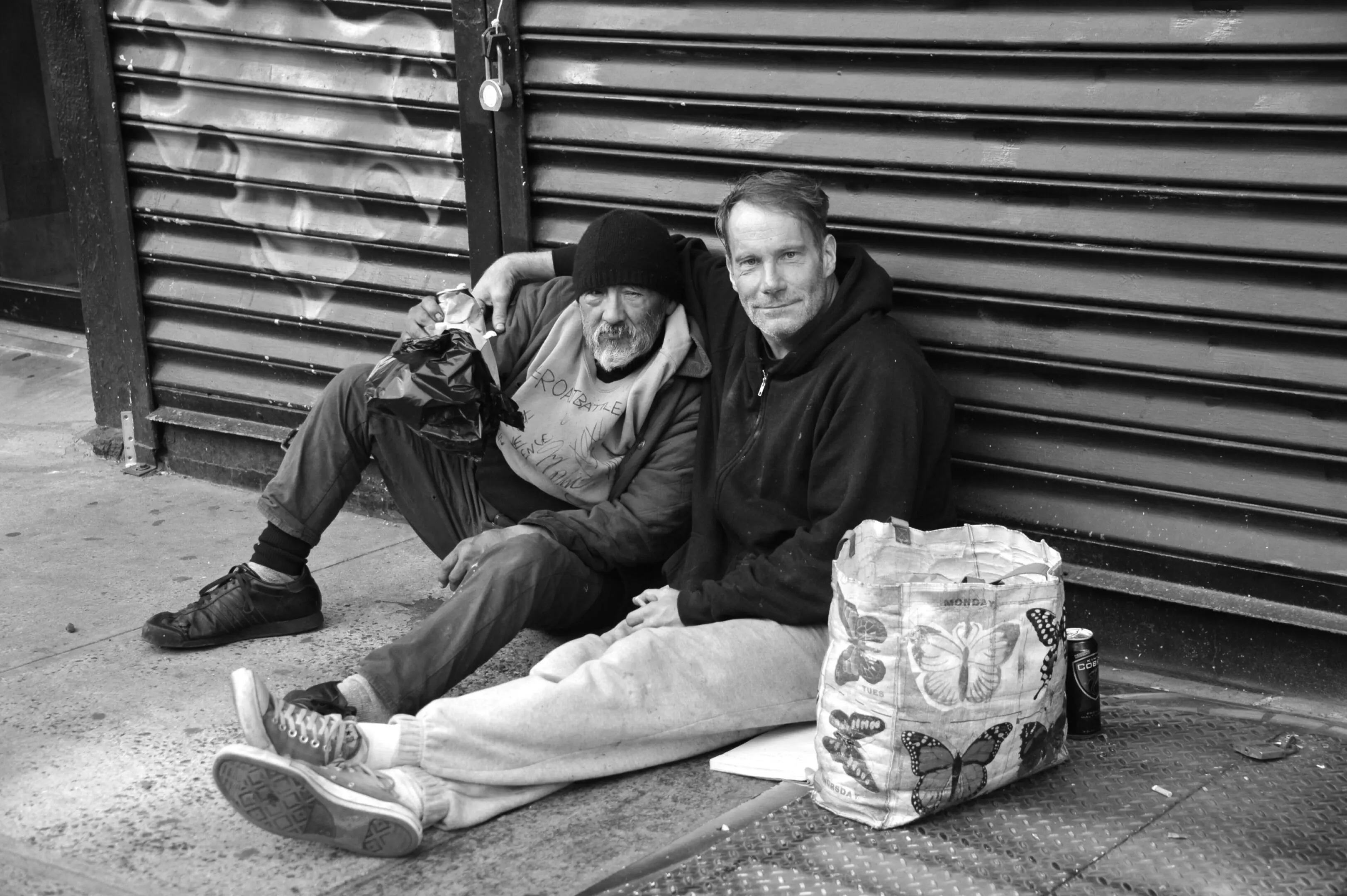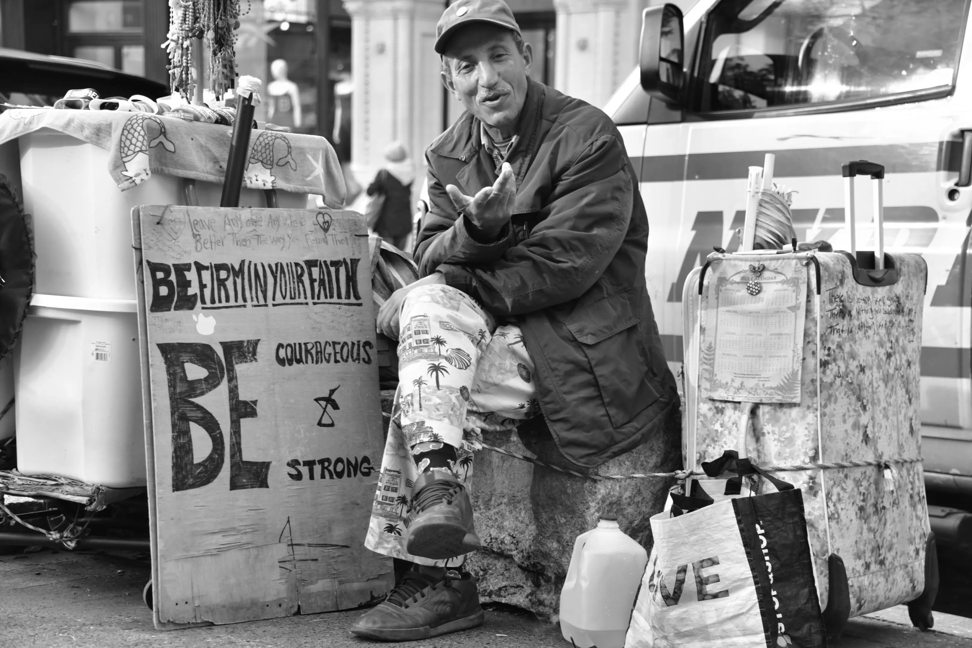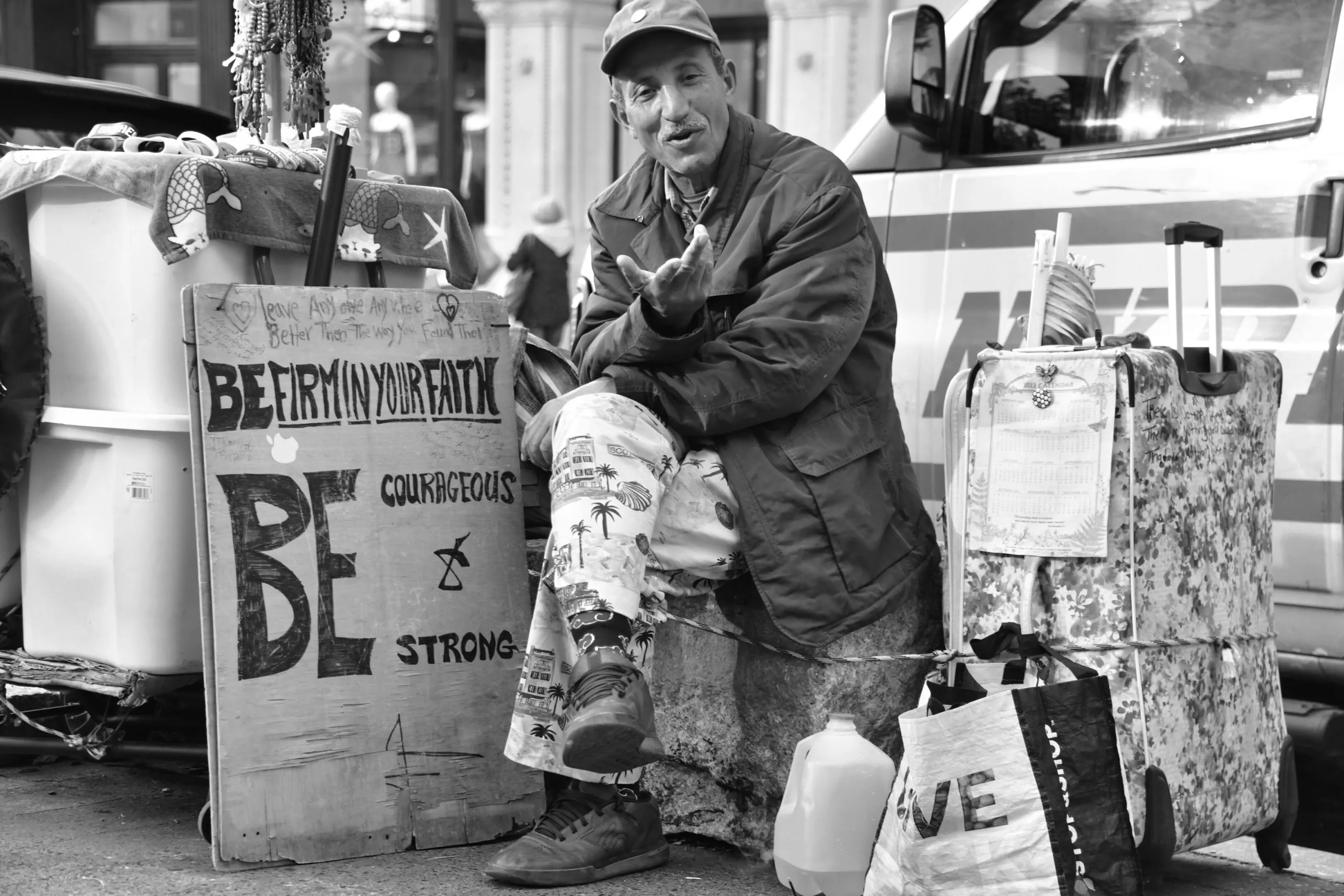 Homeless man sitting on a sidewalk with his belongings in black and white.