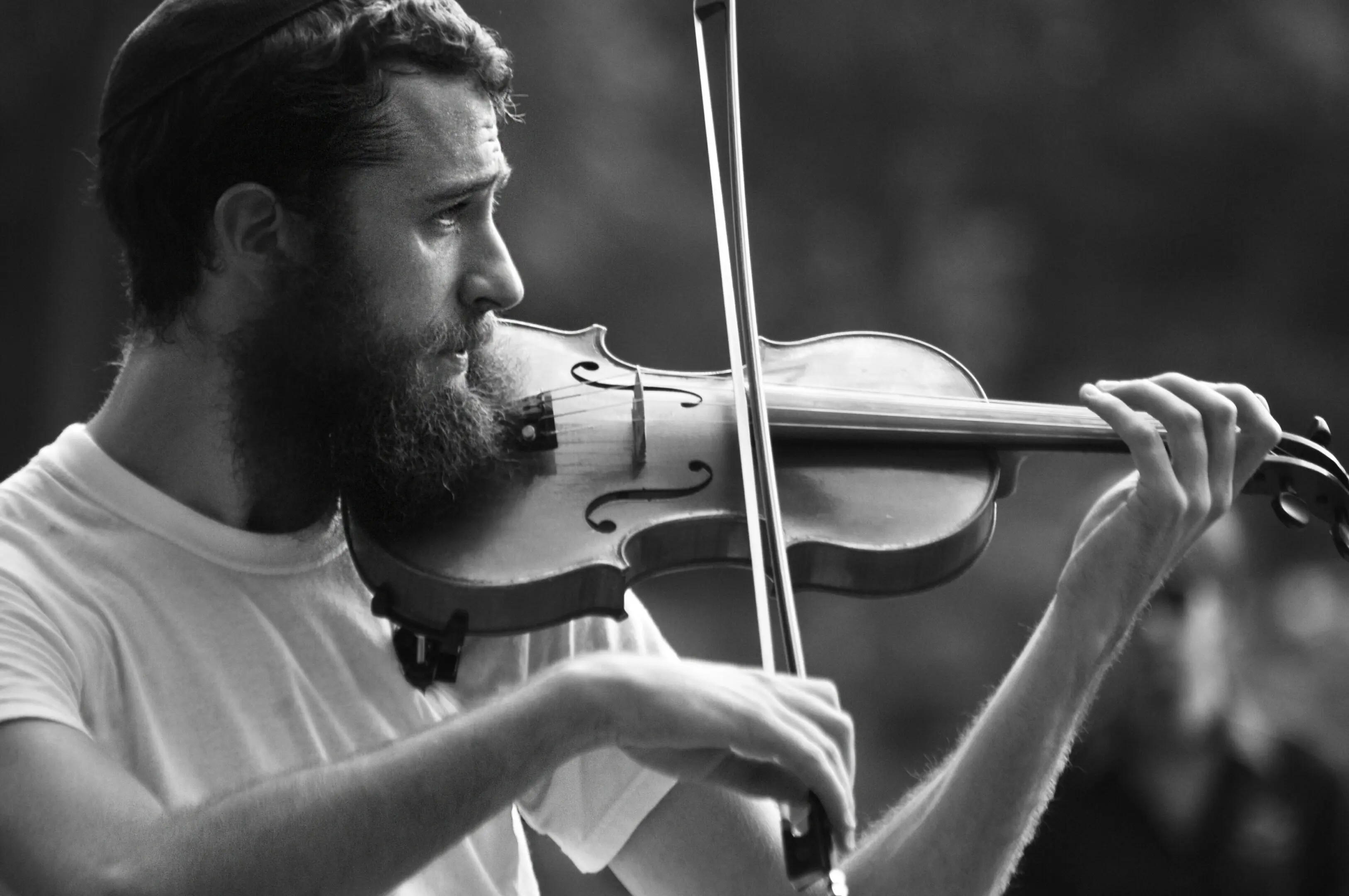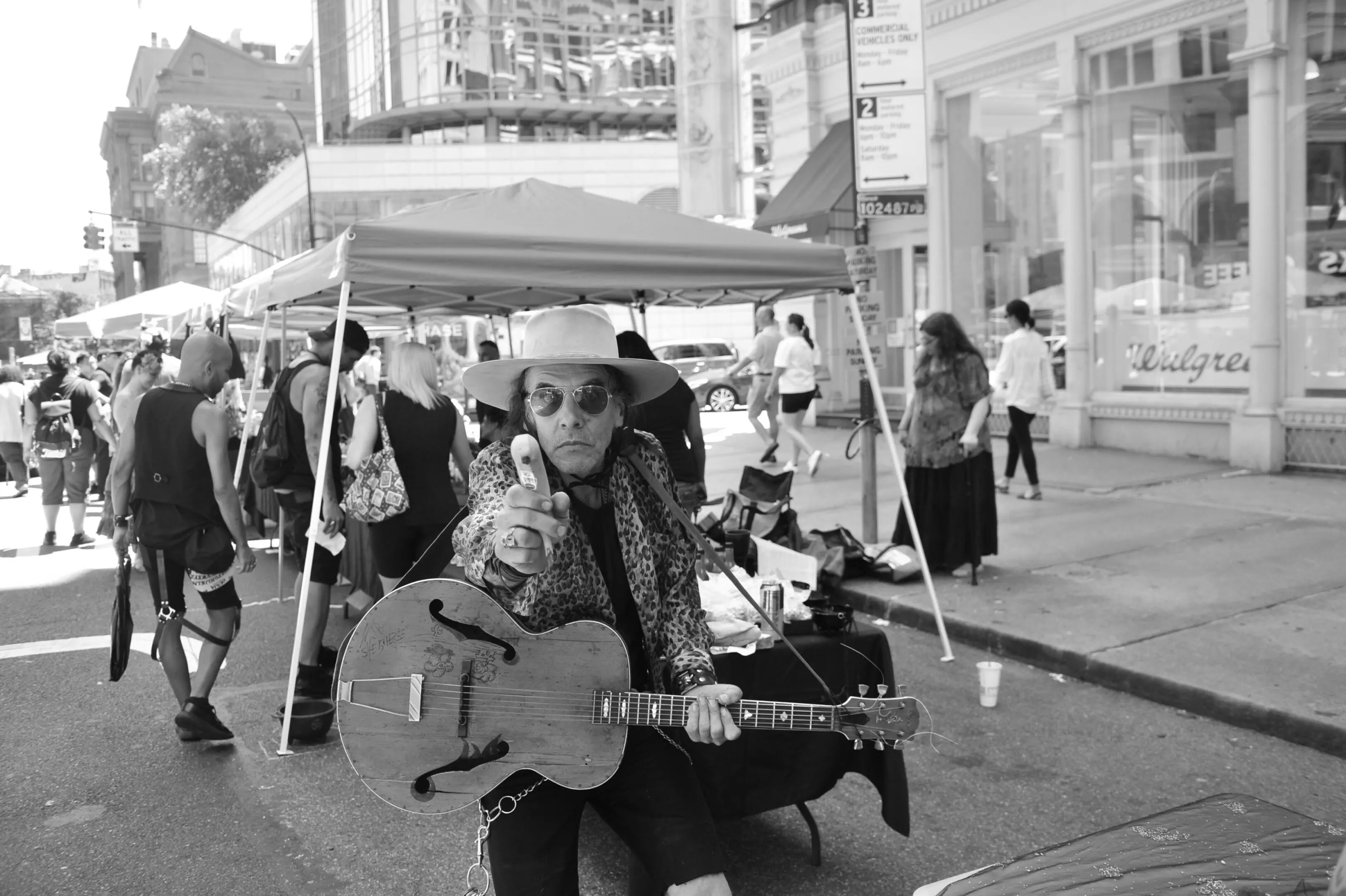Street musician playing guitar under an umbrella on a busy sidewalk.