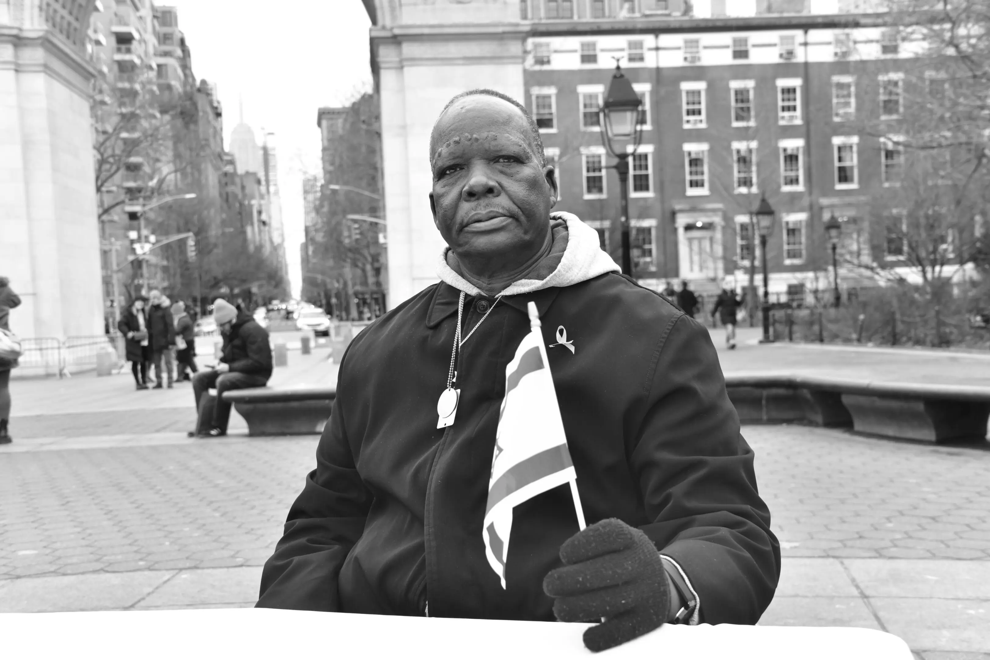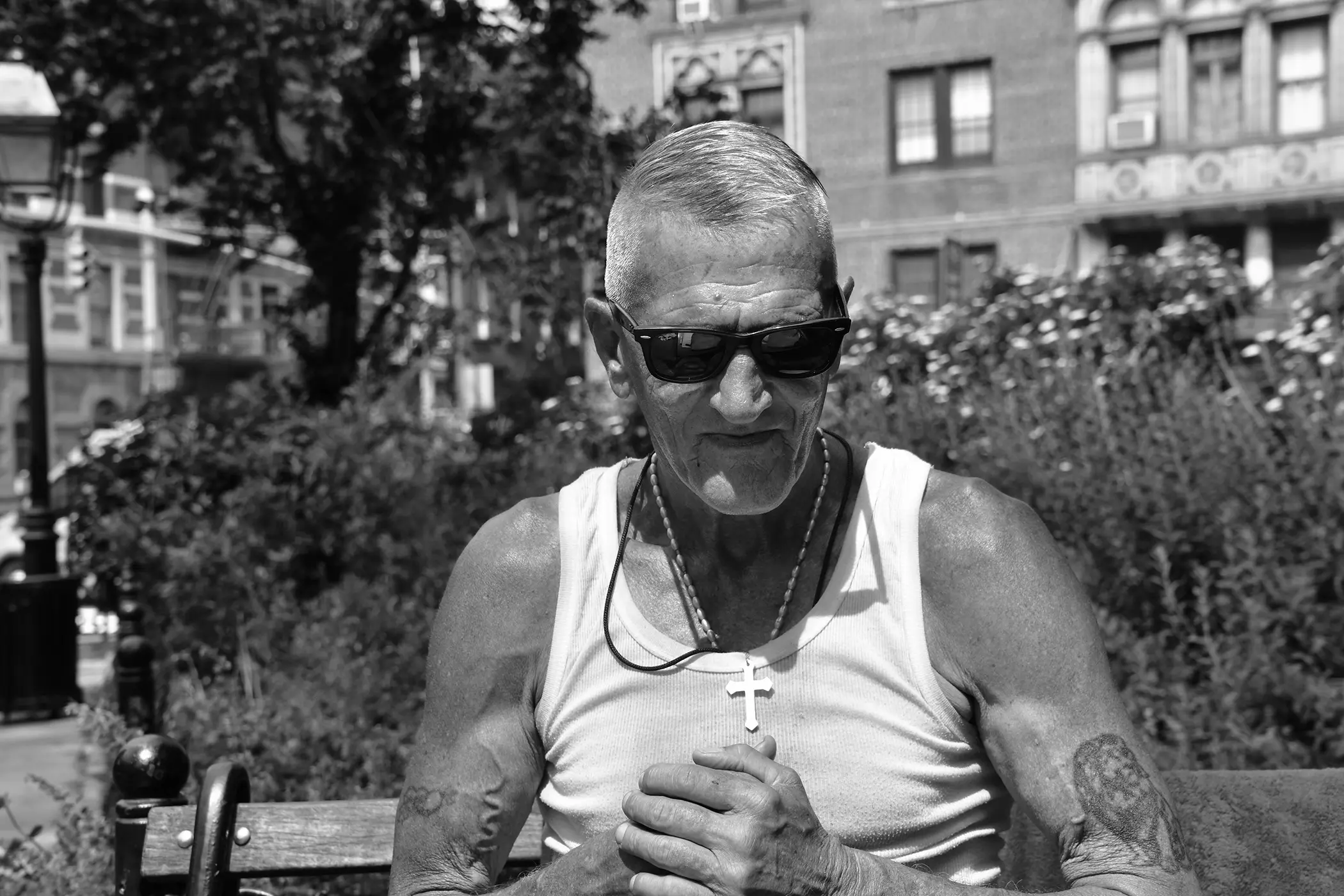 An elderly man wearing a scarf sits outdoors in a city setting.
