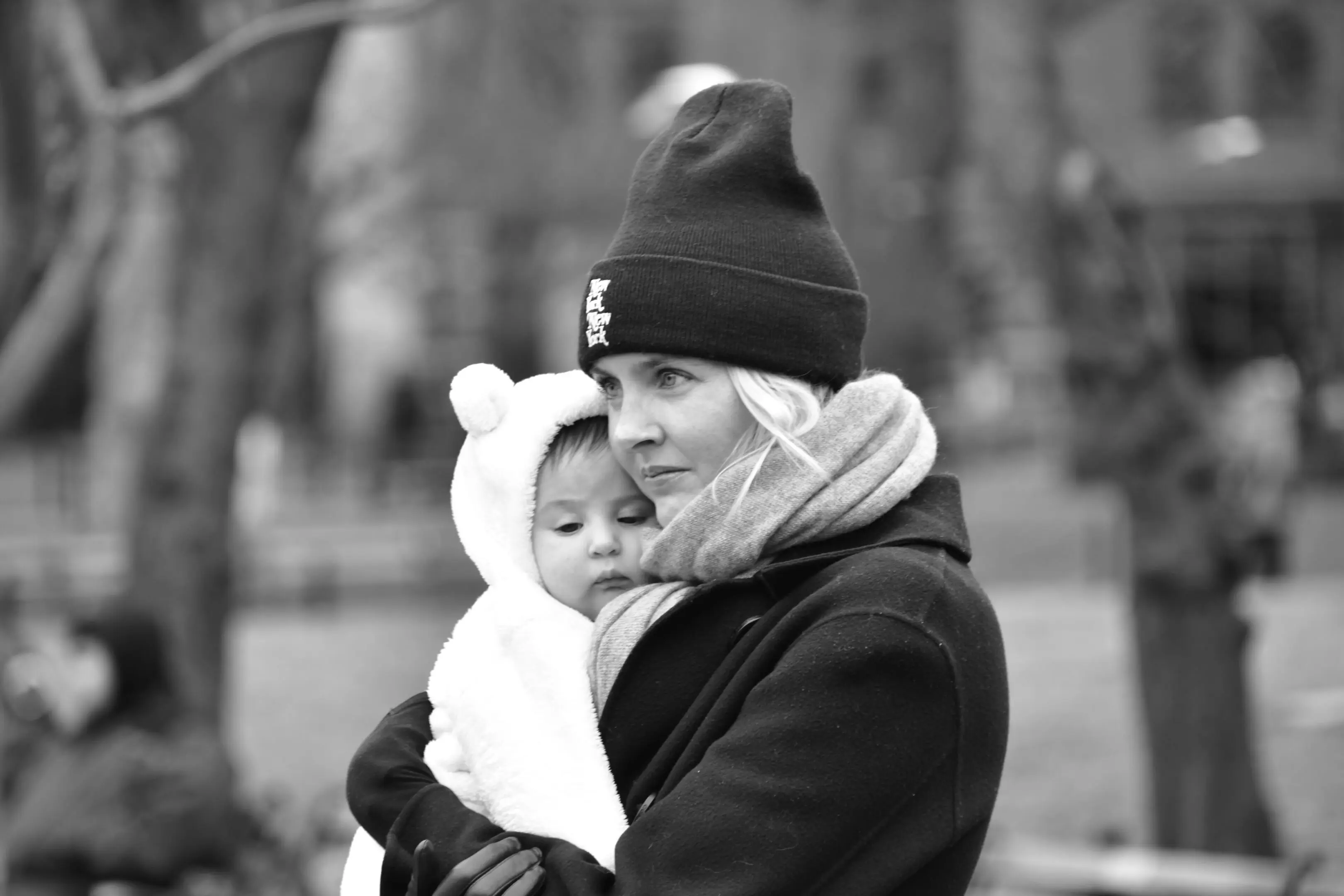 A woman sitting, holding a child wrapped in a blanket on her lap.