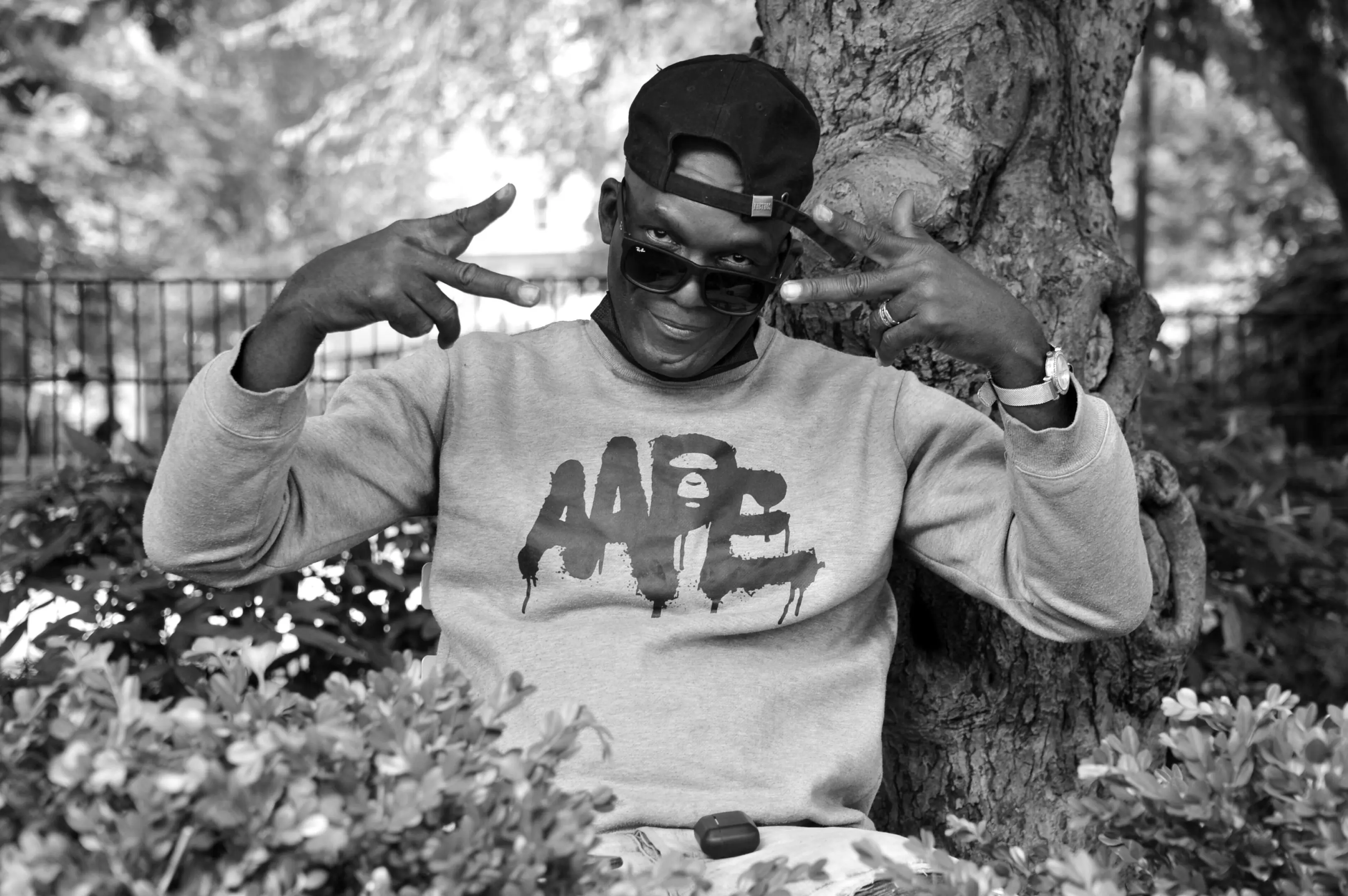 Black and white portrait of an elderly man leaning against a brick wall, smiling gently.