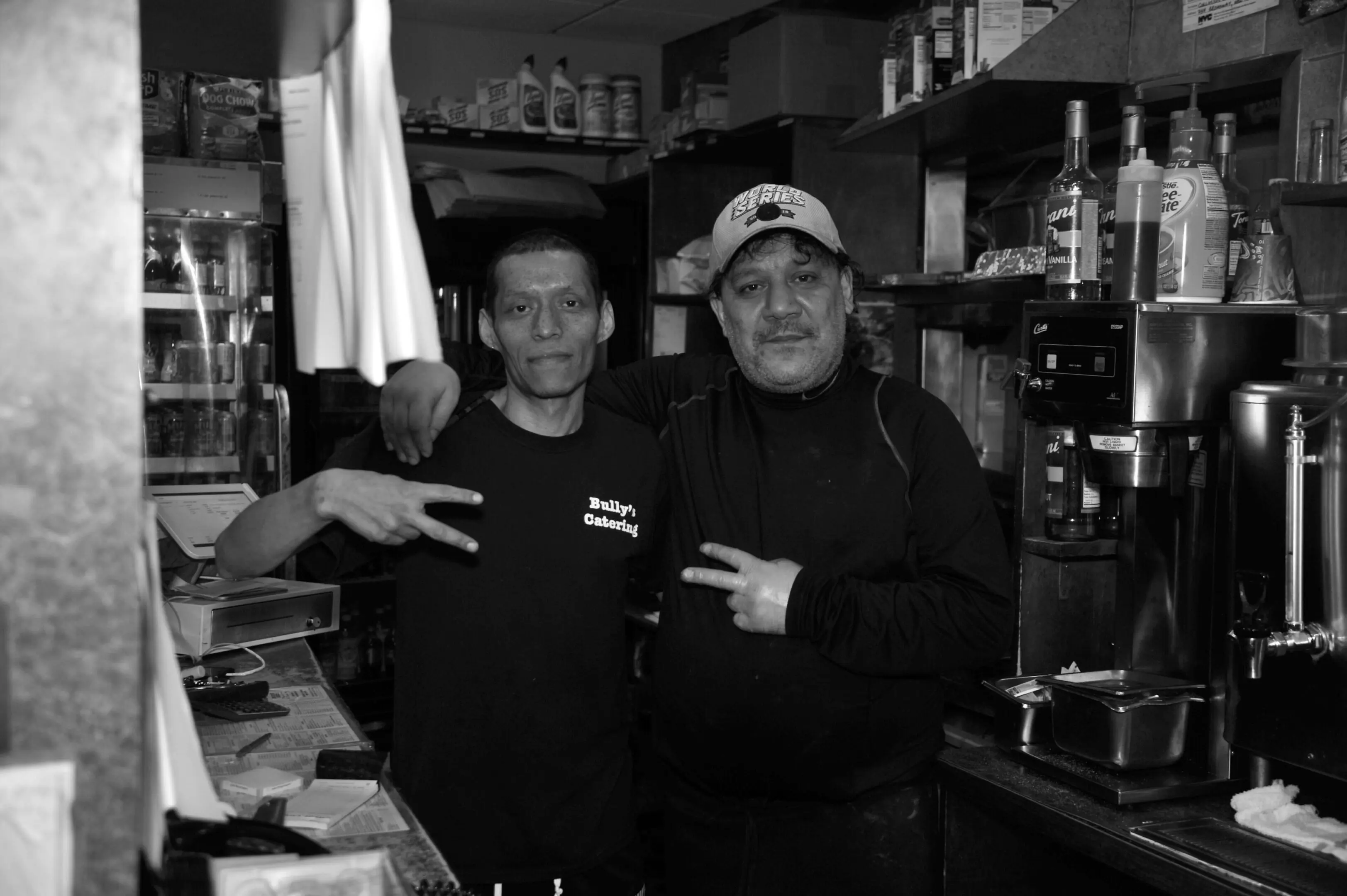 Two men posing with peace signs in a cozy kitchen or workshop.