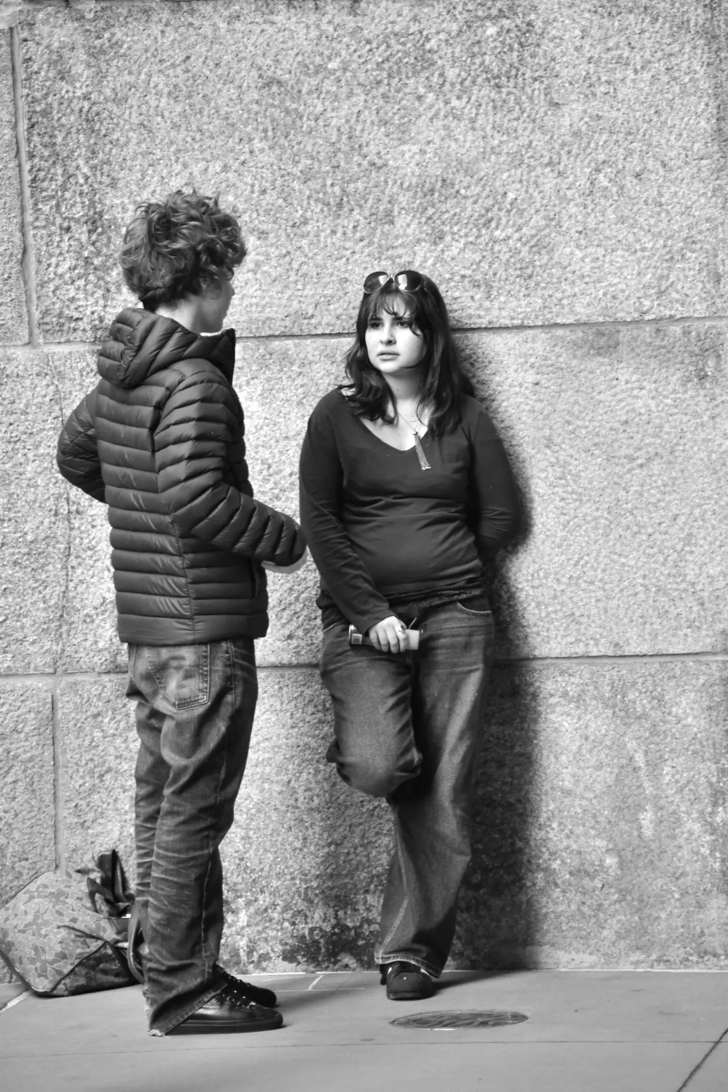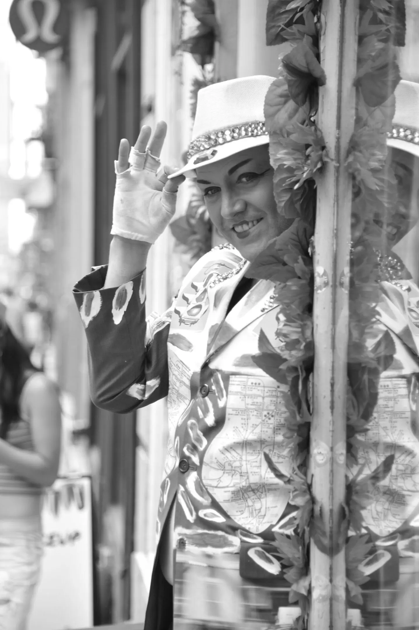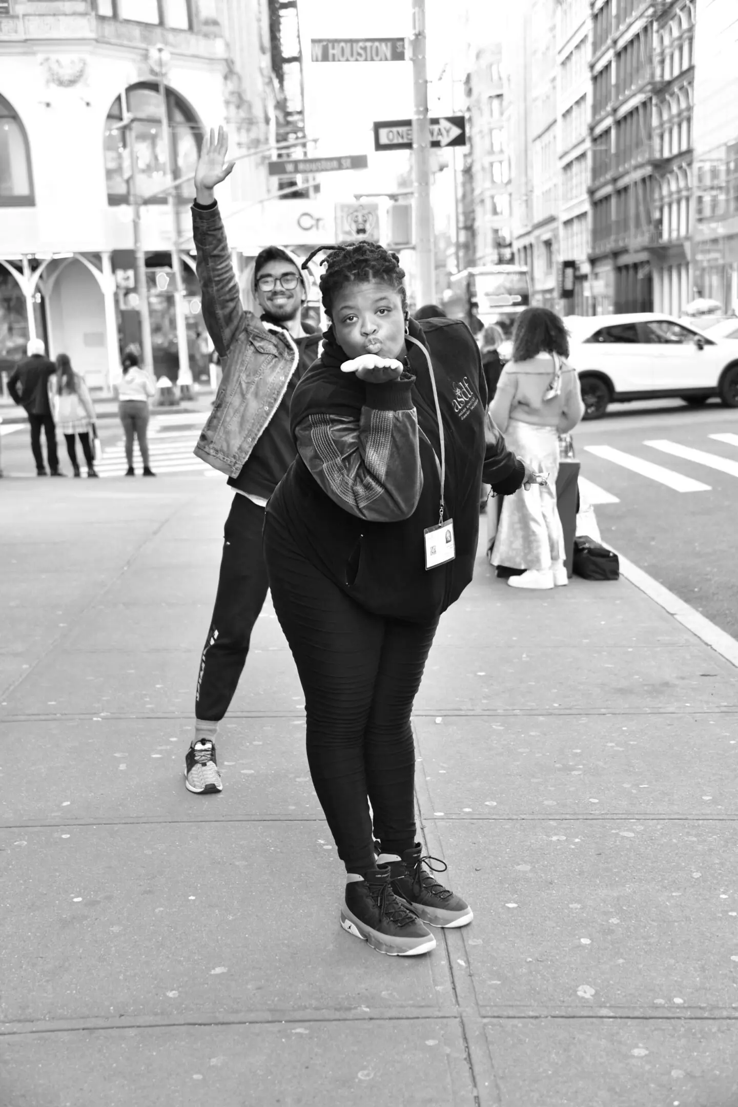 Two women walking on a city sidewalk, one raising her arm joyfully.