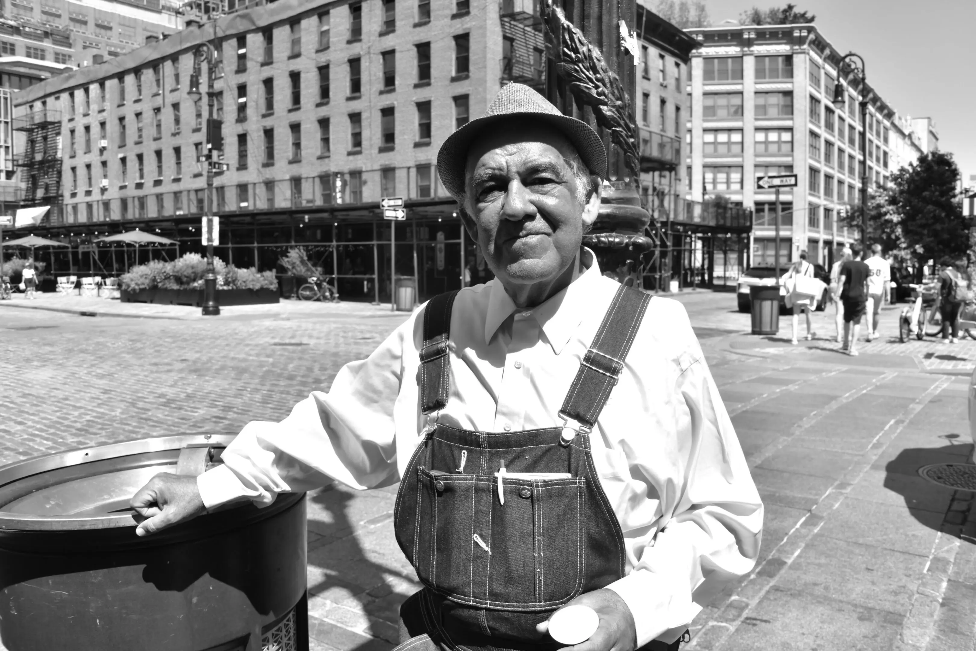 Elderly man in overalls and cap smiling outdoors in a city square.